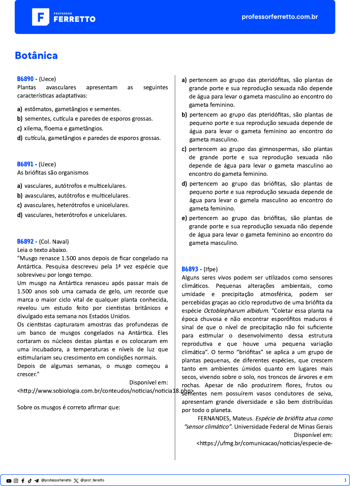 Botânica B6890 - (Uece) Plantas avasculares apresentam as seguintes características adaptativas: a) estômatos, gametângios e sementes. b) sementes, cutícula e paredes de esporos grossas. c) xilema, floema e gametângios. d) cutícula, gametângios e paredes de esporos grossas. B6891 - (Uece) As briófitas são organismos a) vasculares, autótrofos e multicelulares. b) avasculares, autótrofos e multicelulares. c) avasculares, heterótrofos e unicelulares. d) vasculares, heterótrofos e unicelulares. B6892 - (Col. Naval) Leia o texto abaixo. "Musgo renasce 1.500 anos depois de ficar congelado na Antártica. Pesquisa descreveu pela 1ª vez espécie que sobreviveu por longo tempo. Um musgo na Antártica renasceu após passar mais de 1.500 anos sob uma camada de gelo, um recorde que marca o maior ciclo vital de qualquer planta conhecida, revelou um estudo feito por cientistas britânicos e divulgado esta semana nos Estados Unidos. Os cientistas capturaram amostras das profundezas de um banco de musgos congelados na Antártica. Eles cortaram os núcleos destas plantas e os colocaram em uma incubadora, a temperaturas e níveis de luz que estimulariam seu crescimento em condições normais. Depois de algumas semanas, o musgo começou a crescer." Disponível em: Sobre os musgos é correto afirmar que: a) pertencem ao grupo das pteridófitas, são plantas de grande porte e sua reprodução sexuada não depende de água para levar o gameta masculino ao encontro do gameta feminino. b) pertencem ao grupo das pteridófitas, são plantas de pequeno porte e sua reprodução sexuada depende de água para levar o gameta feminino ao encontro do gameta masculino. c) pertencem ao grupo das gimnospermas, são plantas de grande porte e sua reprodução sexuada não depende de água para levar o gameta masculino ao encontro do gameta feminino. d) pertencem ao grupo das briófitas, são plantas de pequeno porte e sua reprodução sexuada depende de água para levar o gamela masculino ao encontro do gameta feminino. e) pertencem ao grupo das briófitas, são plantas de grande porte e sua reprodução sexuada não depende de água para levar o gameta feminino ao encontro do gameta masculino. B6893 - (Ifpe) Alguns seres vivos podem ser utilizados como sensores climáticos. Pequenas alterações ambientais, como umidade e precipitação atmosférica, podem ser percebidas graças ao ciclo reprodutivo de uma briófita da espécie Octoblepharum albidum. “Coletar essa planta na época chuvosa e não encontrar esporófitos maduros é sinal de que o nível de precipitação não foi suficiente para estimular o desenvolvimento dessa estrutura reprodutiva e que houve uma pequena variação climática”. O termo “briófitas” se aplica a um grupo de plantas pequenas, de diferentes espécies, que crescem tanto em ambientes úmidos quanto em lugares mais secos, vivendo sobre o solo, nos troncos de árvores e em rochas. Apesar de não produzirem flores, frutos ou sementes nem possuírem vasos condutores de seiva, apresentam grande diversidade e são bem distribuídas por todo o planeta. FERNANDES, Mateus. Espécie de briófita atua como “sensor climático”. Universidade Federal de Minas Gerais Disponível em: . Acesso em: 09 out. 2018 (adaptado). De acordo com as características descritas no texto, é CORRETO afirmar que também pertencem ao mesmo grupo da Octoblepharum albidumi a) os musgos. b) as avencas. c) os pinheiros. d) as samambaias. e) as suculentas. B6894 - (Utfpr) A respeito das plantas, assinale a alternativa correta. a) Organismos quimiossintetizantes microscópicos fazem parte desse grupo. b) Pteridófitas são totalmente adaptadas a ambientes terrestres e secos. c) Flor e fruto estão presentes no grupo das gimnospermas e angiospermas. d) Musgos e hepáticas são exemplos de pteridófitas. e) Briófitas são dependentes de ambientes úmidos para sua reprodução. B6895 - (Utfpr) A respeito das plantas, assinale a alternativa correta. a) Organismos quimiossintetizantes microscópicos fazem parte desse grupo. b) Pteridófitas são totalmente adaptadas a ambientes terrestres e secos. c) Flor e fruto estão presentes no grupo das gimnospermas e angiospermas. d) Musgos e hepáticas são exemplos de pteridófitas. e) Briófitas são dependentes de ambientes úmidos para sua reprodução. B6896 - (Ufjf) Ao caminhar pela sua cidade, um estudante do ensino médio observou as seguintes plantas: I. Musgo II. Samambaia III. Pinheiro IV. Goiabeira V. Ipê-amarelo Após analisá-las, fez as afirmações abaixo. Assinale a opção com a alternativa CORRETA: a) apenas uma dessas plantas não apresenta raiz, caule e folhas diferenciadas. b) apenas duas dessas plantas não apresentam tecidos condutores de seiva. c) apenas duas dessas plantas apresentam sementes. d) apenas duas dessas plantas apresentam processos de polinização. e) apenas uma dessas plantas apresenta fruto. B6897 - (Ifce) Sobre os grupos de plantas, é correto afirmar que a) o grupo das gimnospermas reúne plantas que possuem sementes e vasos condutores de seiva. b) as briófitas apresentam vasos condutores de seiva apesar de seu pequeno porte. c) o grupo das pteridófitas abrange plantas avasculares que não possuem sementes. d) o grupo das pteridófitas apresenta características semelhantes às angiospermas, com exceção do fato de as pteridófitas possuírem sementes e as angiospermas não. e) as angiospermas são as representantes mais primitivas das plantas, desta forma, ainda necessitam de água para reprodução. B6898 - (Ifba) Musgos são plantas extremamente pequenas, não ultrapassando a altura de poucos centímetros. Estas plantas parecem formar um tapete verde nos troncos de árvores, em folhas ou em rochas. Diferente do que descrevem histórias de ficção científica, musgos gigantes não poderiam ocorrer de fato na realidade. Escolha a alternativa que descreve o motivo que impede esses seres de atingirem grandes tamanhos. a) Lent