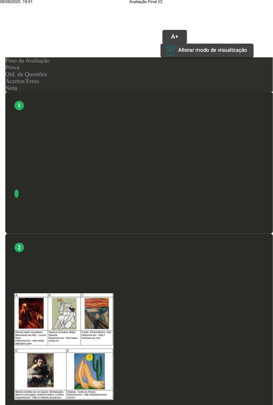 Prova Impressa GABARITO | Avaliação Final (Objetiva) - Individual (Cod.:745178) Peso da Avaliação 3,00 Prova 51482267 Qtd. de Questões 12 Acertos/Erros 11/1 Nota 10,00 A globalização está amparada, principalmente, nos avanços tecnológicos, assim como nas relações sociais e econômicas, no mercado da conectividade e da virtualidade. É abordada como sendo a responsável por alterar a forma de comunicação entre as pessoas. No entanto, também pode proporcionar tanto a inclusão como a desigualdade social. Sobre a globalização, assinale a alternativa INCORRETA: A A globalização é capaz de favorecer a intercomunicação entre povos e as pessoas das mais diferentes e inusitadas regiões do planeta. B A globalização favorece a formação de grupos regionais, como o MERCOSUL, sendo capaz de conferir aos seus membros uma melhor possibilidade de negociação e barganhas no jogo das relações que se dão no cenário mundial. C A globalização contribui para resgatar os processos de produção tradicionais, humanizando os desejos de consumo, os estilos de vida e as culturas, valorizando cada vez mais as diferenças, identidades, as especificidades e as tradições locais e regionais. D A globalização pode diminuir as fronteiras no campo dos transportes e promover intercâmbios nas atividades de comunicação e informações. (ENADE, 2008) O filósofo alemão Friedrich Nietzsche (1844-1900), talvez o pensador moderno mais incômodo e provocativo, influenciou várias gerações e movimentos artísticos. O Expressionismo, que teve forte influência desse filósofo, contribuiu para o pensamento contrário ao racionalismo moderno e ao trabalho mecânico, através do embate entre a razão e a fantasia. As obras desse movimento deixam de priorizar o padrão de beleza tradicional para enfocar a instabilidade da vida, marcada por angústia, dor, inadequação do artista diante da realidade. Das obras a seguir, a que reflete esse enfoque artístico é: VOLTAR A+ Alterar modo de visualização 1 2 08/08/2025, 19:01 Avaliação Final (Objetiva) - Individual about:blank 1/6 A Figura D. B Figura C. C Figura A. D Figura B. O saneamento básico é constituído de infraestruturas para oferecer melhores condições de vida para a população e fornecer recursos hídricos de boa qualidade, em contrapartida do pagamento de taxas pela população. Sobre as doenças causadas pela ausência desse saneamento, analise as seguintes afirmativas: I- Cólera, hepatite infecciosa e febre tifoide são doenças relacionadas com a água. II- Disenteria bacilar, diarreias e febre tifoide são doenças relacionadas com a água. III- Diarreias, infecções de pele e olhos e infecções causadas por piolhos são doenças relacionadas com a falta de higiene pessoal e doméstica. IV- Infecções causadas por piolhos, cólera e febre tifoide são doenças relacionadas pela falta de higiene pessoal e doméstica. Agora, assinale a alternativa CORRETA: A Somente a afirmativa IV está correta. B As afirmativas II e III estão corretas. C As afirmativas I e III estão corretas. D Somente a afirmativa III está correta. Um sistema de produção industrial contempla a descentralização do poder e a formação de redes de trabalho, a diferenciação da produção, o forte controle da produção, a qualificação constante dos trabalhadores, com mão de obra multifuncional e bem qualificada, envolvendo trabalhadores treinados e qualificados para conhecer todos os processos de produção, com um sistema flexível de mecanização, voltado para a produção somente do necessário, evitando ao máximo o excedente. Sobre como é conhecido esse sistema, assinale a alternativa CORRETA: A Terceirização. B Trabalho informal. C Toyotismo. D Fordismo. (ENADE, 2016) Em janeiro de 2016, entrou em vigor a Lei Brasileira de Inclusão da Pessoa com Deficiência (LBI), instrumento que garante mais direitos às pessoas com deficiência e prevê 3 4 5 08/08/2025, 19:01 Avaliação Final (Objetiva) - Individual about:blank 2/6 punições para atos de discriminação. A Lei destaca a importância de estratégias de inclusão e de superação de barreiras oriundas de deficiência. Um exemplo de superação e inclusão é a atuação do atleta paralímpico Daniel Dias. O nadador, que nasceu no dia 24 de maio de 1988, sem partes de alguns membros, conquistou, aos 28 anos de idade, sua 24ª medalha, das quais 14 de ouro, sendo nove conquistadas nas Paralímpiadas do Rio de Janeiro. Orgulho para os brasileiros. Considerando o texto apresentado, avalie as afirmações a seguir, relativas à inclusão de pessoas com deficiência: I- O esporte, para ser inclusivo, requer prática orientada para cada tipo de deficiência. II- Na prática esportiva orientada, metas e objetivos são estabelecidos como ferramentas motivacionais, a fim de promover ganhos motores e cognitivos à pessoa com deficiência. III- A LBI foi fundamental para a inclusão de Daniel Dias, que se tornou o melhor nadador paralímpico da história. Assinale a alternativa CORRETA: A II, apenas. B III, apenas. C I e II, apenas. D I e III, apenas. Mundialmente falando, buscamos formas de desenvolvimento sustentável a todo e qualquer custo. Algumas experiências aceitáveis vêm de encontro às estratégias delimitadas de forma interdisciplinar, em que diversos processos estão interligados. Todavia, os problemas ambientais ainda tomam conta da preocupação da sociedade, que objetiva resultados satisfatórios.Sobre as causas de problemas ambientais, analise as sentenças a seguir: I- As suas causas principais devem ser: crescimento desordenado da população e utilização dos recursos de forma insustentável. II- Ausência de consciência ambiental por grande parte dos tomadores de decisões políticas. III- Modelo econômico de redistribuição de renda, com foco nas formas igualitárias de faixas salariais. IV- A produção sustentável dos alimentos provenientes da terra, com bas