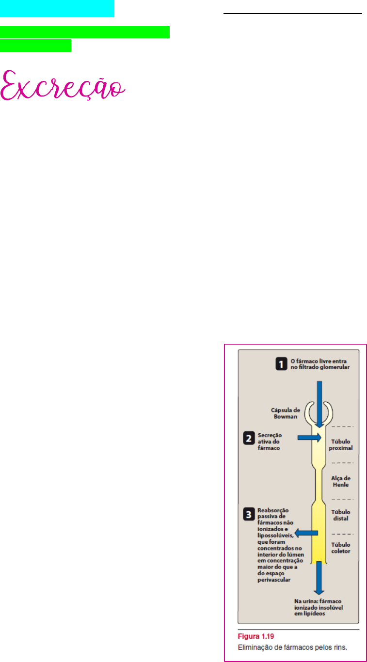 FARMACOLOGIA ELIMINAÇÃO DE FÁRMACOS E SEUS METABÓLITOS DEPURAÇÃO DE FÁRMACOS PELOS RINS Os fármacos devem ser suficientemente polares para serem eliminados do organismo. A saída do fármaco do organismo ocorre por numerosas vias, sendo a eliminação na urina por meio dos rins a mais importante. E o rim o órgão mais importante. Os fluidos biológicos de uma maneira geral, como lágrimas, suor, leite ... Pacientes com disfunção renal podem ser incapazes de excretar os fármacos, ficando sujeitos ao risco de acumulá-los e apresentar efeitos adversos. FINALIZAR O EFEITO: Os efeitos de um fármaco desaparecem quando ela é totalmente eliminada, ou é transformada em metabólitos sem efeitos/ atividades biológicos. ELIMINAÇÃO RENAL DOS FÁRMACOS A eliminação de fármacos pelos rins na urina envolve os processos de filtração glomerular, secreção tubular ativa e reabsorção tubular passiva. FILTRAÇÃO GLOMERULAR - Os fármacos chegam aos rins pelas artérias renais, que se dividem para formar o plexo capilar glomerular. - O fármaco livre (não ligado à albumina) difunde-se através das fendas capilares para o espaço de Bowman como parte do filtrado glomerular. - A velocidade de filtração glomerular (VFG) em geral é de 125 mL/min, mas pode diminuir significativamente na doença renal. - A lipossolubilidade e o pH não influenciam a passagem dos fármacos para o filtrado glomerular. Contudo, variações na VFG e a ligação dos fármacos às proteínas afetam esse processo. SECREÇÃO TUBULAR PROXIMAL - Os fármacos que não foram transferidos para o filtrado glomerular saem dos glomérulos através das arteríolas eferentes, que se dividem formando um plexo capilar ao redor do lúmen no túbulo proximal. - A secreção ocorre primariamente nos túbulos proximais por dois mecanismos de transporte ativo que exigem energia: um para ânions (p. ex., formas desprotonadas de ácidos fracos) e outro para cátions (p. ex., formas protonadas de bases fracas). - Cada um desses sistemas de transporte apresenta baixa especificidade e pode transportar vários compostos. Assim, pode ocorrer competição entre fármacos pelos transportadores em cada um dos sistemas. (Nota: prematuros e recém- nascidos não têm esse mecanismo secretor tubular completamente desenvolvido e, assim, podem reter certos fármacos no filtrado glomerular.) REAÇÃO TUBULAR DISTAL - Enquanto o fármaco se desloca em direção ao túbulo contorcido distal, sua concentração aumenta e excede à do espaço perivascular. - O fármaco, se for neutro, pode difundir-se para fora do lúmen, retornando à circulação sistêmica. - A manipulação do pH da urina, para aumentar a fração ionizada do fármaco no lúmen, pode ser feita para minimizar a retrodifusão e, assim, aumentar a depuração de um fármaco indesejável. - Como regra geral, ácidos fracos podem ser eliminados alcalinizando a urina, ao passo que a eliminação de bases fracas pode ser aumentada por acidificação da urina. - Esse processo é denominado prisão iônica. Por exemplo, um paciente apresentando dose excessiva de fenobarbital (um ácido fraco) pode receber bicarbonato, que alcaliniza a urina e mantém o fármaco ionizado, diminuindo, assim, a sua reabsorção. PAPEL DA BIOTRANSFORMAÇÃO DE FÁRMACOS - A maioria dos fármacos é lipossolúvel e, sem modificação química, se difundiria para fora do lúmen tubular renal quando a sua concentração no filtrado se tornasse maior do que a do espaço perivascular. - Para minimizar essa reabsorção, os fármacos são modificados basicamente no fígado em substâncias mais polares por meio das reações de fase I e fase II (descritas anteriormente). - Os conjugados polares ou ionizados são incapazes de difundir para fora do lúmen renal. DEPURAÇÃO POR OUTRAS VIAS A depuração de fármacos pode ocorrer também por intestinos, bile, pulmões, leite, entre outros. - Os fármacos que não são absorvidos após administração oral ou fármacos que são secretados diretamente para os intestinos ou na bile são eliminados com as fezes. - Os pulmões estão envolvidos primariamente na eliminação dos gases anestésicos (p. ex., isoflurano). - A eliminação de fármacos no leite pode expor a criança lactente aos medicamentos e/ou seus metabólitos ingeridos pela mãe, e é uma fonte potencial de efeitos indesejados na criança. - A excreção da maioria dos fármacos no suor, na saliva, nas lágrimas, nos pelos e na pele ocorre em pequena extensão. - A depuração corporal total e a meia- vida do fármaco são variáveis importantes da sua depuração, sendo usadas para otimizar o tratamento medicamentoso e minimizar a toxicidade. DEPURAÇÃO CORPORAL TOTAL A depuração corporal total (sistêmica), CLtotal, é a soma de todas as depurações dos órgãos biotransformadores e eliminadores. SITUAÇÕES CLÍNICAS QUE ALTERAM A MEIA-VIDA DO FÁRMACO Quando o paciente apresenta uma anormalidade que altera a meia-vida do fármaco, são necessários ajustes na dosagem. Aumento da meia-vida de fármacos: 1) diminuição do fluxo de sangue renal ou hepático (p. ex., choque cardiogênico, insuficiência cardíaca ou hemorragia); 2) diminuição na capacidade de extrair o fármaco do plasma (p. ex., doença renal); e 3) diminuição da biotransformação (p. ex., quando outros fármacos concomitantes inibem a biotransformação, ou na insuficiência hepática, como na cirrose). Nesses pacientes, pode ser necessário diminuir a dosagem ou aumentar o tempo entre as dosificações. Em contraste, a meia-vida de um fármaco pode ser reduzida 1) aumentando o fluxo sanguíneo hepático, 2) diminuindo a ligação às proteínas ou 3) aumentando a biotransformação. Isso pode exigir dosagens maiores ou dosificações mais frequentes. EXCREÇÃO – AULA DA PROFESSORA Indicação de livro: Farmacologia Básica FINALIZAR O EFEITO: Os efeitos de um fármaco desaparecem quando ela é totalmente eliminada. E