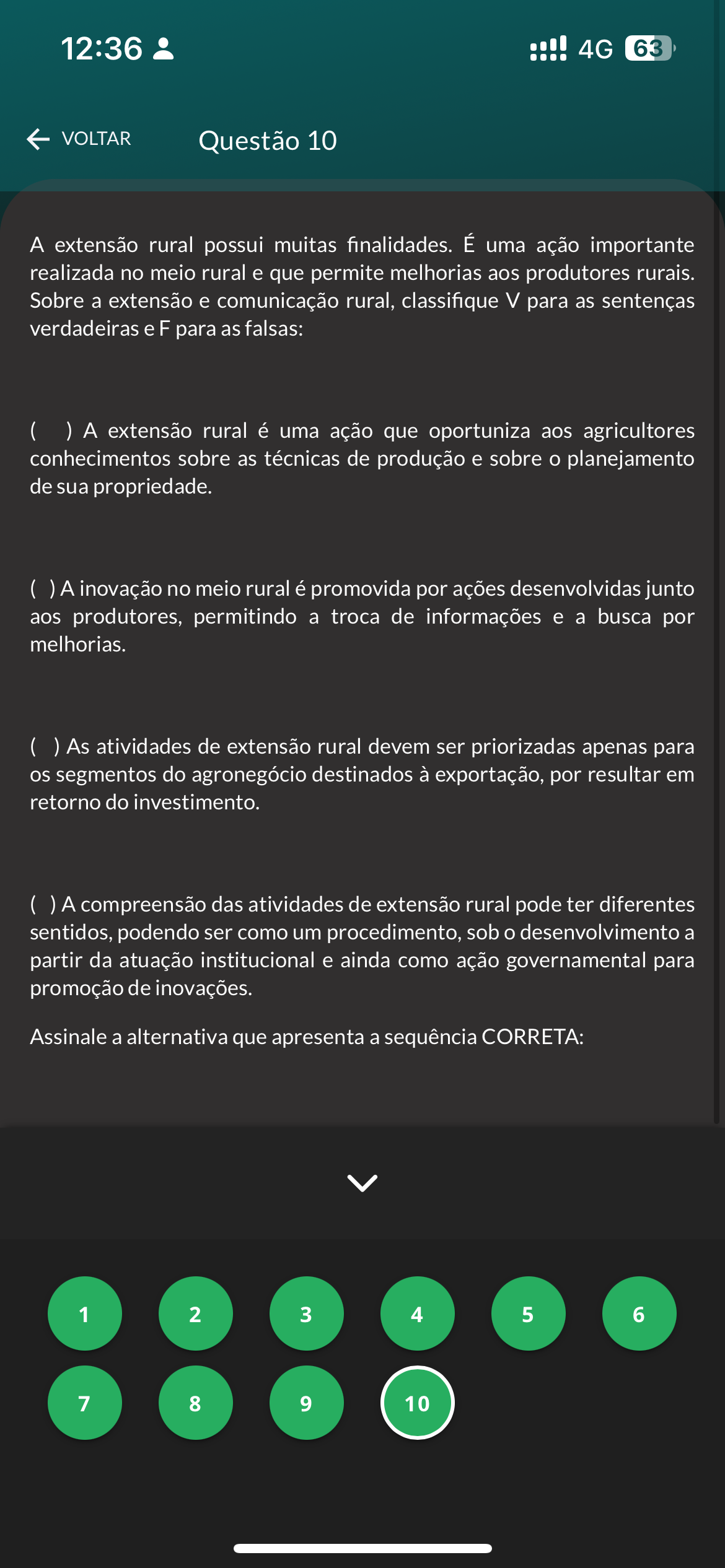 12:36 4G 63 VOLTAR Questão 10 A extensão rural possui muitas finalidades. É uma ação importante realizada no meio rural e que permite melhorias aos produtores rurais. Sobre a extensão e comunicação rural, classifique V para as sentenças verdadeiras e F para as falsas: ( ) A extensão rural é uma ação que oportuniza aos agricultores conhecimentos sobre as técnicas de produção e sobre planejamento de sua propriedade. A inovação no meio rural é promovida por ações desenvolvidas junto aos produtores, permitindo a troca de informações e a busca por melhorias. As atividades de extensão rural devem ser priorizadas apenas para os segmentos do agronegócio destinados à exportação, por resultar em retorno do investimento. A compreensão das atividades de extensão rural pode ter diferentes sentidos, podendo ser como um procedimento, sob desenvolvimento a partir da atuação institucional e ainda como ação governamental para promoção de inovações. Assinale a alternativa que apresenta a sequência CORRETA: 1 2 3 4 5 6 7 8 9 10