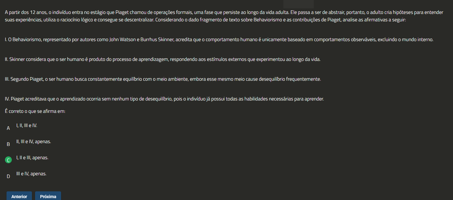 A partir dos 12 anos, 0 indivíduo entra no estágio que Piaget chamou de operações formais, uma fase que persiste ao longo da vida adulta. Ele passa a ser de abstrair, portanto, 0 adulto cria hipóteses para entender suas experiências, utiliza 0 raciocínio lógico e consegue se descentralizar. Considerando 0 dado fragmento de texto sobre Behaviorismo e as contribuições de Piaget, analise as afirmativas a seguir: I. 0 Behaviorismo, representado por autores como John Watson e Burrhus Skinner, acredita que 0 comportamento humano é unicamente baseado em comportamentos observáveis, excluindo 0 mundo interno. II. Skinner considera que ser humano é produto do processo de aprendizagem, respondendo aos estímulos externos que experimentou ao longo da vida. III. Segundo Piaget, 0 ser humano busca constantemente equilíbrio com 0 meio ambiente, embora esse mesmo meio cause desequilibrio frequentemente. IV. Piaget acreditava que 0 aprendizado ocorria sem nenhum tipo de pois 0 indivíduo já possui todas as habilidades necessárias para aprender. É correto 0 que se afirma em: A I, II, III e IV. II, III e IV, apenas. I, II e III, apenas. D III e IV, apenas. Anterior Próxima