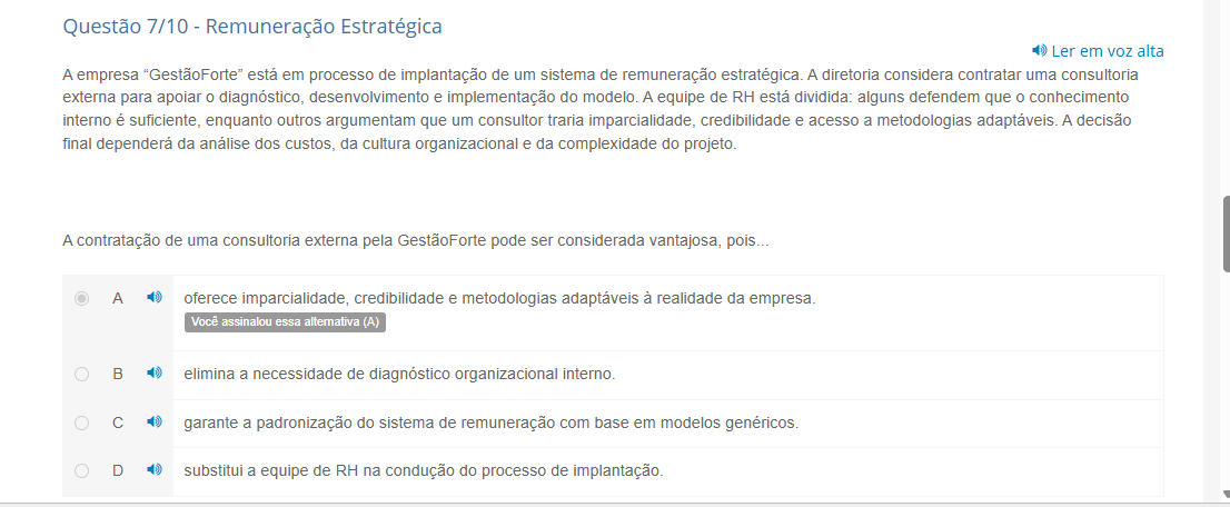 Questão 7/10 Remuneração Estratégica Ler em voz alta A empresa "GestãoForte" está em processo de implantação de um sistema de remuneração estratégica. A diretoria considera contratar uma consultoria para apoiar diagnóstico, desenvolvimento e implementação do modelo. A equipe de RH está dividida: alguns defendem que 0 conhecimento interno é suficiente, enquanto outros argumentam que um consultor traria imparcialidade, credibilidade e acesso a metodologias adaptáveis. A decisão final dependerá da análise dos custos, da cultura organizacional e da complexidade do projeto. A contratação de uma consultoria externa pela GestãoForte pode ser considerada vantajosa, pois... A oferece imparcialidade, credibilidade e metodologias adaptáveis à realidade da empresa. Você assinalou essa alternativa (A) B elimina a necessidade de diagnóstico organizacional interno. C garante a padronização do sistema de remuneração com base em modelos genéricos. D substitui a equipe de RH na condução do processo de implantação.