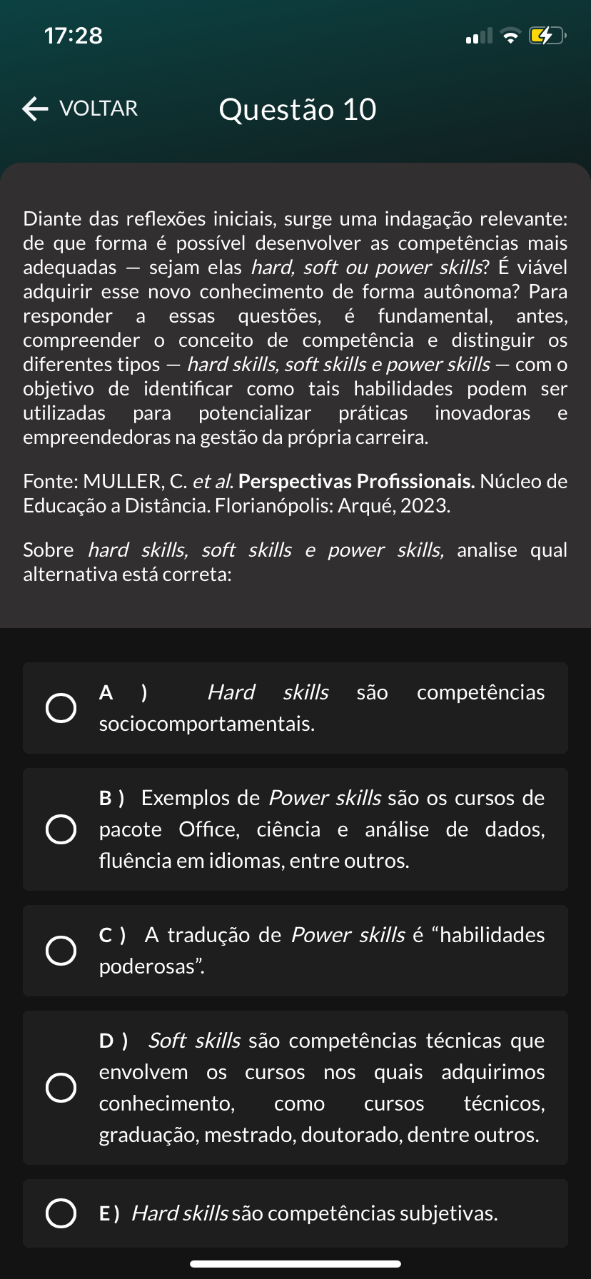 17:28 VOLTAR Questão 10 Diante das reflexões iniciais, surge uma indagação relevante: de que forma é possível desenvolver as competências mais adequadas sejam elas hard, soft ou power skills? É viável adquirir esse novo conhecimento de forma autônoma? Para responder a essas questões, é fundamental, antes, compreender o conceito de competência e distinguir os diferentes tipos hard skills, soft skills e power skills - com o objetivo de identificar como tais habilidades podem ser utilizadas para potencializar práticas inovadoras e empreendedoras na gestão da própria carreira. Fonte: MULLER, et al. Perspectivas Profissionais. Núcleo de Educação a Distância. Florianópolis: Arqué, 2023. Sobre hard skills, soft skills e power skills, analise qual alternativa está correta: A ) Hard skills são competências sociocomportamentais. B) Exemplos de Power skills são os cursos de pacote Office, ciência e análise de dados, fluência em idiomas, entre outros. C) A tradução de Power skills é "habilidades poderosas". Soft skills são competências técnicas que envolvem os cursos nos quais adquirimos conhecimento, como cursos técnicos, graduação, mestrado, doutorado, dentre outros. E) Hard skills são competências subjetivas.