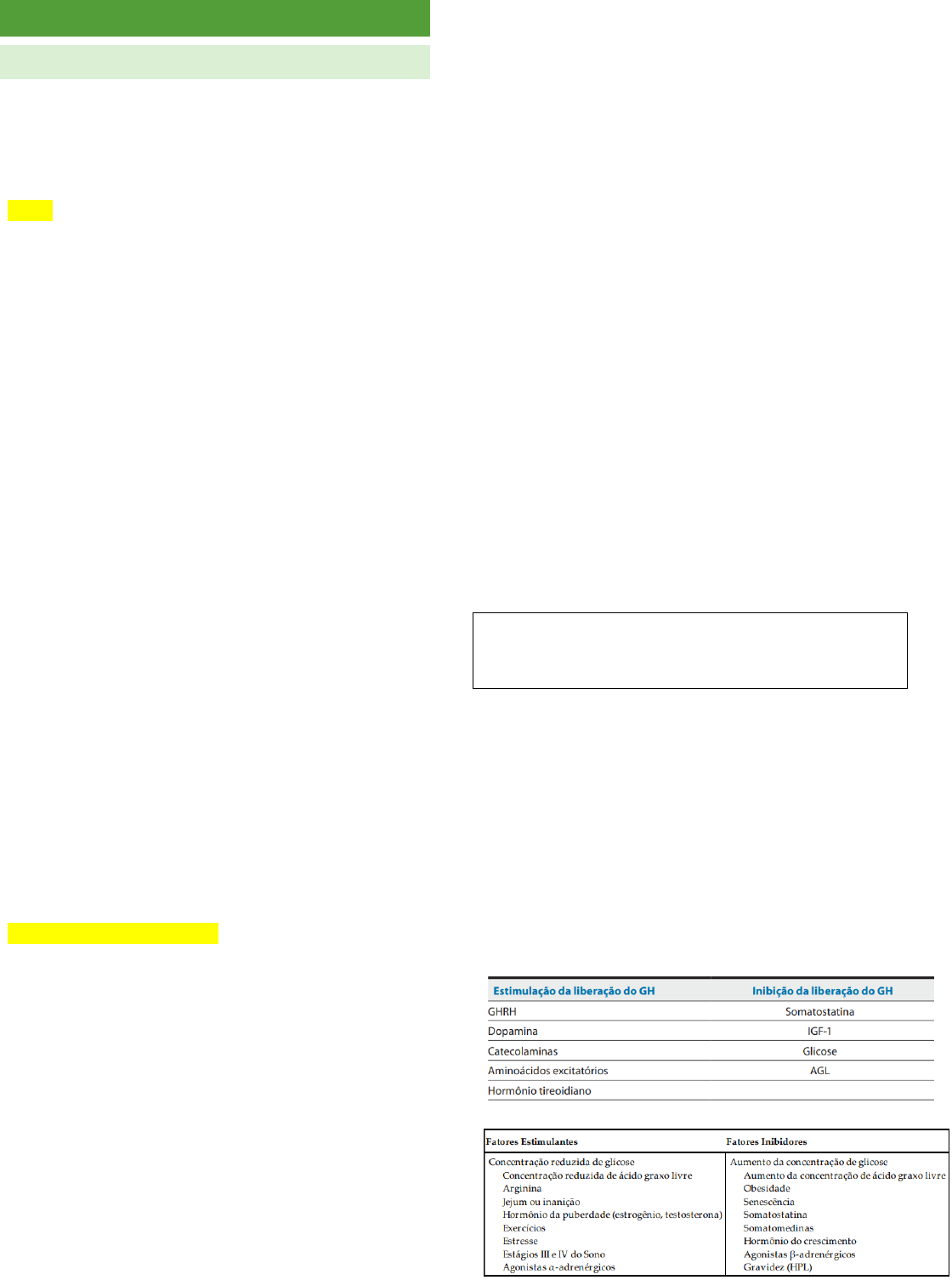 Laíse Weis ;) Problema 5 – Módulo 10 1 GH EIXO HIPOTÁLAMO-HIPÓFISE-ÓRGÃOS - Os dois principais reguladores hipotalâmicos da liberação de GH pela adeno-hipófise são o GHRH e o GHIH (somatostatina), que exercem influências excitatórias e inibitórias, respectivamente; GHRH - O GHRH é um hormônio proteico que age nos receptores de membrana dos somatotropos da adeno-hipófise, estimulando a secreção de GH. Isso ocorre pelo aumento na transcrição do gene e síntese do GH e proliferação dos somatotropos; ❖ Receptores de GHRH - O GHRH se liga aos receptores acoplados à proteína Gs nos somatotropos da adeno-hipófise → ativação da subunidade catalítica da adenilato-ciclase → ↑ AMPc → ativação da subunidade catalítica da proteína-quinase A (PKA) → fosforila da proteína de ligação do elemento (CREB) → ativação da CREB e transcrição aumentada do gene que codifica o fator de transcrição específico da hipófise (Pit-1). O Pit-1 ativa a transcrição do gene do GH, resultando em ↑ do RNAm do GH e da proteína, e em reposição das reservas celulares do GH. O Pit-1 também estimula a transcrição do gene do receptor de GHRH, ↑ o número de receptores de GHRH na célula somatotrópica; ❖ Liberação - A secreção do GHRH é pulsátil, pois apresenta picos de alta secreção intercalados com de baixa secreção. Esse padrão pulsátil segue o ciclo circadiano, com pico de maior secreção durante o sono não-REM (sono de ondas lentas). Esse sono não-REM estimula a liberação do GHRN, e inibe o do GHiH pelos neurônios do hipotálamo; GHIH OU SOMATOSTATINA - A liberação estimulada de GH é inibida pelo GHIH (somatostatina), que é um peptídeo sintetizado na maioria das regiões do cérebro (sobretudo núcleo periventricular, núcleo arqueado e núcleo ventromedial do hipotálamo) e em órgãos periféricos, como o pâncreas endócrino (onde também tem papel na inibição hormonal); ❖ Receptores - Os receptores de somatostatina (SS) são acoplados à proteína Gi → ↓ atividade da adenilato-ciclase → ↓ AMPc, ↓ [Ca+2] e estimulação da proteína tirosina-fosfatase; - Além disso, a ligação da somatostatina aos receptores acoplados aos causa de K+ causa a hiperpolarização da membrana, levando à cessação da atividade espontânea do potencial de ação e redução secundária das [Ca+2] intracelulares; Obs: a expressão dos receptores de somatostatina é modulada por hormônios e pelo estado nutricional do indivíduo; ❖ Outros fatores na regulação da liberação de GH - Além do GHRH e GHIH, o GH é regulado por peptídeos hipotalâmicos e neurotransmissores; - As catecolaminas, a dopamina e os aminoácidos excitatórios ↑ a liberação de GHRH e ↓ a de GHIH → ↑ GH; - O cortisol, o estrogênio, os androgênios e o hormônio tireoidiano o também podem afetar a responsividade dos somatotropos ao GHRH e à somatostatina; - O GH também é liberado durante o jejum (ou seja, hipoglicemia*), pois é hiperglicemiante. No jejum, também ocorre a liberação da grelina (peptídeo liberado predominantemente pelo estômago, mas também expresso no pâncreas, no rim, no fígado e no núcleo arqueado), que atua em receptores dos somatotropos e ↑ a secreção de GH diretamente; *Por isso, a hipoglicemia induzida por insulina é utilizada como teste clínico para causar a secreção de GH em crianças e adultos com deficiência desse hormônio; - Por outro lado, a glicose e os ácidos graxos não esterificados ↓ a liberação de GH, enquanto os aminoácidos (particularmente a arginina) ↑ a liberação de GH por uma redução na liberação de somatostatina; - O estresse e o exercício físico aumentam a secreção do GH; Obs: o estresse psicológico, como o medo e a ansiedade excessiva, podem inibir a secreção de GH por meio ↑ GHIH e ↓ GHRH. Indivíduos que passaram por traumas na infância geralmente tem prejuízos no crescimento; Laíse Weis ;) Problema 5 – Módulo 10 2 FEEDBACK - O GH pode inibir a secreção de GHRH pelos neurônios hipotalâmicos por meio de um feedback negativo de alça curta e, provavelmente, exerce um efeito inibitório direto (autócrino) sobre a secreção do somatotropo; - Por meio do feedback negativo de alça longa, o IGF-1 pode inibir a secreção de GH na adeno-hipófise e de GHRH no hipotálamo. Além disso, ainda pode estimular a liberação hipotalâmica de GHIH; GH - O GH ou somatotrofina é um hormônio peptídico de 191 aminoácidos e com estrutura semelhante à prolactina e à somatomamotrofina coriônica (hormônio derivado da placenta); - Ocorre em várias isoformas moleculares, mas o GH de 22kDa é a principal nos seres humanos; - O GH é produzido e secretado pelos somatotropos da adeno-hipófise. A liberação ocorre em surtos pulsáteis, sendo a maior parte da secreção noturna, ocorrendo em associação ao sono de ondas lentas; A base da liberação pulsátil do GH e a função desse padrão não estão totalmente esclarecidas, mas acredita-se que os mecanismos nutricionais, metabólicos e dos esteroides sexuais relacionados com a idade, os glicocorticoides suprarrenais, os hormônios tireoidianos, as funções renal e hepática, contribuam para a liberação pulsátil do GH. ❖ Síntese - Segue a via de produção de proteínas dos hormônios peptídicos, com transcrição do RNAm; Armazenamento: são estocados em vesículas ou grânulos secretórios até que receba um estímulo para a liberação (GHRH); ❖ Transporte - Como é um hormônio proteico, ele é hidrossolúvel, podendo circular de forma livre pelo plasma, mas a maior parte (60%) está ligada à proteína de ligação do GH (GHBP); - Essa proteína deriva da clivagem proteolítica do receptor de membrana do GH por metaloproteases e atua como reservatório do hormônio, pois a ligação com a proteína aumenta a meia-vida ao diminuir sua taxa de degradação, sendo a meia-vida hormonal, em média, de 