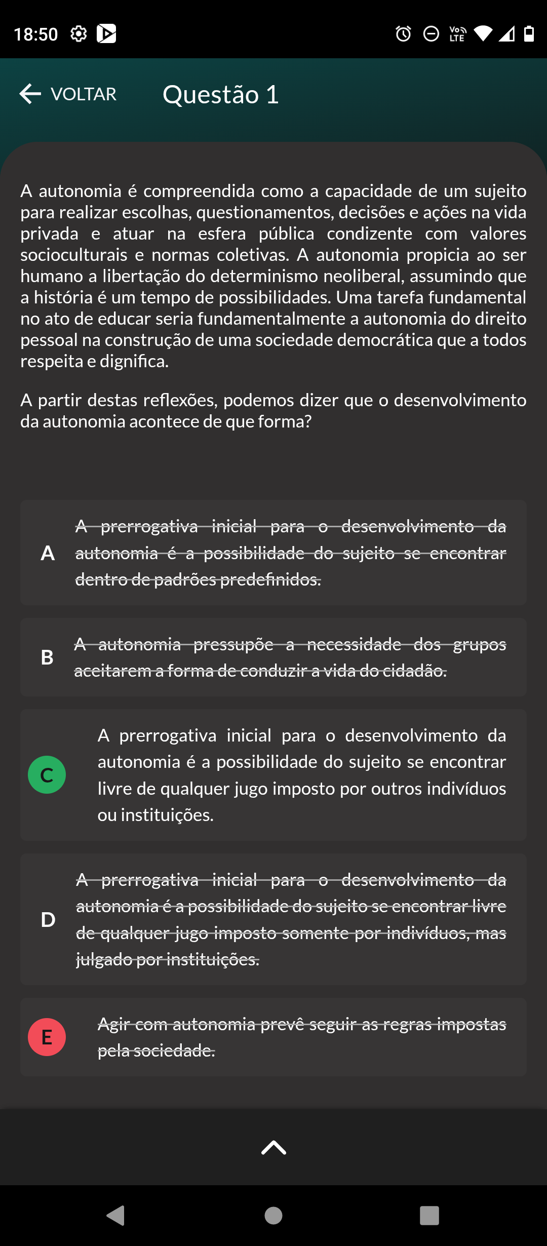 18:50 - LTE VOLTAR Questão 1 A autonomia é compreendida como a capacidade de um sujeito para realizar escolhas, questionamentos, decisões e ações na vida privada e atuar na esfera pública condizente com valores socioculturais e normas coletivas. A autonomia propicia ao ser humano a libertação do determinismo neoliberal, assumindo que a história é um tempo de possibilidades. Uma tarefa fundamental no ato de educar seria fundamentalmente a autonomia do direito pessoal na construção de uma sociedade democrática que a todos respeita e dignifica. A partir destas reflexões, podemos dizer que desenvolvimento da autonomia acontece de que forma? A prerrogativa inicial para desenvolvimento da autonomia é a possibilidade do sujeito se encontrar dentro de padrões predefinidos. A autonomia pressupõe a necessidade dos grupos aceitarem a forma de conduzir a vida do cidadão. A prerrogativa inicial para desenvolvimento da autonomia é a possibilidade do sujeito se encontrar livre de qualquer jugo imposto por outros indivíduos ou instituições. A prerrogativa inicial para desenvolvimento da autonomia éa possibilidade do sujeito se encontrar livre D de qualquer jugo imposto somente por indivíduos, mas julgado por instituições. Agir com autonomia prevê seguir as regras impostas E pela sociedade.