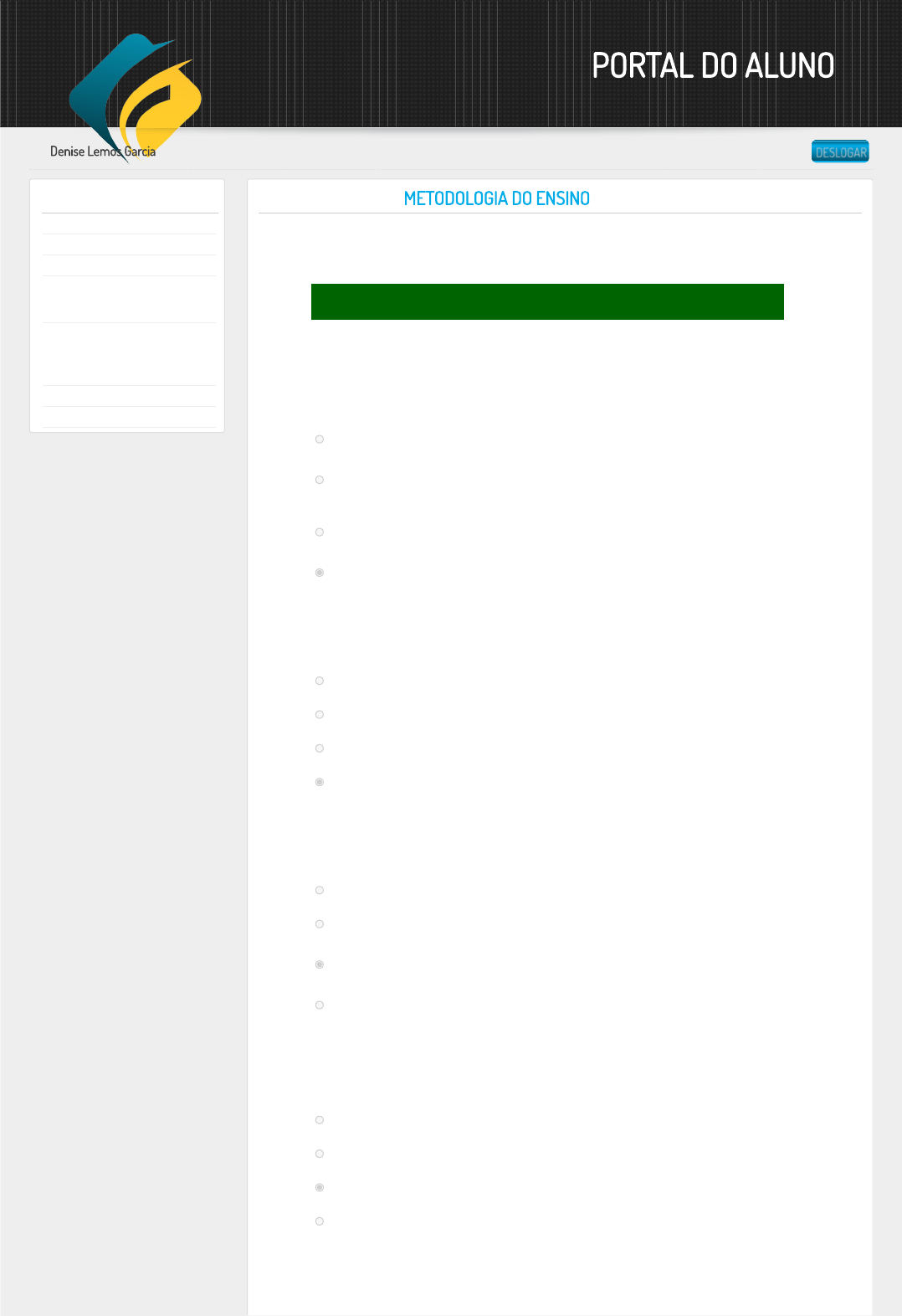 18/01/2024, 21:48 Facuminas EAD - Portal do Aluno https://www.facuminasead.com.br/portaldoaluno/painel.php?execute=provas/resultado-prova&prova=2324&aluno=6824 1/2 PORTAL DO ALUNO Telefone para contato: 31 3842-3838 Olá, Denise Lemos Garcia - Seja Bem vindo (a) ao portal do aluno da Facuminas EAD. DESLOGARDESLOGAR Resultado da Prova: METODOLOGIA DO ENSINO Sua pontuação na prova: 90/100 1 - Julgue as seguintes afirmativas de acordo com o conhecimento matemático: marque a afirmativa INCORRETA É resultado da luta do homem pela sua sobrevivência e é visto como produto das relações do homem com a natureza e com outros homens, num processo contínuo de evolução. O aparecimento de alguns conceitos matemáticos em certos momentos históricos está ligado às exigências de conhecimento da humanidade. A ciência matemática, nesse sentido, é reveladora não de produção individual, mas de um modo de ser e pensar do homem, numa determinada época histórica. O conhecimento matemático é resultante do trabalho mental e individual de determinados homens, em certos momentos da história da humanidade. 2 - São habilidades matemáticas que surgiram no período paleolítico, EXCETO: Desenhos geométricos. Perpendicularismo; Paralelismo; Contabilização; 3 - Segundo Jean Piaget do que deriva o conhecimento? Dos pais ensinarem os filhos em casa; A partir do momento em que vão pra escola. A partir dos cinco anos, aproximadamente, as crianças vão aprendendo a lidar com as coisas ao seu redor a nível simbólico; De momentos em que o indivíduo se depara com situações que possam instigá- lo a pensar, a questionar; 4 - São pontos da diretriz, (Res. nº 5 de 2009, MEC/CNE/CEB) que foi aprovada para Educação Infantil, EXCETO: Concepção de currículo como um conjunto de práticas que buscam articular as experiências e saberes das crianças; A participação, o diálogo e a escuta cotidiana das famílias; Crianças menores de 6 anos tem direito a educação. A garantia da brincadeira e da convivência e interação com outras crianças; 5 - As Diretrizes do Ensino Fundamental de 1998 estabelecem como princípio da prática educativa, EXCETO: » Inicio » Entre em Contato » Documentos Usuários: » Meus Dados FORMAÇÃO PEDAGÓGICA EM MATEMÁTICA: » Aulas » Provas » Financeiro » Menu Principal: https://www.facuminasead.com.br/portaldoaluno/logoff.php https://www.facuminasead.com.br/portaldoaluno/painel.php https://www.facuminasead.com.br/portaldoaluno/painel.php?execute=contato/contato https://www.facuminasead.com.br/portaldoaluno/painel.php?execute=documentos/documentos https://www.facuminasead.com.br/portaldoaluno/painel.php?execute=aluno/editar&editaaluno=6824 https://www.facuminasead.com.br/portaldoaluno/painel.php?execute=aulas/aulas&curso=128 https://www.facuminasead.com.br/portaldoaluno/painel.php?execute=provas/provas&curso=128 https://www.facuminasead.com.br/portaldoaluno/painel.php?execute=financeiro/boletos&curso=128&anoletivo=2023&matricula=15950 18/01/2024, 21:48 Facuminas EAD - Portal do Aluno https://www.facuminasead.com.br/portaldoaluno/painel.php?execute=provas/resultado-prova&prova=2324&aluno=6824 2/2 O respeito ao bem comum; A autonomia; Os exercícios da criticidade. O egoísmo; 6 - É conceito da fase de abordagem para a resolução de um problema: Visualizar a possibilidade de melhorar e possíveis generalizações do resultado. Fase de exploração ou familiarização minuciosa; Tomada de decisão sobre a estratégia que irá aplicar, a qual fora escolhida na fase anterior. Correção do processo; 7 - Sobre os tipos de problemas propostos por Toledo e Toledo (1997), analise a afirmação CORRETA. Problemas de enredo: problemas tradicionais que envolvem operações que os alunos estão aprendendo com o professor. Problemas de arme e efetue: os autores colocam que este tipo de problema tem enfoque no treino de algumas técnicas, com ênfase nas perguntas. Problemas não-convencionais: não permite que o aluno desenvolva a capacidade de planejar, elaborar estratégias, pelo fato do problema seguir o convencional. Os alunos não precisam elaborar seus próprios planos de ação. Problemas de aplicação: problemas elaborados a partir de situações vividas pelos professores, sendo que a solução dos mesmos requer o uso de técnicas e conhecimentos matemáticos. 8 - Além dos cálculos o aluno precisa também dominar outros atributos para desenvolver melhor a matemática, EXCETO Oralidade; Escrita. Desenho; Dança; 9 - É uma das primeiras formas de expressão da criança: Desenho; Dança; Escrita; Fala. 10 - São signos de grandeza, EXCETO: O Tangram. Livros de história; Fita métrica; Graficar; © 2024 - Portal do Aluno - Facuminas EAD - Todos os direitos reservados - Êxodo Digital Marketing© 2024 - Portal do Aluno - Facuminas EAD - Todos os direitos reservados - Êxodo Digital Marketing