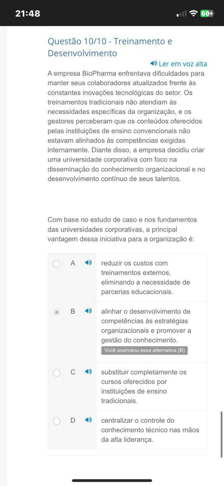 21:48 604 Questão 10/10 Treinamento e Desenvolvimento Ler em alta A empresa BioPharma enfrentava dificuldades para manter seus colaboradores atualizados frente às constantes inovações tecnológicas do setor. Os treinamentos tradicionais não atendiam às necessidades específicas da organização, e gestores perceberam que os conteúdos oferecidos pelas instituições de ensino convencionais não estavam alinhados às competências exigidas internamente. Diante disso, a empresa decidiu criar uma universidade corporativa com foco na disseminação do conhecimento organizacional e no desenvolvimento contínuo de seus talentos. Com base no estudo de caso e nos fundamentos das universidades corporativas, a principal vantagem dessa iniciativa para a organização é: A reduzir custos com treinamentos externos, eliminando a necessidade de parcerias educacionais. alinhar desenvolvimento de competências às estratégias organizacionais e promover a gestão do conhecimento. Você assinalou essa alternativa (B) substituir completamente os cursos oferecidos por instituições de ensino tradicionais. D centralizar controle do conhecimento técnico nas mãos da alta liderança.21:47 594 Atenção. Este gabarito e para uso exclusivo do aluno e deve ser publicado ou compartilhado em redes sociais ou grupo de mensagens. seu compartilhamento infringe as políticas do Centro Universitário UNINTER e poderá implicar sanções disciplinares, com possibilidade de desligamento do quadro de alunos do Centro Universitário, bem como responder ações judiciais no âmbito cível e criminal. Questão 1/10 Treinamento e Desenvolvimento Ler em voz alta Na empresa GlobalMind, RH está redesenhando o programa de desenvolvimento de carreiras. A proposta é integrar os subsistemas de T&D, avaliação de desempenho e sucessão, promovendo um ambiente de crescimento contínuo. Para isso, o RH criou oficinas de planejamento de carreira, sessões de mentoria e ferramentas de autodiagnóstico. A intenção é alinhar as aspirações dos colaboradores às oportunidades internas, promovendo retenção e engajamento. Com base no estudo de caso e nos princípios da gestão de carreiras, a principal contribuição dessa abordagem integrada é: A reduzir a rotatividade por meio da imposição de metas de permanência. eliminar a necessidade de feedback contínuo, substituindo- por avaliações formais. c garantir que todos os colaboradores sigam mesmo percurso profissional. D estimular desenvolvimento de competências alinhadas às estratégias organizacionais e individuais. Você assinalou essa alternativa (D)21:48 604 Questão 8/10 Treinamento e Desenvolvimento Ler em alta A empresa AgroForte decidiu estruturar sua universidade corporativa para atender às demandas de capacitação de seus colaboradores em diferentes regiões do país. A proposta era criar um sistema educacional robusto, com conteúdos desenvolvidos internamente e apoio de consultorias especializadas. A liderança da empresa acreditava que a universidade corporativa deveria ser um instrumento estratégico, com foco na inovação, na gestão do conhecimento e na valorização da cultura organizacional. Com base no estudo de caso e nos princípios de estruturação de uma universidade corporativa, a abordagem mais alinhada ao sucesso do projeto é: A centralizar o desenvolvimento de conteúdos exclusivamente na alta liderança, garantindo alinhamento estratégico. priorizar a contratação de consultorias externas para todas as etapas, evitando envolvimento interno. adotar uma equipe mista, com papéis bem definidos, integrando colaboradores e consultorias especializadas. Você assinalou essa alternativa (C) D limitar a atuação da universidade corporativa à oferta de cursos técnicos obrigatórios. Questão 9/10 Treinamento e Desenvolvimento Ler em alta A empresa realizar um treinamento21:48 604 Questão 7/10 Treinamento e Desenvolvimento Ler em alta A empresa FutureSkills adotou uma estratégia de T&D baseada em lifelong learning. Os colaboradores têm acesso contínuo a cursos, trilhas de aprendizagem e sessões de mentoria. A empresa também investe em programas de upskilling e reskilling para acompanhar as mudanças tecnológicas. Como resultado, houve aumento na retenção de talentos e na inovação dos processos internos. Com base no estudo de caso e nas tendências em T&D, a estratégia adotada pela empresa está alinhada ao conceito de: A Treinamento pontual e reativo. Educação corporativa tradicional. Aprendizagem contínua e adaptativa. Você assinalou essa alternativa (C) D Capacitação exclusiva para cargos técnicos. Questão 8/10 Treinamento e Desenvolvimento Ler em voz alta A empresa AgroForte decidiu estruturar sua universidade corporativa para atender às demandas de capacitação de seus colaboradores em diferentes regiões do país. A proposta era criar um sistema educacional robusto, com conteúdos desenvolvidos internamente e apoio de consultorias especializadas. A liderança da empresa acreditava que a universidade corporativa deveria ser um instrume na inovação, na21:48 594 Questão 6/10 Treinamento e Desenvolvimento Ler em alta A empresa InovaEdu está enfrentando dificuldades para engajar seus colaboradores em processos de inovação. A equipe de T&D decidiu aplicar Design Thinking para desenvolver soluções educacionais mais eficazes. Durante a etapa de empatia, facilitadores realizaram entrevistas com os colaboradores e observaram suas rotinas. Descobriram que treinamentos anteriores não consideravam as reais necessidades dos participantes, o que gerava desmotivação. A partir dessas descobertas, foram criadas personas e definidos desafios específicos para orientar as próximas etapas do processo. Com base no estudo de caso e nos princípios do Design Thinking, a etapa que permitiu identificar as necessidades reais dos colaboradores foi: A Ideação, pois estimula a geração de ideias criativas. Teste, pois permite v