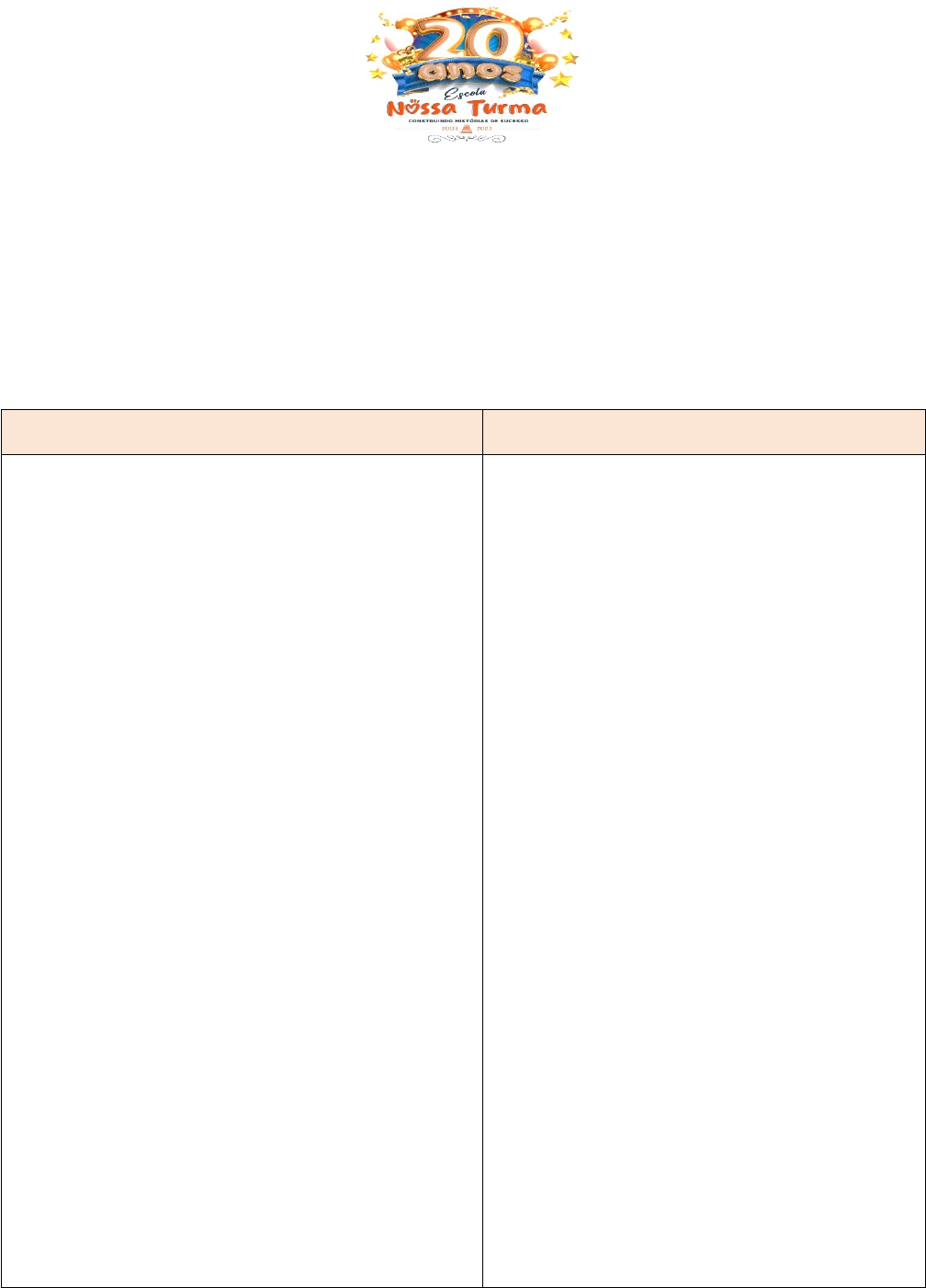 PLANEJAMENTO SEMANAL Segmento: Turma: 1º ano Professora: Joseane Santos CRONOGRAMA DE ATIVIDADES- De 17 a 21 de Julho de 2023 SEGUNDA-FEIRA (17/04/2023) DESCRIÇÃO DAS ATIVIDADES Componente curricular: · Nesta semana todos os dias teremos · Leitura e escrita no caderno de caligrafia. · Português – Livro (Cantigas e parlendas) · Geografia: Eu e os outros Habilidades: (EF15LP16) Ler e compreender, em colaboração com os colegas e com a ajuda do professor e, mais tarde, de maneira autônoma, textos narrativos de maior porte como contos (populares, de fadas, acumulativos, de assombração etc.) e crônicas. Desenvolvimento da aula: Acolhida Geral: Marta (Ilha dos sentimentos) Em classe fazer a oração e agenda. Falar um pouco sobre a atividade do Soul emocional realizada em casa e o que aprenderam com ela (Assunto: Empatia). Usar a história apresentada na acolhida geral para entrar no assunto. Entregar o caderno de Geografia no início da aula para elaboração do cabeçalho para realização de atividade em casa de geografia. 1º Momento aula de geografia: Aula expositiva e dialogada com o uso do livro, explicar o assunto estudado anteriormente das páginas 31 até 34. Apresentar o assunto novo: Precisamos uns dos outros. Realizar atividade da pág. 35 (usando a aprendizagem da aula anterior de português sobre legendas. 2° Momento aula de português: Campeonato da cantiga que a turma mais gosta e realizar atividade do livro página 59. A turma deverá escolher qual a cantiga que mais gostam e depois deverá escrevê-la no livro pags 49 até 51. Após essa atividade realizar atividade da pág 59, onde eles deverão desenhar a música escolhida por eles. Se ou houver tempo realizar atividade da página 48 de leitura, recorte e colagem Aproveitar esse momento para realizar leitura e escrita com as crianças que precisam de reforço leitura e caligrafia. Atividade de classe: Jogo de palavras – recorte e colagem Livro de Português páginas – 48 Campeonato da cantiga preferida da turma. Livro de Português páginas – 49 até 59 Caligrafia e leitura. Atividade de casa: Caderno de Geografia Livro de português pág. 62 TERÇA-FEIRA (18/ 07 / 2023) DESCRIÇÃO DAS ATIVIDADES Componente curricular: · Educação física. · Matemática – Habilidades: · História: (EF01HI03) Descrever e distinguir os seus papéis e responsabilidades relacionados à família, à escola e à comunidade. · (EF01HI04) Identificar as diferenças entre os variados ambientes em que vive (doméstico, escolar e da comunidade), reconhecendo as especificidades dos hábitos e das regras que os regem. · Matemática: EF01MA21 consiste em: Ler dados expressos em tabelas e em gráficos de colunas simples. · Realizar pesquisa, envolvendo até duas variáveis categóricas de seu interesse e universo de até 30 elementos, e organizar dados por meio de representações pessoais. Desenvolvimento da aula: · Acolhida, música, oração e agenda · Aula Expositiva Dialogada · · Explicação da atividade realizada em casa de Geografia e português com correção. · Cabeçalho no caderno de Matemática · Explicação do assunto novo (Agora, antes e depois), explicar atividade para casa do assunto de retomada no livro de matemática. Lanche Educação física 2º Momento aula de história com o tema “Minha Escola”, envolvendo o assunto do livro. Aula de história no 2º momento (As crianças da escola, os adultos da minha escola, leio e compreendo. Realizar atividade de alfabetização (Leitura e escrita) Atividade de classe: Livro de história 36 até 41 Caderno de Matemática: Atividade de retomada Livro de matemática páginas 47 até 49 Atividade de casa: Caderno de matemática – Escrita dos números de 0 até 10 Formas geométricas Contagem dos números de 0 até 50 Maior e menor Igual e diferente Agora, antes e depois. Realizar uma cartinha para entregar na quarta-feira (Dia do Amigo) Pedir que os responsáveis coloquem uma fruta na lancheira da criança para presentear o seu amigo de classe para o Dia do Amigo QUARTA-FEIRA (19 /07 / 2023) DESCRIÇÃO DAS ATIVIDADES Componente curricular: Matemática – Explicação da atividade de casa. Capoeira / balett Ciências – Os 5 sentidos / Higiene pessoal / corpo humano e movimentos corporais e alimentação saudável. Geografia: As pessoas ao meu redor – Criação de cartas para os colegas da classe História – Minha Escola (As crianças da minha escola - Adultos da minha escola e cooperação e respeito). Habilidades: EF01CI03 consiste em: Discutir as razões pelas quais os hábitos de higiene do corpo (lavar as mãos antes de comer, escovar os dentes, limpar os olhos, o nariz e as orelhas etc.) são necessários para a manutenção da saúde. (EF01CI01) Comparar características de diferentes materiais presentes em objetos de uso cotidiano, discutindo sua origem, os modos como são descartados e como podem ser usados de forma mais consciente, para que se pratique o desenvolvimento sustentável na cidade e no campo. Desenvolvimento da aula: Aula expositiva dialogada/ Acolhida: Oração, louvor e agenda. História (A amizade) dialogo com a turma. · Explicação da atividade que foi realiza em casa de matemática · Realizar caderno de para atividade de casa, assunto: Higiene pessoal e alimentação saudável · Realizar atividade do livro dos 5 sentidos no livro. Colocar algumas coisas, objetos, alimentos e outros em uma caixa e pedir para que eles descubram o que é! · Relembra assunto estudado de ciências: (Higiene pessoal) · Explicar a importância dos movimentos do corpo e fazer um momento de brincadeiras (Quem pega 1º, com o objetivo principal de movimentos corporais e trabalhando junto a atenção a agilidade e o espírito competitivo, explicando que devemos sempre fazer o nosso melhor para alcançar nossos objetivos. Brincadeira: com vários objetivos no chão irei separar em duplas. Irei falar partes do corpo e por fim o nome do objeto p