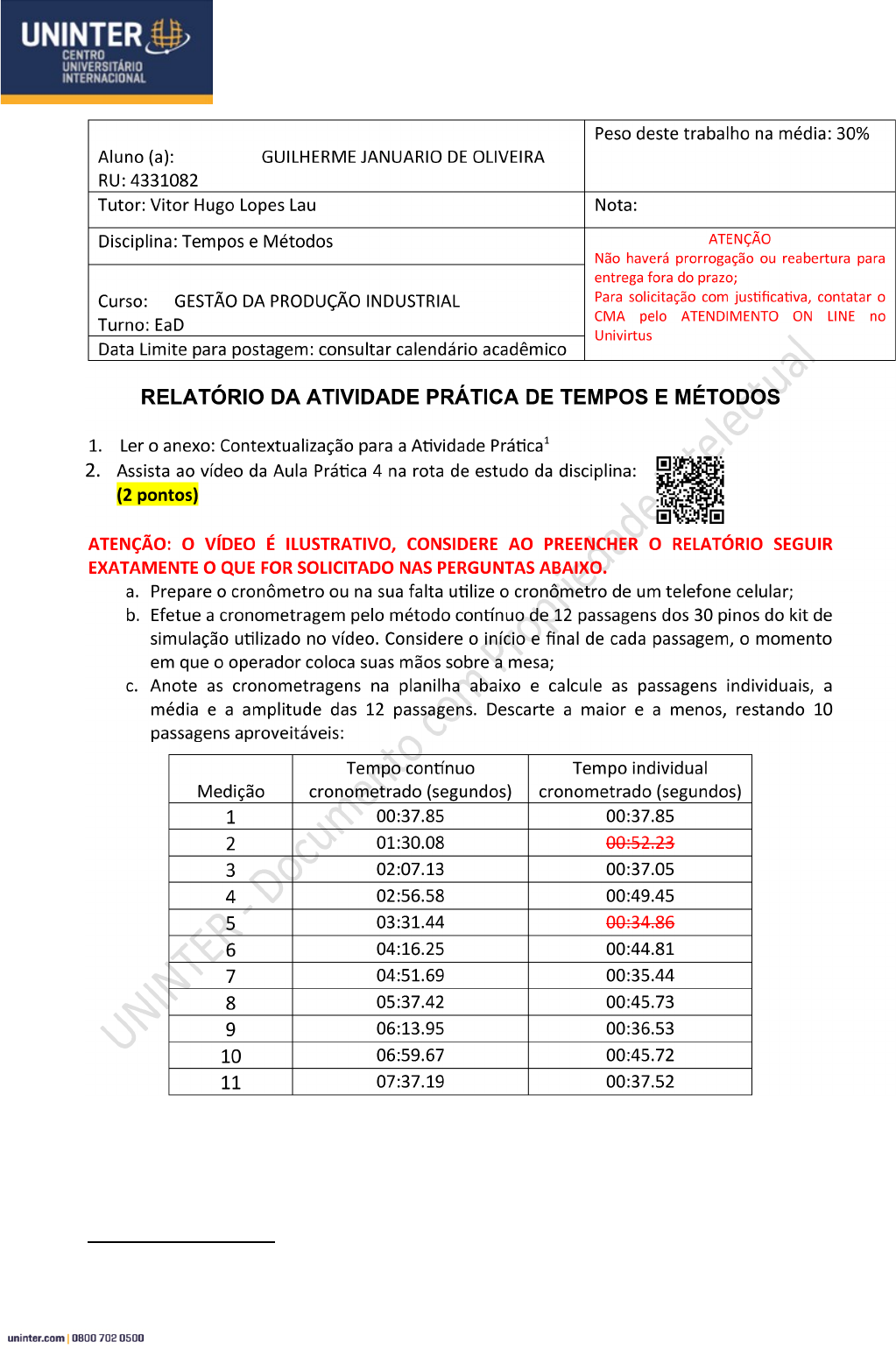 1 Jurandir Peinado e Alexandre Reis Graeml 12 08:25.38 00:48.19 X = Tempo Médio das 10 Medições Aproveitáveis (Tmc) 00:41.82 R = Amplitude das 10 Observações Aproveitáveis (maior – menor) 00:14,01 3. Considerando o tempo médio e a amplitude obtidos, verificar nas tabelas 1 e 2 do texto de contextualização da Atividade Prática os coeficientes Z e d2 para 10 cronometragens com 95% de grau de confiança e 5% de erro amostral e verifique se a medição efetuada pode ser validada: (1 ponto) Calcular o número de cronometragens iniciais = Z . R 2 Er . d 2 . X = __________________________________70.693______________________________________ ____ = ____________________________________________________________________________ Tabela 1 – Coeficientes de distribuição normal Probabilidade 90% 91% 92% 93% 94% 95% 96% 97% 98% 99% Z 1,65 1,70 1,75 1,81 1,88 1,96 2,05 2,17 2,33 2,58 Fonte: Jurandir Peinado e Alexandre Reis Graeml Tabela 2 – Coeficientes d2 para o número de cronometragens iniciais N 2 3 4 5 6 7 8 9 10 d2 1,128 1,693 2,059 2,326 2,534 2,704 2,847 2,970 3,078 Fonte: Jurandir Peinado e Alexandre Reis Graeml 4. Com base no número de cronometragens iniciais a cronometragem está: (1 ponto) Validada ⃝ Não validada ⃝ 5. Comente abaixo o desempenho do operador em no mínimo 8 linhas, identificando pontos a serem melhorados para um desempenho uniforme: (2 pontos) Observando o trabalho do operador identificamos algumas falhas que explicam muito bem o porque do processo não ter sido validado, primeiro o trabalhador esta conversando muito durante o processo o ideal é ele focar no que está fazendo pelo fato do serviço ser muito repetitivo e conversando isso atrapalha muito, segundo ponto é a questão da habilidade do operador esta parecendo querer fazer o trabalho muito rápido isso pode ser explicado por conta dele está sendo filmado e acaba ficando nervoso e errando o processo. ATENÇÃO II: INDEPENDENTEMENTE DO RESULTADO OBTIDO, FAÇA OS CÁLCULOS ABAIXO SOLICITADOS: 6. Faça o cálculo do tempo normalizado para um grau de rendimento de 110% (1,1) pois o operador foi considerado pouco hábil para a tarefa: (1 ponto) TN = Tmc. gr TN = Tempo normalizado TN = 41,82________X______1,1__ Tmc = Tempo médio das 10 medições aproveitáveis gr = Grau de rendimento do operador TN = ___46,00_______________ 7. Faça o cálculo do tempo padrão, considerando um grau de concessão de 5% para perdas pessoais e 20% para perdas gerais: (1 ponto) TP = TN + (TN . %Pp) + (TN . %Pg) TP = Tempo padrão TP = _______________57,5____________ TN = Tempo normalizado %Pp = Concessões para perdas pessoais TP = ______0,05_____________________ %Pg = Concessões para perdas gerais TP = ___________0,20________________ 8. Postar abaixo uma foto do aluno(a) – pode ser tipo selfie – realizando a cronometragem para utilizarmos como evidências da atividade prática junto ao MEC (se for possível realizar uma pequena filmagem e postar como anexo na aba Trabalhos no Univirtus. (2 pontos) 9. Postar este documento em pdf na Aba Trabalhos no Univirtus. _________Rio Claro/SP______________ / ___12____ / _______11_____ / 2024 __________GUILHERME J. DE OLIVEIRA____________ Assinatura física ou digital ATENÇÃO: SE HOUVER CARACTERIZAÇÃO DE PLÁGIO, O TRABALHO SERÁ CONSIDERADO NULO E A NOTA ZERA ZERADA RELATÓRIO DA ATIVIDADE PRÁTICA DE TEMPOS E MÉTODOS