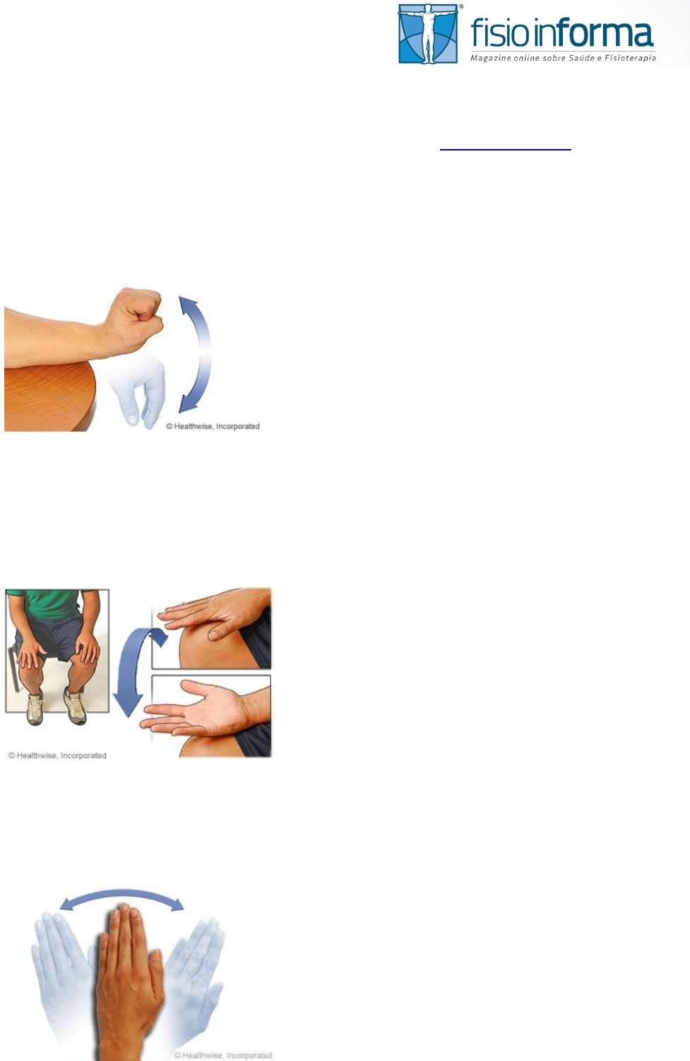 Plano de exercícios para tendinites do punho Aqui estão alguns exemplos de exercícios de reabilitação típicos para tendinites do punho. Comece cada exercício lentamente. Se começar a ter dor interrompa o plano. O seu médico ou fisioterapeuta irão dizer-lhe quando pode começar estes exercícios e quais deles irão funcionar melhor para si. 1. Flexão e extensão do punho 1. Coloque o antebraço sobre uma mesa, com a mão e punho afetados de fora da mesa, palma para baixo. 2. Dobre o punho e feche a mão, em seguida, abaixe sua mão e permita que os dedos relaxem. Segure cada posição durante cerca de 6 segundos. 3. Repetir 8 a 12 vezes. 2. Prono-supinação da mão 1. Sentado, coloque o antebraço e punho afetado sobre a sua coxa, palma para baixo. 2. Vire a sua mão com a palma para cima. Alternar entre a palma para cima e a palma para baixo, mantendo o antebraço sobre a coxa. 3. Repetir 8 a 12 vezes. 3. Desvio radial e cubital do punho 1. Mantenha a sua mão afetada à sua frente, palma para baixo. http://fisioterapiajoaomaia.blogspot.pt/2012/10/tenossinovite-de-de-quervain.html 2. Lentamente, dobre o punho tanto quanto puder de lado para lado. Segure cada posição durante cerca de 6 segundos. 3. Repetir 8 a 12 vezes. 4. Alongamento dos extensores do punho 1. Estender o braço com o punho dobrado e os dedos em direção ao chão. 2. Com a outra mão, dobre o punho o mais que conseguir até sentir uma ligeira a moderada tensão no antebraço. 3. Mantenha o alongamento por pelo menos 15 a 30 segundos. 4. Repita 2 a 4 vezes. 5. Quando fizer este alongamento sem dificuldade, repita os passos de 1 a 4. Mas desta vez com o punho fechado. 5. Alongamento dos flexores do punho 1. Estenda o braço à sua frente com a palma virada para a frente. 2. Dobre o punho para trás, apontando para cima em direção ao teto. 3. Com a outra mão, dobre o punho o mais que conseguir até sentir uma ligeira a moderada tensão no seu antebraço. 4. Mantenha o alongamento por pelo menos 15 a 30 segundos. 5. Repita 2 a 4 vezes. 6. Repita os passos de 1 a 5, mas desta vez apontando a mão em direção ao chão. Tradução João Maia, Fisioterapeuta Clinica de Fisioterapia e Recuperação da Maia Gabinete privado na Clinica Dra Ilda Ferreira Autor da Fisioinforma, Magazine Online sobre saúde e fisioterapia Fonte Kaiser Permanente, https://healthy.kaiserpermanente.org/html/kaiser/index.shtml, consultado a 09.12.14 http://fisioterapiajoaomaia.blogspot.pt/