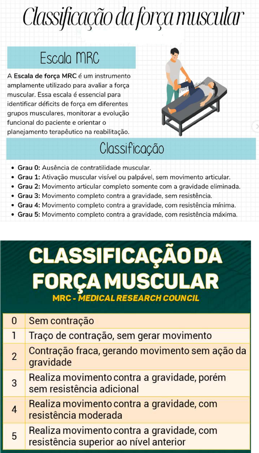 Classificação da força muscular Escala MRC A Escala de força MRC é um instrumento amplamente utilizado para avaliar a força @sob muscular. Essa escala é essencial para identificar déficits de força em diferentes grupos musculares, monitorar a evolução funcional do paciente e orientar o planejamento terapêutico na reabilitação. Classificação Grau 0: Ausência de contratilidade muscular. Grau 1: Ativação muscular visível ou palpável, sem movimento articular. Grau 2: Movimento articular completo somente com a gravidade eliminada. Grau 3: Movimento completo contra a gravidade, sem resistência. Grau 4: Movimento completo contra a gravidade, com resistência mínima. Grau 5: Movimento completo contra a gravidade, com resistência máxima. CLASSIFICAÇÃODA FORÇA MUSCULAR MRC MEDICAL RESEARCH COUNCIL Sem contração 1 Traço de contração, sem gerar movimento 2 Contração fraca, gerando movimento sem ação da gravidade 3 Realiza movimento contra a gravidade, porém sem resistência adicional 4 Realiza movimento contra a gravidade, com resistência moderada Realiza movimento contra a gravidade, com 5 resistência superior ao nível anterior