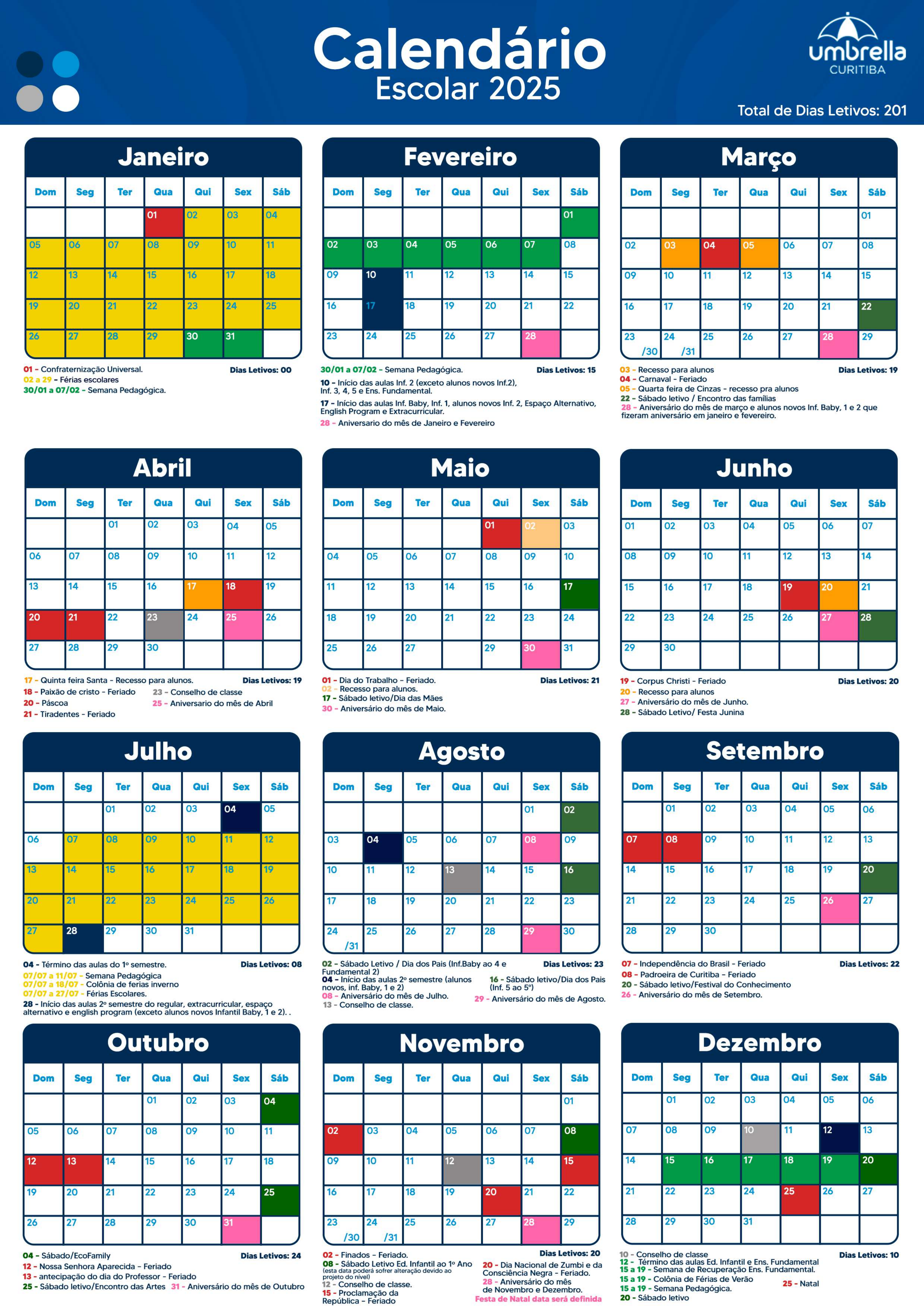 Calendário umbrella CURITIBA Escolar 2025 Total de Dias Letivos: 201 Janeiro Fevereiro Março Dom Seg Ter Qua Qui Sex Sáb Dom Seg Ter Qua Qui Sex Sáb Dom Seg Ter Qua Qui Sex Sáb 01 02 03 04 01 01 05 06 07 08 09 10 11 02 03 04 05 06 07 08 02 03 04 05 06 07 08 12 13 14 15 16 17 18 09 10 11 12 13 14 15 09 10 11 12 13 14 15 19 20 21 22 23 24 25 16 17 18 19 20 21 22 16 17 18 19 20 21 22 26 27 28 29 30 31 23 24 25 26 27 28 23 24 25 26 27 28 29 /30 /31 01 Confraternização Universal. Dias Letivos: 00 30/01 a 07/02 Semana Pedagógica. Dias Letivos: 15 03 Recesso para alunos Dias Letivos: 19 02 29 Férias escolares 10 Início das aulas Inf. 2 (exceto alunos novos Inf.2), 04 Carnaval Feriado 30/01 a 07/02 Semana Pedagógica. Inf. 3, 4, 5 e Ens. Fundamental. 05 Quarta feira de Cinzas recesso pra alunos 22 Sábado letivo / Encontro das famílias 17 Início das aulas Inf. Baby, Inf. 1, alunos novos Inf. 2. Espaço Alternativo, English Program e Extracurricular. 28 Aniversário do mês de março e alunos novos Inf. Baby, 1 e 2 que fizeram aniversário em janeiro e fevereiro. 28 - Aniversario do mês de Janeiro e Fevereiro Abril Maio Junho Dom Seg Ter Qua Qui Sex Sáb Dom Seg Ter Qua Qui Sex Sáb Dom Seg Ter Qua Qui Sex Sáb 01 02 03 04 05 01 02 03 01 02 03 04 05 06 07 06 07 08 09 10 11 12 04 05 06 07 08 09 10 08 09 10 11 12 13 14 13 14 15 16 17 18 19 11 12 13 14 15 16 17 15 16 17 18 19 20 21 20 21 22 23 24 25 26 18 19 20 21 22 23 24 22 23 24 25 26 27 28 27 28 29 30 25 26 27 29 30 31 29 30 17 Quinta feira Santa Recesso para alunos. Dias Letivos: 19 01 Dia do Trabalho Dias Letivos: 21 19 Corpus Christi Feriado Dias Letivos: 20 18 Paixão de cristo Feriado 23 Conselho de classe 02 Recesso para alunos. 20 Recesso para alunos 17 Sábado letivo/Dia das Mães 20 Páscoa 25 Aniversario do mês de Abril 27 Aniversário do mês de Junho. 30 Aniversário do mês de Maio. 21 Tiradentes Feriado 28 Sábado Letivo/ Festa Junina Julho Agosto Setembro Dom Seg Ter Qua Qui Sex Sáb Dom Seg Ter Qua Qui Sex Sáb Dom Seg Ter Qua Qui Sex Sáb 01 02 03 04 05 01 02 01 02 03 04 05 06 06 07 08 09 10 11 12 03 04 05 06 07 08 09 07 08 09 10 11 12 13 13 14 15 16 17 18 19 10 11 12 13 14 15 16 14 15 16 17 18 19 20 20 21 22 23 24 25 26 17 18 19 20 21 22 23 21 22 23 24 25 26 27 27 28 29 30 31 24 25 26 27 28 29 30 28 29 30 /31 04 Término das aulas do 1° semestre. Dias Letivos: 08 02 Sábado Letivo / Dia dos Pais (Inf.Baby ao 4 e Dias Letivos: 23 07 Independência do Brasil Feriado Dias Letivos: 22 07/07 a 11/07 Semana Pedagógica Fundamental 2) 08 Padroeira de Curitiba Feriado 04 Início das aulas semestre (alunos 16 Sábado letivo/Dia dos Pais 07/07 a 18/07 Colônia de ferias inverno novos, inf. Baby, e 2) (Inf. ao 20 Sábado letivo/Festival do Conhecimento 07/07 a 27/07 Férias Escolares. 08 Aniversário do mês de Julho. 26 Aniversário do mês de 29 Aniversário do mês de Agosto. 28 Início das aulas 2° semestre do regular, extracurricular, espaço 13 Conselho de classe. alternativo e english program (exceto alunos novos Infantil Baby, e 2). Outubro Novembro Dezembro Dom Seg Ter Qua Qui Sex Sáb Dom Seg Ter Qua Qui Sex Sáb Dom Seg Ter Qua Qui Sex Sáb 01 02 03 04 01 01 02 03 04 05 06 05 06 07 08 09 10 11 02 03 04 05 06 07 08 07 08 09 10 11 12 13 12 13 14 15 16 17 18 09 10 11 12 13 14 15 14 15 16 17 18 19 20 19 20 21 22 23 24 25 16 17 18 19 20 21 22 21 22 23 24 25 26 27 26 27 28 29 30 31 23 24 25 26 27 28 29 28 29 30 31 /30 /31 04 Sábado/EcoFamily Dias Letivos: 24 02 Finados Feriado. Dias Letivos: 20 10 Conselho de classe Dias Letivos: 10 12 Nossa Senhora Aparecida Feriado 08 Sábado Letivo Ed. Infantil ao 1° Ano 20 Dia Nacional de Zumbi e da 12 Término das aulas Ed. Infantil e Ens. Fundamental (esta data poderá sofrer alteração devido Consciência Negra Feriado. 15 a 19 Semana de Recuperação Ens. Fundamental. 13 antecipação do dia do Professor Feriado projeto do 28 Aniversário do mês 15 a 19 Colônia de Férias de Verão 25 Sábado letivo/Encontro das Artes 31 - Aniversário do mês de Outubro 12 Conselho de classe. 25 Natal 15 Proclamação da de Novembro e Dezembro. 15 a 19 Semana Pedagógica. República Feriado Festa de Natal data será definida 20 Sábado letivo