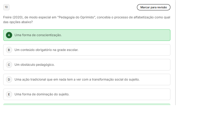 10 Marcar para revisão Freire (2020), de modo especial em "Pedagogia do Oprimido", concebia processo de alfabetização como qual das opções abaixo? A Uma forma de conscientização. B Um conteúdo obrigatorio na grade escolar. C Um D Uma ação tradicional que em nada tem a ver com a transformação social do sujeito. E Uma forma de dominação do sujeito.