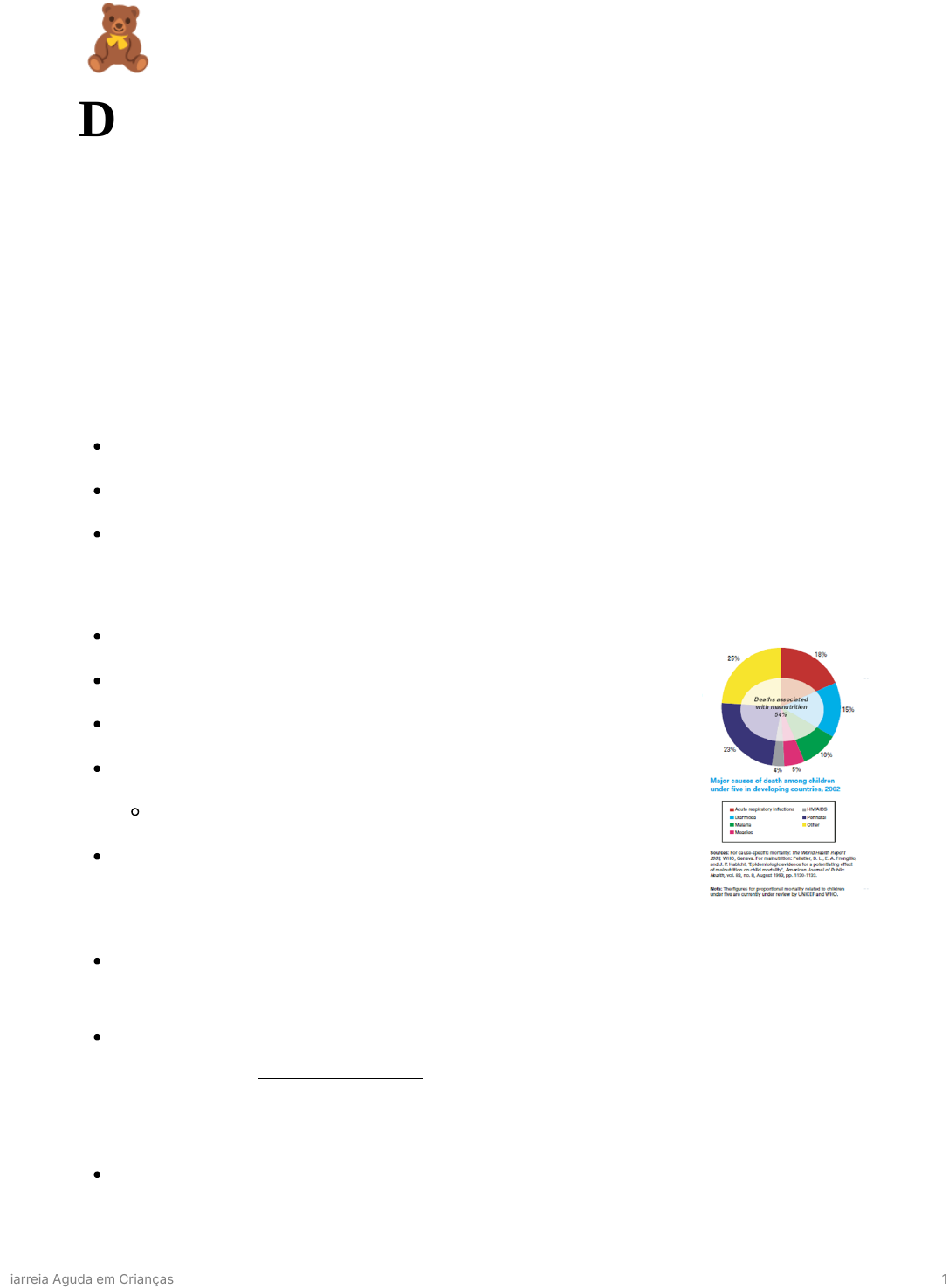 🧸 Diarreia Aguda em Crianças Feito por Evelyn Autran (Medicina - 154) em 2025.1 Foram usadas como referências: a aula do Drª Margarida, as aulas do MedCurso 2024 e o cartaz do MS. Introdução De modo geral, a diarreia ter por definição a ocorrência de 3 ou mais evacuações amolecidas em 24h. Além disso, ela pode ser classificada mediantes a duração, em: Aguda: até 14 dias (para Margarida, esse critério apenas não é suficiente) Persistente: 14-30 dias Crônica: ≥ 30 dias Epidemiologia Importante causa de morbidade em todo mundo 3 episódios/ ano 2ª causa de mortalidadePara a avaliação da desidratação grave, é necessário que a criança apresente 2 ou mais das alterações listadas, sendo um dos sintomas daqueles marcados com “*” A criança com desidratração precisa ter dois ou mais sinais listados Se a criança não apresentar sinais suficientes para classificar, ela não está em desidratação. Como dito anteriormente, o tempo de enchimento capilar alterado foi retirado, mas, para a desidratação grave ele estaria > 5s e, para a desidratação, entre 3-5s. Plano A - Tratamento domiciliar Reidratar após cada evacuação líquida com solução de reidratação oral (SRO) Irá usar como repositor e não como substituinte da água, pois ele tem muitos eletrólitos. Evitar bebidas isotônicas, como gatored, além de sucos. 50-100ml Aumentar a ingestão de água, agua de coco, caldos de frango com legumes Evitar refrigerantes, sucos de frutas, bebidas isotônicas, líquidos açucarados e energéticos, mas continuar a alimentação. Iniciar Zinco oral por 10 a 14 dias 6 meses 20 mg/Kg/dia Diarreia Aguda em Crianças 9 A diarreia passa e o zinco continua, para evitar episódios futuros. Vigiar sinais de alerta Terapia de Reidratação Oral (TRO) – Qual solução? Durante episódios de diarreia, o organismo perde grandes quantidades de água e eletrólitos, como sódio e potássio, o que compromete a hidratação e o funcionamento celular. A TRO atua repondo esses elementos por meio da administração oral de uma solução contendo água, glicose e sais minerais. A entrada conjunta de glicose e sódio cria um gradiente osmótico que favorece a absorção de água — ou seja, a água “segue” esse movimento de solutos e é reabsorvida pelo organismo. Esse processo ocorre de forma contínua, contribuindo para a restauração do equilíbrio hídrico e eletrolítico. Plano B Terapia de reidratação oral na unidade de saúde Solução de reidratação oral Volume conforme idade ou 50-100 ml/kg (4-6h) Durante a TRO manter somente aleitamento materno (o objetivo é hidratação e não alimentação) Usar ondansetrona em caso de vômitos Após hidratação → Alta com plano A Se persistir → gastróclise → Piorou → plano C Plano C Hidratação venosa com solução cristaloide Diarreia Aguda em Crianças 10 SF 0,9% ou RL 100 ml/kg 1 ano 30 ml/kg em 30 min; 70 ml/kg em 2,5h Após melhora inicial, iniciar TRO Indicação de antibiótico? 🧸 Antibiótico aumenta o tempo de diarreia! Só o faz quando você percebe que a criança está evoluindo para sepses! (No caso de crianças menores que 2 anos: com sangue nas fezes, febre e piora no EG) Situações especificas e selecionadas Diarreia com sangue (Shigella) com febre e comprometimento do estado geral Evitar complicações pelo potencial invasor do agente Cifotriaxona, azitrommicina ⚠ Não se usa mais ciprofloxacina nesses casos! Mais raramente Diarreia por cólera Em Imunodeprimidos Anemia falciforme Pacientes em uso de próteses cardíacas Diarreia aguda por protozoários (rara) Outros medicamentos Anti-emeticos Ondasetrona Anti-secretórios Diarreia Aguda em Crianças 11 Racecadotril Contraindicados em menores de 3 meses Só funciona efetivamente em diarreia secretória Zinco 10 mg/kg/dia nos 6 meses Vitamina A Nos desnutridos Probióticos 🧸 O TNT dos estudos que envolvem os probrióticos é alto → Um NNT alto indica que muitas pessoas precisam ser tratadas para que apenas uma tenha um benefício real. Ou seja, o tratamento tem baixa efetividade clínica para o desfecho avaliado. Lactobacilo GG, lactobacilo reuteri, Sacharomiceis Boulardii Floratil → algumas metanálises dizem que ele pode reduzir em até 12h (em relação a todo o período) Enterogermina → Não tem efeito nenhum 🧸 O MS não indica Probióticos e nem a Rececadotrila (pois diminui o número de evacuações) Para reduzir a mortalidade por doença diarreica: Manter a alimentação Calorias, fibras e gordura Reduzir a lactose? Aleitamento materno Prevenir a desidratação e tratar a desidratação corretamente Diarreia Aguda em Crianças 12 Uso criterioso de antibiótico Diarreia Aguda em Crianças 13