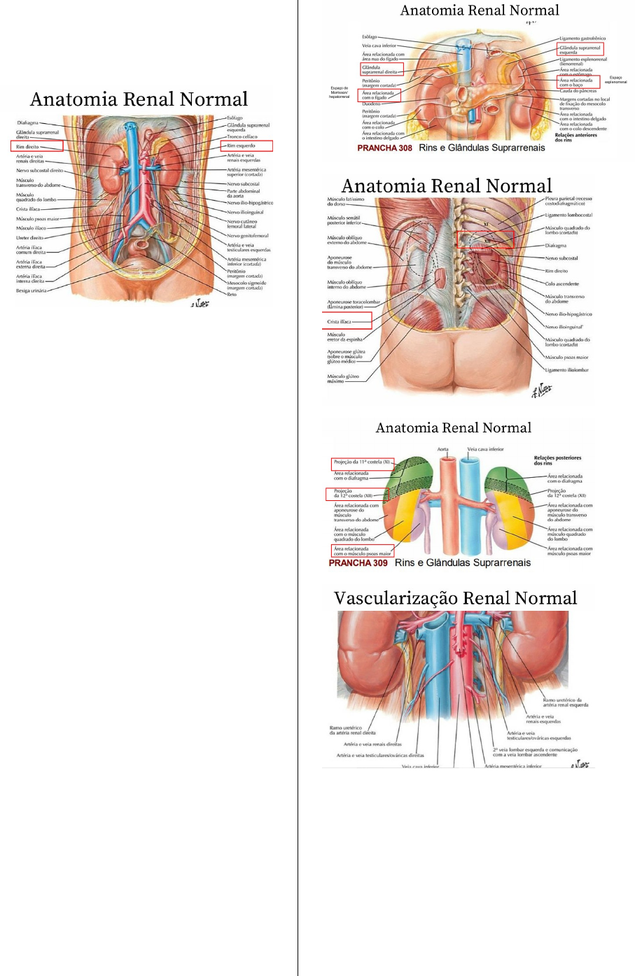 Ana Carolina De Souza M1 NEFROLOGIA - THIAGO A importância da anatomia renal e implicações clínicas A altura do rim vai estar próximo da T11 (12 costela posterior), até mais ou menos a lâmina posterior do osso ilíaco. O rim é móvel, quando deitamos ele desloca uma vértebra para cima ou um pouco mais para baixo da crista ilíaca. · Importante para ultrassom a beira leito. · Sinal de alarme quando esse ultrassom for feito e o rim não ficar móvel, ele tem que ser móvel. O lado direito está relacionado com o músculo psoas, por exemplo, pode ter uma pielonefrite e ter uma inflamação do psoas secundária a essa pielonefrite devido a essa proximidade (dor com rotação externa da coxa). · Rim direito é mais alto que o esquerdo. · Psoíte. Artéria renal é um ramo direto da aorta abdominal. A primeira artéria renal a se ver é à direita pois é mais alta. O primeiro ramo que começar a sair é bifurcação lateralmente é a artéria renal direita. Abaixo dela tem maior incidência de aneurisma de aorta. Se divide em vários ramos. Do córtex renal clinicamente tem que se lembrar de seu tamanho. Quanto menos espessura mais fraco está esse rim. Quanto mais espesso, provavelmente tem uma inflamação aguda. O córtex tem pouca terminação nervosa. Todas as alterações de dor e obstrutivas na maioria das vezes são quadros agudos. A maior congestão está nas pequenas veias, próximo no córtex e na medula. AS ANOMALIAS RENAIS MAIS COMUNS Congênitas: “numerárias” · Agenesias renais: ausência de um ou dos 2 rins (Síndrome de Potter); · Rim supranumerário. Anomalias de posição ou fusão: · Rim pélvico; · Borda ectópica; · Rim em ferradura: fusão parcial, de apenas um polo (mais comum ser no polo inferior) ou uma borda. · Fusão total: Rim em panqueca. Anomalias de estrutura e diferenciação: · Alterações na formação dos túbulos renais e do sistema coletor; · Rim multicistico displasico; · Rim policístico; · Rim hipoplásico: funciona, mas é mais propenso a infecções e hipertensão arterial; · Rim atrófico: não funciona normalmente; · Rim hiperplásico: associado ao rim contralateral atrófico, hipoplásico ou à agenesia contralateral. · Um rim fundido à esquerda. · Formou uma ferradura. · Rim ferradura. · Formou o rim e o ureter do rim esquerdo se desenvolveu para o outro lado (se formou errado). O achado mais comum ao se fazer um raio-X simples de abdômen (não consegue ver o rim pois é retroperitoneal). · Se está vendo o rim no raio-x ele está calcificado (cálculo coraliforme). · Rim hipoplásico (não se desenvolveu direito). · Córtex normal, sinal de que está apenas mal desenvolvido. · Agenesia renal esquerda. · Não tem nem formação dele. Doppler veia renal · Cálculo renal pode ser avaliado. · Local que mais vai distender na congestão e inflamação. Protocolo Vexus Veia e ultrassom · Fazer avaliação do rim, posicionar e achar o rim voltado para a parte hepatorenal. · Onde eu tenho mais velocidade de sangue vai pintar mais e aparecer mais colorido. · Na infecção o vaso fica mais turgido. · Avaliar a curva de movimento com o vexus. · Artéria varia com o batimento cardíaco, a veia forma uma onda contínua no Doppler pulsátil. · Se tiver diferente da curva de baixo (continua) é sinal de que tem alteração. · Padrão congestivo - fase sistólica e diastólica pela congestão, duas curvas e não uma contínua. ESPAÇO DE MORRISON/HEPATORRENAL · Pesquisar no trauma se tem líquido livre no espaço de morrison ou se está normal. · Analisar se tem liquido livre entre o rim e o fígado. · Janela esplenorrenal · Se tem diferenciação da ecogenicidade desse rim fala muito a favor de um processo infeccioso. · Mais retroperitoneal, mais posterior. E-FAST · líquido lá em cima no fígado. · Janela hepatorrenal positiva. Hidronefrose · Quase certo que tem cálculo mais embaixo. · De acordo com a dilatação dos componentes do rim tem grau de hidronefrose mais alto. Exames laboratoriais em nefrologia Agenda A importância da avaliação da função e investigação. Interpretação da creatinina sérica. Interpretação da ureia sérica. Taxa de filtração glomerular. Cistatina C. Teste rápido. Parcial de urina. Interpretação Clínica. A importância da avaliação da função renal Investigação, prevenção, e estimativa da progressão das doenças renais potencialmente ameaçadoras à vida – cenários de emergência. Acompanhamento e investigação das injúrias já existentes e buscar limitar a morbimortalidade de pacientes com quadro associados a IRA – cenários ambulatoriais. Indicação e início de técnica de substituição da função renal. Suspensão da TSFR. Investigação da função renal Avaliação clínica: · Anamnese; · Exame físico; · Exames complementares; · TFG ↑ Creatinina↓. CREATININA Depuração metabólica de produtos celulares – muscular. Principais fatores que influenciam a produção de creatinina: · Massa corpórea; · Idade - extremos de idade (criança mais baixo e idoso mais alto; · Sexo; · Hábitos alimentares –dieta rica em proteína; · Atividade física –quanto mais alta a massa muscular, mais lata é a creatinina. Fatores endógenos que influem no valor da creatinina sérica: · Bilirrubina elevada; · Glicose; · Proteínas; · Piruvato e ácido beta – hidroxibutírico. Fármacos que podem influenciam a depuração da creatinina: · Cefalosporinas; · Dobutamina; · Lidocaína; · Dipirona; · Acetilcisteina. Exame isolado não fornece diagnóstico. Creatina = aumenta a CR, mas NÃO causa lesão renal. Principais desvantagens da creatinina na avaliação da função renal: · Não é 100%filtrada nos glomérulos, ou seja, uma parte passa pelos túbulos renais, influenciando no resultado; · É um marcador tardio e pouco sensível, alguns autores afirmam que apenas depois de 50-60% da perda da função renal, é que ocorre a elev