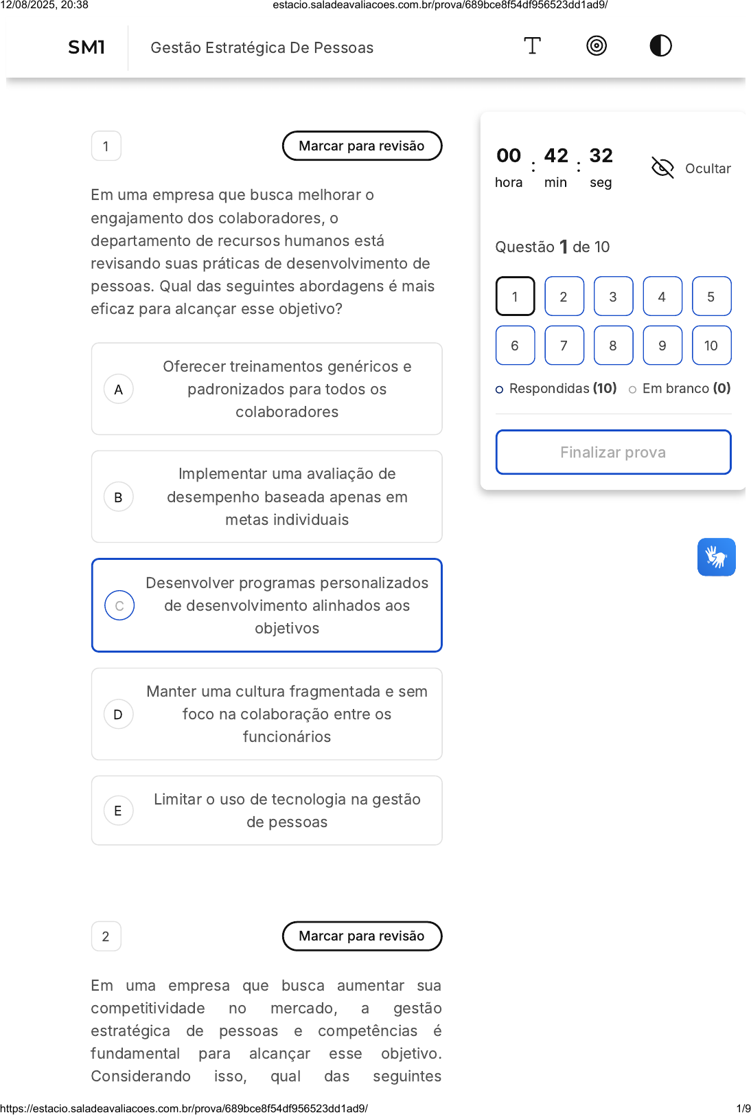 A B C D E 1 Marcar para revisão Em uma empresa que busca melhorar o engajamento dos colaboradores, o departamento de recursos humanos está revisando suas práticas de desenvolvimento de pessoas. Qual das seguintes abordagens é mais eficaz para alcançar esse objetivo? Oferecer treinamentos genéricos e padronizados para todos os colaboradores Implementar uma avaliação de desempenho baseada apenas em metas individuais Desenvolver programas personalizados de desenvolvimento alinhados aos objetivos Manter uma cultura fragmentada e sem foco na colaboração entre os funcionários Limitar o uso de tecnologia na gestão de pessoas 2 Marcar para revisão Em uma empresa que busca aumentar sua competitividade no mercado, a gestão estratégica de pessoas e competências é fundamental para alcançar esse objetivo. Considerando isso, qual das seguintes 00 hora : 42 min : 32 seg Ocultar Questão 1 de 10 Respondidas (10) Em branco (0) Finalizar prova 1 2 3 4 5 6 7 8 9 10 SM1 Gestão Estratégica De Pessoas 12/08/2025, 20:38 estacio.saladeavaliacoes.com.br/prova/689bce8f54df956523dd1ad9/ https://estacio.saladeavaliacoes.com.br/prova/689bce8f54df956523dd1ad9/ 1/9 A B C D E afirmações melhor representa o papel das competências comportamentais nesse contexto? As competências comportamentais são menos importantes do que as competências técnicas na gestão estratégica de pessoas A gestão estratégica de pessoas não considera as competências comportamentais como um fator relevante para o sucesso organizacional Competências como comunicação, liderança e trabalho em equipe são essenciais para o desempenho superior dos colaboradores e para o alcance dos objetivos da empresa A gestão estratégica de pessoas prioriza apenas as competências técnicas dos colaboradores, negligenciando as competências comportamentais A gestão estratégica de pessoas se concentra exclusivamente na identificação e no desenvolvimento de competências técnicas dos colaboradores 3 Marcar para revisão (FCC, 2011 - adaptado). A gestão estratégica de pessoas tem cada vez maior destaque nas empresas. São características de um desempenho excelente de pessoas na óptica da gestão estratégica de recursos humanos: 12/08/2025, 20:38 estacio.saladeavaliacoes.com.br/prova/689bce8f54df956523dd1ad9/ https://estacio.saladeavaliacoes.com.br/prova/689bce8f54df956523dd1ad9/ 2/9 A B C D E orientação para o serviço, reação à concorrência e estrutura hierarquizada. orientação para a função, utilização abusiva das pessoas e integração vertical. utilização das pessoas como recursos, orientação para a empresa e estruturação em rede. organização horizontal, orientação para a relação custo/preço e qualidade. integração de pessoas como parceiras, orientação para os resultados e atuação por meio de alianças estratégicas. 4 Marcar para revisão (CAIP-IMES, 2016- Adaptada). O planejamento de Gestão de pessoas está atrelado ao planejamento estratégico da organização. Para que esse seja útil ao atingimento dos objetivos estratégicos da organização, esse precisa ser patrocinado pela Alta gestão da organização. Partindo desse ideia de adequação e patrocínio da alta gestão, aponte qual a finalidade do Planejamento Estratégico de Gestão de Pessoas (Recursos Humanos): 12/08/2025, 20:38 estacio.saladeavaliacoes.com.br/prova/689bce8f54df956523dd1ad9/ https://estacio.saladeavaliacoes.com.br/prova/689bce8f54df956523dd1ad9/ 3/9 A B C D E Identificar como a área de gestão de pessoas (recursos humanos) pode contribuir para o alcance dos objetivos e estratégias da organização e, simultaneamente, favorecer e incentivar o alcance dos objetivos individuais dos funcionários. Identificar o que a empresa pode fazer pela área de gestão de pessoas, considerando as expectativas e objetivos dos funcionários. Identificar o desempenho histórico da área de gestão de pessoas e projetar melhorias em todos os subsistemas. Identificar como a organização pode alcançar seus objetivos a partir das práticas de gestão de pessoas vigentes na organização. Identificar se as práticas de gestão de pessoas vêm contribuindo para o alcance dos objetivos e estratégias da organização. 5 Marcar para revisão Em uma empresa que deseja melhorar a eficiência de seus processos, a gestão estratégica de pessoas desempenha um papel crucial. Qual dos seguintes benefícios está mais associado a essa abordagem? 12/08/2025, 20:38 estacio.saladeavaliacoes.com.br/prova/689bce8f54df956523dd1ad9/ https://estacio.saladeavaliacoes.com.br/prova/689bce8f54df956523dd1ad9/ 4/9 A B C D E Aumento da competitividade no mercado devido ao foco exclusivo nas competências técnicas dos colaboradores Redução da qualidade dos produtos e serviços devido à falta de investimento em competências comportamentais Fortalecimento da cultura organizacional através do desenvolvimento de competências técnicas dos colaboradores Melhoria da produtividade e eficiência graças ao alinhamento das competências dos colaboradores com os objetivos da empresa Ganho de vantagem competitiva baseado unicamente na gestão financeira da organização 6 Marcar para revisão Luiz está acompanhando certo gerente para avaliação de possíveis fontes de recrutamento para a empresa. A empresa cresceu nos últimos anos e o volume de trabalho alcançou o máximo da capacidade produtiva e de atendimento que a atual estrutura suporta. Esse gerente está pensando em anunciar as novas vagas de emprego em jornal, agência especializada em recrutamento e também na internet, em sites e redes sociais. Desse modo, é correto afirmar que Luiz está auxiliando o gerente a selecionar meios e canais de comunicação para: 12/08/2025, 20:38 estacio.saladeavaliacoes.com.br/prova/689bce8f54df956523dd1ad9/ https://estacio.saladeavaliacoes.com.br/prova/689bce8f54df956523dd1ad9/ 5/9 A B C D E Divulgar os novos serviços da empresa. Encontrar novos fornecedores de