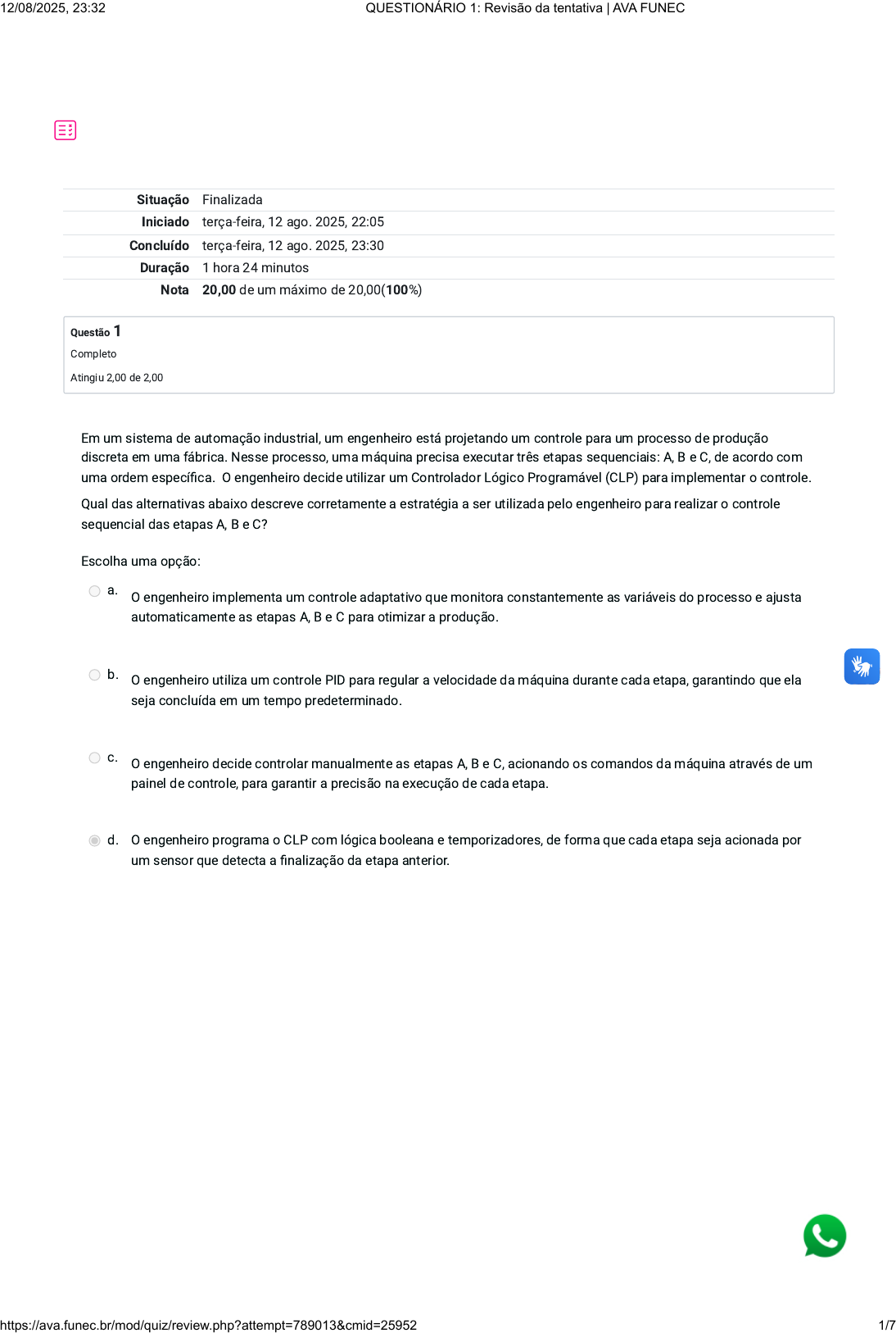 Situação Finalizada Iniciado terça-feira, 12 ago. 2025, 22:05 Concluído terça-feira, 12 ago. 2025, 23:30 Duração 1 hora 24 minutos Nota 20,00 de um máximo de 20,00(100%) Questão 1 Completo Atingiu 2,00 de 2,00 Em um sistema de automação industrial, um engenheiro está projetando um controle para um processo de produção discreta em uma fábrica. Nesse processo, uma máquina precisa executar três etapas sequenciais: A, B e C, de acordo com uma ordem específica. O engenheiro decide utilizar um Controlador Lógico Programável (CLP) para implementar o controle. Qual das alternativas abaixo descreve corretamente a estratégia a ser utilizada pelo engenheiro para realizar o controle sequencial das etapas A, B e C? Escolha uma opção: a. O engenheiro implementa um controle adaptativo que monitora constantemente as variáveis do processo e ajusta automaticamente as etapas A, B e C para otimizar a produção. b. O engenheiro utiliza um controle PID para regular a velocidade da máquina durante cada etapa, garantindo que ela seja concluída em um tempo predeterminado. c. O engenheiro decide controlar manualmente as etapas A, B e C, acionando os comandos da máquina através de um painel de controle, para garantir a precisão na execução de cada etapa. d. O engenheiro programa o CLP com lógica booleana e temporizadores, de forma que cada etapa seja acionada por um sensor que detecta a finalização da etapa anterior. 12/08/2025, 23:32 QUESTIONÁRIO 1: Revisão da tentativa | AVA FUNEC https://ava.funec.br/mod/quiz/review.php?attempt=789013&cmid=25952 1/7 Questão 2 Completo Atingiu 2,00 de 2,00 Questão 3 Completo Atingiu 2,00 de 2,00 Assinale a alternativa INCORRETA sobre os sistemas de controle industriais: Escolha uma opção: a. Nos sistemas de controle de processos por computador, diferentes algoritmos podem ser empregados, desde técnicas tradicionais, como o controle PID, até técnicas mais avançadas, como controle preditivo, controle adaptativo e técnicas de inteligência artificial. b. No controle auto operado, o controlador utiliza a energia do processo para operar o controle. c. O controle PID é mais comum em sistemas de controle discretos, enquanto a lógica booleana e os CLPs são mais utilizados em sistemas de controle contínuos. d. O controle preditivo possui a estratégia de antecipar os efeitos de perturbações que são capazes de prejudicar o processo, através das leituras de parâmetros feita por sensores. Relacione as colunas a seguir e marque a opção que representa, respectivamente, a numeração obtida de cima para baixo: (1) Sensor discreto (2) Sensor ativo (3) Atuador contínuo (4) Conversor analógico-digital ( ) Dispositivo que responde ao estímulo de entrada e produz uma saída sem a necessidade de energia externa. ( ) Dispositivo capaz de gerar, em resposta ao sinal de controle, um movimento ou outro parâmetro físico em uma faixa contínua de valores. ( ) Dispositivo que converte um estímulo físico ou uma variável de interesse em uma saída que pode ter somente determinados valores em uma faixa de valores. ( ) Dispositivo que em seu funcionamento utiliza as etapas de amostragem, quantização e codificação. Escolha uma opção: a. 4, 1, 3 e 2 b. 1, 2, 4 e 3 c. 2, 3, 1 e 4 d. 3, 4, 2 e 1 12/08/2025, 23:32 QUESTIONÁRIO 1: Revisão da tentativa | AVA FUNEC https://ava.funec.br/mod/quiz/review.php?attempt=789013&cmid=25952 2/7 Questão 4 Completo Atingiu 2,00 de 2,00 Questão 5 Completo Atingiu 2,00 de 2,00 As alternativas a seguir representam vantagens da aplicação em sistemas de produção, EXCETO: Escolha uma opção: a. Aumentar a complexidade do sistema de produção e agregar valor ao produto final. b. Aumentar a segurança do trabalhador. c. Reduzir ou eliminar as rotinas manuais. d. Diminuir o tempo de produção. Assinale a alternativa CORRETA sobre automação e sistemas de produção: Escolha uma opção: a. A automação em sistemas de produção envolve o uso de tecnologias e sistemas para controlar, monitorar e otimizar os processos de produção industrial. b. Um dos elementos básicos de um sistema automatizado é o programa de instruções, que consiste em um sistema que faz com que o processo execute sua função, como o objetivo de realizar alguma operação de produção. c. As empresas realizam projetos de automação com o objetivo exclusivo de aumentar a produtividade. d. Um sistema de automação é um conjunto de pessoas, equipamentos e procedimentos organizados para realizar as operações de produção de uma empresa ou organização. 12/08/2025, 23:32 QUESTIONÁRIO 1: Revisão da tentativa | AVA FUNEC https://ava.funec.br/mod/quiz/review.php?attempt=789013&cmid=25952 3/7 Questão 6 Completo Atingiu 2,00 de 2,00 Questão 7 Completo Atingiu 2,00 de 2,00 Assinale a alternativa CORRETA sobre componentes de hardware para automação e controle de processos: Escolha uma opção: a. Em um conversor analógico-digital ADC, conforme o número de bits aumenta, a taxa de amostragem aumenta (o que é bom), mas, em contrapartida, a resolução do ADC diminui (o que é ruim). b. Atuadores hidráulicos convertem a energia hidráulica em energia elétrica. São recomendados quando grandes forças são necessárias e por isso são comuns em sistemas de maquinário pesado. c. Válvulas solenoides e chaves eletromecânicas são exemplos de atuadores contínuos. d. Os dispositivos digitais produzem um sinal de saída tanto na forma de um conjunto de bits paralelos como na forma de uma série de pulsos. A comunicação digital obedece a protocolos específicos de comunicação, como: o fieldbus, o profibus e o HART. Assinale a alternativa INCORRETA sobre o controle proporcional-integral-derivativo PID: Escolha uma opção: a. A ação proporcional tem a capacidade de trazer a variável controlada para um novo valor estacionária mais próximo ao set point, com um erro chamado de offset. b. A ação derivativa aumenta o amortecime
