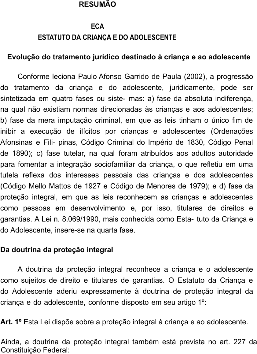 RESUMÃO ECA ESTATUTO DA CRIANÇA E DO ADOLESCENTE Evolução do tratamento jurídico destinado à criança e ao adolescente Conforme leciona Paulo Afonso Garrido de Paula (2002), a progressão do tratamento da criança e do adolescente, juridicamente, pode ser sintetizada em quatro fases ou siste- mas: a) fase da absoluta indiferença, na qual não existiam normas direcionadas às crianças e aos adolescentes; b) fase da mera imputação criminal, em que as leis tinham o único fim de inibir a execução de ilícitos por crianças e adolescentes (Ordenações Afonsinas e Fili- pinas, Código Criminal do Império de 1830, Código Penal de 1890); c) fase tutelar, na qual foram atribuídos aos adultos autoridade para fomentar a integração sociofamiliar da criança, o que refletiu em uma tutela reflexa dos interesses pessoais das crianças e dos adolescentes (Código Mello Mattos de 1927 e Código de Menores de 1979); e d) fase da proteção integral, em que as leis reconhecem as crianças e adolescentes como pessoas em desenvolvimento e, por isso, titulares de direitos e garantias. A Lei n. 8.069/1990, mais conhecida como Esta- tuto da Criança e do Adolescente, insere-se na quarta fase. Da doutrina da proteção integral A doutrina da proteção integral reconhece a criança e o adolescente como sujeitos de direito e titulares de garantias. O Estatuto da Criança e do Adolescente aderiu expressamente à doutrina de proteção integral da criança e do adolescente, conforme disposto em seu artigo 1º: Art. 1º Esta Lei dispõe sobre a proteção integral à criança e ao adolescente. Ainda, a doutrina da proteção integral também está prevista no art. 227 da Constituição Federal: Art. 227. É dever da família, da sociedade e do Estado assegurar à criança, ao adolescente e ao jovem, com absoluta prioridade, o direito à vida, à saúde, à ali- mentação, à educação, ao lazer, à profissionalização, à cultura, à dignidade, ao respeito, à liberdade e à convivência familiar e comunitária, além de colocá-los a salvo de toda forma de negligência, discriminação, exploração, violência, cruelda- de e opressão. APLICAÇÃO DO ECA Criança: É a pessoa com até 12 anos de idade incompletos. Somente são submeti- das a medidas de proteção. Adolescente: É a pessoa entre 12 e 18 anos de idade. São submetidas a medidas de proteção e a medidas socioeducativas. AGENTES DE PROTEÇÃO É dever da família, da comunidade, da sociedade em geral e do poder público asse- gurar os direitos da criança e do adolescente com absoluta prioridade. DIREITOS FUNDAMENTAIS *Direito à vida e à saúde São direitos da criança e do adolescente relacionados à vida e à saúde: Garantia de condições adequadas para o aleitamento materno pelo poder público, instituições e empregadores, inclusive aos filhos de mães submetidas a medida privativa de liberdade; • Assistência psicológica à gestante e à mãe, no período pré e pós-natal, inclusive como forma de prevenir ou minorar as consequências do estado puerperal. A assistência psicológica também deve ser prestada a gestantes e mães que manifestem interesse em entregar seus filhos para adoção, bem como a gestantes e mães que se encontrem em situação de privação de liberdade; • Manutenção, nos hospitais, dos prontuários individuais por um prazo de 18 anos; • Vacinação obrigatória das crianças nos casos recomendados pelas autoridades sanitárias. *Do direito à liberdade, ao respeito e à dignidade O direito da criança e do adolescente à liberdade compreende os seguintes aspectos: • ir, vir e estar nos logradouros públicos e espaços comunitários, ressalvadas as restrições legais; • opinião e expressão; • crença e culto religioso; • brincar, praticar esportes e divertir-se; • participar da vida familiar e comunitária, sem discriminação; • participar da vida política, na forma da lei; • buscar refúgio, auxílio e orientação Castigo físico ou tratamento cruel ou degradante O ECA, em seu artigo 18-A, dispõe que a criança e o adolescente têm o direito de ser educados e cuidados sem o uso de castigo físico ou de tratamento cruel ou degradante, como formas de correção, disciplina, educação ou qualquer outro pretexto. É considerado castigo físico: ação de natureza disciplinar ou punitiva aplicada com o uso da força física sobre a criança ou o adolescente que resulte em: A_ sofrimento físico; ou B_ lesão. Já o tratamento cruel ou degradante é a conduta ou forma cruel de tratamento em relação à criança ou ao adolescente que: A_ humilhe; ou B_ ameace gravemente; ou C_ ridicularize. Os casos de suspeita ou confirmação de castigo físico, de tratamento cruel ou degradante e de maus-tratos contra criança ou adolescente devem ser obrigatoriamente comunicados ao Conselho Tutelar da respectiva localidade. Em casos de castigo físico ou tratamento cruel ou degradante praticados por qualquer pessoa encarregada de cuidar de crianças e de adolescentes, caberá ao Conselho Tutelar aplicar as seguintes medidas: I – encaminhamento a programa oficial ou comunitário de proteção à família; II – encaminhamento a tratamento psicológico ou psiquiátrico; III – encaminhamento a cursos ou programas de orientação; IV – obrigação de encaminhar a criança a tratamento especializado; V – advertência; VI – garantia de tratamento de saúde especializado à vítima. *Do direito à convivência familiar e comunitária • Programa de acolhimento familiar ou institucional: a situação deverá ser reava- liada a cada 3 (três) meses. • Período de acolhimento institucional: máximo de 18 (dezoito meses), salvo compro- vada necessidade. • Mãe ou pai privado de liberdade: será garantida a convivência da criança e do ado- lescente por meio de visitas periódicas, independentemente de autorização judicial. Adoção Nos casos em que a gestante ou a mãe manif