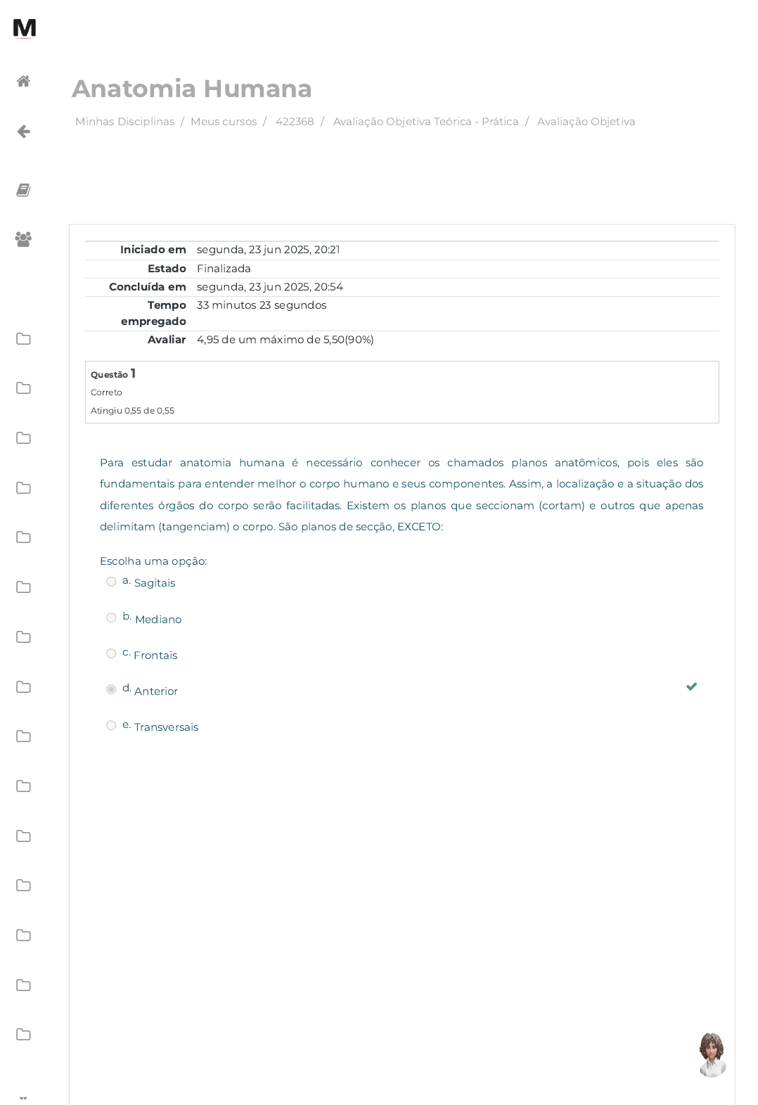 Minhas Disciplinas / Meus cursos / 422368 / Avaliação Objetiva Teórica - Prática / Avaliação Objetiva Anatomia Humana Iniciado em segunda, 23 jun 2025, 20:21 Estado Finalizada Concluída em segunda, 23 jun 2025, 20:54 Tempo empregado 33 minutos 23 segundos Avaliar 4,95 de um máximo de 5,50(90%) Questão 1 Correto Atingiu 0,55 de 0,55 Para estudar anatomia humana é necessário conhecer os chamados planos anatômicos, pois eles são fundamentais para entender melhor o corpo humano e seus componentes. Assim, a localização e a situação dos diferentes órgãos do corpo serão facilitadas. Existem os planos que seccionam (cortam) e outros que apenas delimitam (tangenciam) o corpo. São planos de secção, EXCETO: Escolha uma opção: a. Sagitais b. Mediano c. Frontais d. Anterior  e. Transversais                     https://avap.multivix.edu.br/my/ https://avap.multivix.edu.br/course/view.php?id=33968 https://avap.multivix.edu.br/course/view.php?id=33968§ion=8 https://avap.multivix.edu.br/mod/quiz/view.php?id=1889701 https://avap.multivix.edu.br/my/ https://avap.multivix.edu.br/course/view.php?id=33968 https://avap.multivix.edu.br/user/index.php?id=33968 https://avap.multivix.edu.br/course/view.php?id=33968§ion=1 https://avap.multivix.edu.br/course/view.php?id=33968§ion=2 https://avap.multivix.edu.br/course/view.php?id=33968§ion=3 https://avap.multivix.edu.br/course/view.php?id=33968§ion=4 https://avap.multivix.edu.br/course/view.php?id=33968§ion=5 https://avap.multivix.edu.br/course/view.php?id=33968§ion=6 https://avap.multivix.edu.br/course/view.php?id=33968§ion=7 https://avap.multivix.edu.br/course/view.php?id=33968§ion=8 https://avap.multivix.edu.br/course/view.php?id=33968§ion=9 https://avap.multivix.edu.br/course/view.php?id=33968§ion=10 https://avap.multivix.edu.br/course/view.php?id=33968§ion=11 https://avap.multivix.edu.br/course/view.php?id=33968§ion=12 https://avap.multivix.edu.br/course/view.php?id=33968§ion=13 https://avap.multivix.edu.br/course/view.php?id=33968§ion=14 https://avap.multivix.edu.br/course/view.php?id=33968§ion=15 https://avap.multivix.edu.br/hooks/portal/ https://avap.multivix.edu.br/ https://avap.multivix.edu.br/ https://avap.multivix.edu.br/ https://avap.multivix.edu.br/ https://avap.multivix.edu.br/ https://avap.multivix.edu.br/ Questão 2 Correto Atingiu 0,55 de 0,55 Questão 3 Correto Atingiu 0,55 de 0,55 Uma pessoa adulta possui 206 ossos que, em conjunto, formam o esqueleto. Esses ossos podem ser classificados, de acordo com seu formato, em longos, curtos, laminares, irregulares e sesamoides. Marque a alternativa que indica corretamente o nome de um osso longo, um laminar e um irregular, respectivamente Escolha uma opção: a. Ossos do carpo, escápula e úmero b. Rádio, vértebras e escápula c. Patela, úmero e ossos do crânio d. Fíbula, ossos do crânio e vértebras  e. Ulna, patela e vértebras O sistema articular humano é dividido estruturalmente em articulação fibrosa, cartilagínea e sinovial. Entre elas, as articulações do tipo sinovial apresentam como característica: Escolha uma opção: a. Uma grande quantidade de tecido conjuntivo que pode formar ligamento ou membrana interóssea, além de apresentar pouca amplitude de movimentos articulares b. Cartilagem hialina entre os ossos que se articulam, algumas das quais são temporárias e formam lâminas epifisial. Este tipo de articulação é encontrada na caixa torácica c. Uma fina camada de tecido conjuntivo denso e irregular que une os ossos que se articulam e são encontradas apenas na região do crânio d. Tecido conjuntivo e fibroso que permitem às articulações apenas mobilidade reduzido e. Superfícies ósseas articuladas com uma cápsula articular formada por estruturas cartilagíneas e membranosa que produz fluído viscoso e reduz o atrito entre as articulações                      https://avap.multivix.edu.br/my/ https://avap.multivix.edu.br/course/view.php?id=33968 https://avap.multivix.edu.br/user/index.php?id=33968 https://avap.multivix.edu.br/course/view.php?id=33968§ion=1 https://avap.multivix.edu.br/course/view.php?id=33968§ion=2 https://avap.multivix.edu.br/course/view.php?id=33968§ion=3 https://avap.multivix.edu.br/course/view.php?id=33968§ion=4 https://avap.multivix.edu.br/course/view.php?id=33968§ion=5 https://avap.multivix.edu.br/course/view.php?id=33968§ion=6 https://avap.multivix.edu.br/course/view.php?id=33968§ion=7 https://avap.multivix.edu.br/course/view.php?id=33968§ion=8 https://avap.multivix.edu.br/course/view.php?id=33968§ion=9 https://avap.multivix.edu.br/course/view.php?id=33968§ion=10 https://avap.multivix.edu.br/course/view.php?id=33968§ion=11 https://avap.multivix.edu.br/course/view.php?id=33968§ion=12 https://avap.multivix.edu.br/course/view.php?id=33968§ion=13 https://avap.multivix.edu.br/course/view.php?id=33968§ion=14 https://avap.multivix.edu.br/course/view.php?id=33968§ion=15 https://avap.multivix.edu.br/hooks/portal/ https://avap.multivix.edu.br/ https://avap.multivix.edu.br/ https://avap.multivix.edu.br/ https://avap.multivix.edu.br/ https://avap.multivix.edu.br/ https://avap.multivix.edu.br/ Questão 4 Correto Atingiu 0,55 de 0,55 Questão 5 Correto Atingiu 0,55 de 0,55 Questão 6 Correto Atingiu 0,55 de 0,55 A membrana interóssea não só evita um deslocamento paralelo, entre o rádio e a ulna, mas também transmite as pressões e trações de um osso para outro. A membrana interóssea é uma articulação do tipo : Escolha uma opção: a. Sinovial b. Cartilagínea c. Sindesmose  d. Sincondrose e. Sínfise Marque a alternativa que indica corretamente o nome do órgão muscular que apresenta cerca de 25 cm de comprimento e garante que o alimento siga da faringe em direção ao estômago: Escolha uma opção: a. Traqueia b. Intestino grosso c. Intestino delgado d. Esôfago  e. Laringe Sobre a anatomia dos ossos longos, assinale a alternativa INCORRETA: Escolha uma opção: a. Composto apenas por subs
