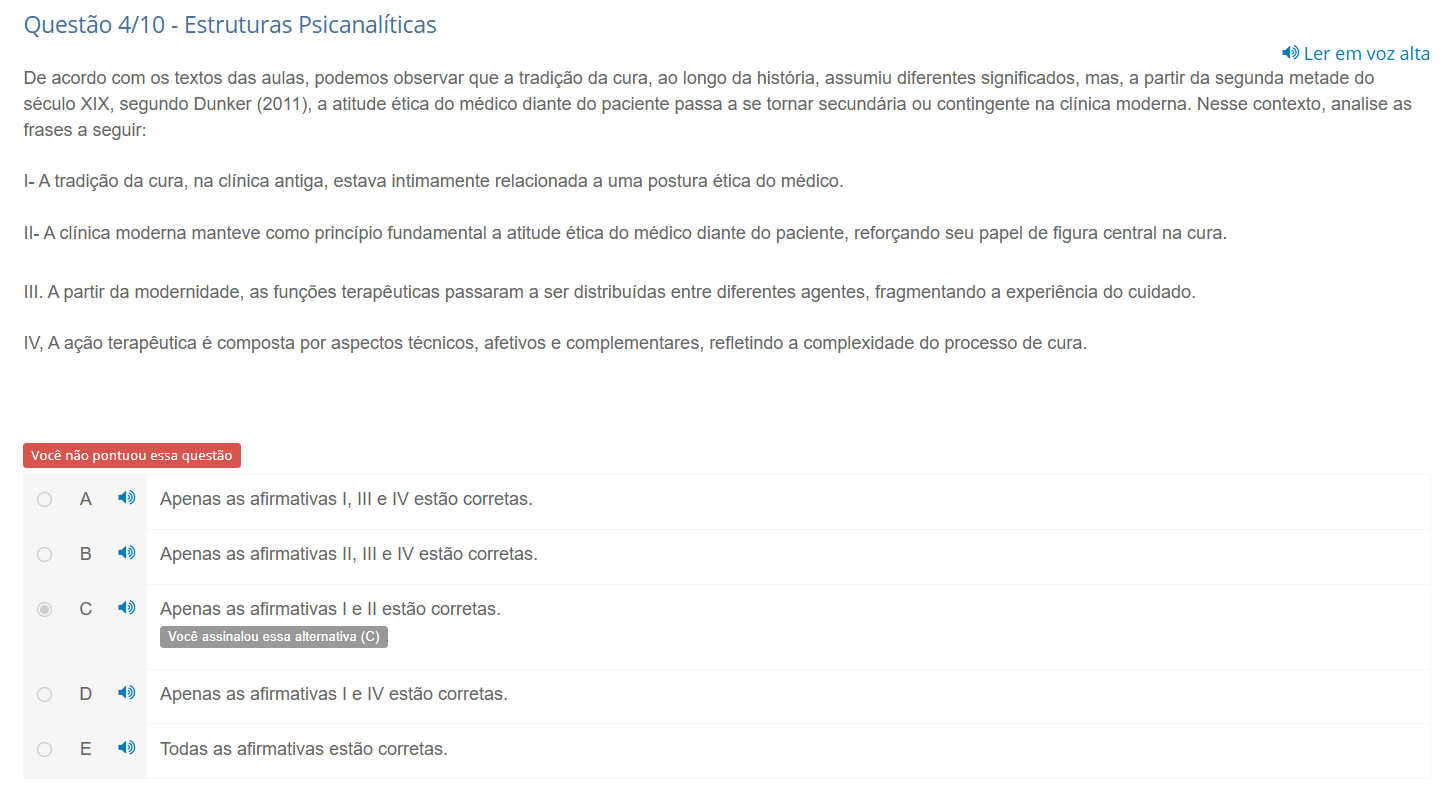 Questão 4/10 Estruturas Psicanalíticas Ler em voz alta De acordo com textos das aulas, podemos observar que a tradição da cura, ao longo da história, assumiu diferentes significados, mas, a partir da segunda metade do século XIX, segundo Dunker (2011), a atitude ética do médico diante do paciente passa a se tornar secundária ou contingente na clínica moderna. Nesse contexto, analise as frases a seguir: I- A tradição da cura, na clínica antiga, estava intimamente relacionada a uma postura ética do médico. II- A clínica moderna manteve como princípio fundamental a atitude ética do médico diante do paciente, reforçando seu papel de figura central na cura. III. A partir da modernidade, as funções terapêuticas passaram a ser distribuídas entre diferentes agentes, fragmentando a experiência do cuidado. IV, A ação terapêutica é composta por aspectos técnicos, afetivos e complementares, refletindo a complexidade do processo de cura. Você não pontuou essa questão A Apenas as afirmativas I, III e IV estão corretas. B Apenas as afirmativas II, III e IV estão corretas. C Apenas as afirmativas I e II estão corretas. Você assinalou essa alternativa (C) D Apenas as afirmativas I e IV estão corretas. E Todas as afirmativas estão corretas.