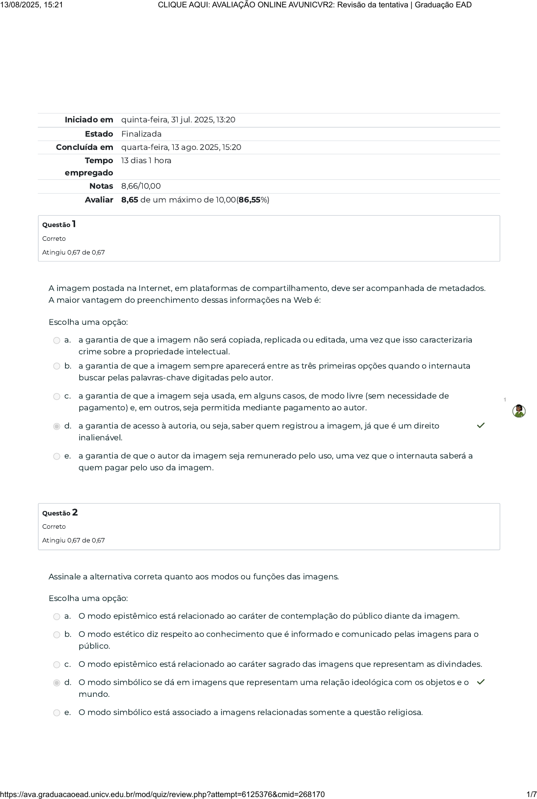 Iniciado em quinta-feira, 31 jul. 2025, 13:20 Estado Finalizada Concluída em quarta-feira, 13 ago. 2025, 15:20 Tempo empregado 13 dias 1 hora Notas 8,66/10,00 Avaliar 8,65 de um máximo de 10,00(86,55%) Questão 1 Correto Atingiu 0,67 de 0,67 Questão 2 Correto Atingiu 0,67 de 0,67 A imagem postada na Internet, em plataformas de compartilhamento, deve ser acompanhada de metadados. A maior vantagem do preenchimento dessas informações na Web é: Escolha uma opção: a. a garantia de que a imagem não será copiada, replicada ou editada, uma vez que isso caracterizaria crime sobre a propriedade intelectual. b. a garantia de que a imagem sempre aparecerá entre as três primeiras opções quando o internauta buscar pelas palavras-chave digitadas pelo autor. c. a garantia de que a imagem seja usada, em alguns casos, de modo livre (sem necessidade de pagamento) e, em outros, seja permitida mediante pagamento ao autor. d. a garantia de acesso à autoria, ou seja, saber quem registrou a imagem, já que é um direito inalienável. ✓ e. a garantia de que o autor da imagem seja remunerado pelo uso, uma vez que o internauta saberá a quem pagar pelo uso da imagem. Assinale a alternativa correta quanto aos modos ou funções das imagens. Escolha uma opção: a. O modo epistêmico está relacionado ao caráter de contemplação do público diante da imagem. b. O modo estético diz respeito ao conhecimento que é informado e comunicado pelas imagens para o público. c. O modo epistêmico está relacionado ao caráter sagrado das imagens que representam as divindades. d. O modo simbólico se dá em imagens que representam uma relação ideológica com os objetos e o mundo. ✓ e. O modo simbólico está associado a imagens relacionadas somente a questão religiosa. 1 13/08/2025, 15:21 CLIQUE AQUI: AVALIAÇÃO ONLINE AVUNICVR2: Revisão da tentativa | Graduação EAD https://ava.graduacaoead.unicv.edu.br/mod/quiz/review.php?attempt=6125376&cmid=268170 1/7 Questão 3 Correto Atingiu 0,67 de 0,67 Questão 4 Correto Atingiu 0,67 de 0,67 Questão 5 Correto Atingiu 0,67 de 0,67 As pessoas com deficiência devem ser incluídas igualmente nas aulas de educação física, participando ativamente das atividades propostas pelo professor. No entanto, o professor precisa adotar algumas adaptações. Entre as adaptações de recursos a seguir, qual delas é necessária? Escolha uma opção: a. Utilizar guizos ou sacolas plásticas nas bolas. ✓ b. Adaptar o bebedouro. c. Usar o sistema Braille apenas em último recurso. d. Utilizar a quadra sem demarcar. e. Verificar as formas de acesso. A comunicação visual aliada ao design de interiores possibilita a criação de espaços de interiores comerciais mais adequados às características de cada empreendimento. Sobre a comunicação visual nos espaços comerciais, é correto afirmar: Escolha uma opção: a. A arquitetura de espaços de interiores comerciais é definida por meio de áreas adequadas para exposição de produtos. b. Um espaço físico divergente de uma identidade visual pode contribuir para o entendimento da marca. c. A imagem de uma empresa pode ser traduzida em um espaço físico e representada por meio de seus elementos. ✓ d. Um ambiente e sua comunicação visual podem ser criados e propostos de formas desconectadas. e. A identidade de um espaço físico está desvinculada da percepção desse ambiente pelos usuários. A comunicação visual é um importante elemento para o dia a dia nas cidades. Ela está associada a vários campos, como o marketing, o design e as artes de rua. Sobre a comunicação visual, é correto afirmar: Escolha uma opção: a. Ela acontece exclusivamente por meio de palavras e textos. b. Ela é eficaz quando o receptor compreende e codifica a mensagem. ✓ c. Ela deve ser efetiva para comunicar e complexa para chegar aos consumidores. d. Ela é um aspecto independente da área da arquitetura. e. Ela pode ser compreendida somente por meio de logotipos e papelaria. 1 13/08/2025, 15:21 CLIQUE AQUI: AVALIAÇÃO ONLINE AVUNICVR2: Revisão da tentativa | Graduação EAD https://ava.graduacaoead.unicv.edu.br/mod/quiz/review.php?attempt=6125376&cmid=268170 2/7 Questão 6 Correto Atingiu 0,67 de 0,67 Questão 7 Correto Atingiu 0,67 de 0,67 Ao conceber uma imagem fotográfica, elementos de composição devem ser levados em conta. Planos e ângulos ajudam o fotógrafo a estabelecer o "recorte" que pretende dar à imagem. Eles dão sentido para a fotografia. No que se refere à fotografia aérea, pode-se afirmar que: Escolha uma opção: a. o elemento da simplicidade acaba por enfatizar os ângulos e os planos na fotografia aérea. b. quanto mais aberto o plano, mais linhas conseguirão ser registradas direcionando o espectador para o objetivo da imagem. c. os planos e ângulos somente podem ser registrados pelas objetivas normais. d. a melhor composição se dá pela consideração de três elementos principais de enquadramento: o plano, a altura e o ângulo. ✓ e. os ângulos e planos não sofrem influência pela regra dos terços. O fotojornalismo é usado como referência em outras áreas e nichos da fotografia. Isso acontece porque o profissional desse campo trabalha com algumas técnicas. Qual opção as representa? Escolha uma opção: a. Antecipação dos fatos, olhar crítico e grande profundidade de campo. b. Antecipação dos fatos, plasticidade e olhar crítico. c. Grande profundidade de campo, alto contraste e antecipação dos fatos. d. Pouca profundidade de campo, alta velocidade e antecipação dos fatos. e. Antecipação dos fatos, plasticidade e alta velocidade de resposta técnica. ✓ 1 13/08/2025, 15:21 CLIQUE AQUI: AVALIAÇÃO ONLINE AVUNICVR2: Revisão da tentativa | Graduação EAD https://ava.graduacaoead.unicv.edu.br/mod/quiz/review.php?attempt=6125376&cmid=268170 3/7 Questão 8 Correto Atingiu 0,67 de 0,67 Questão 9 Correto Atingiu 0,67 de 0,67 Para poder estabelecer uma comunicação entre as ideias d