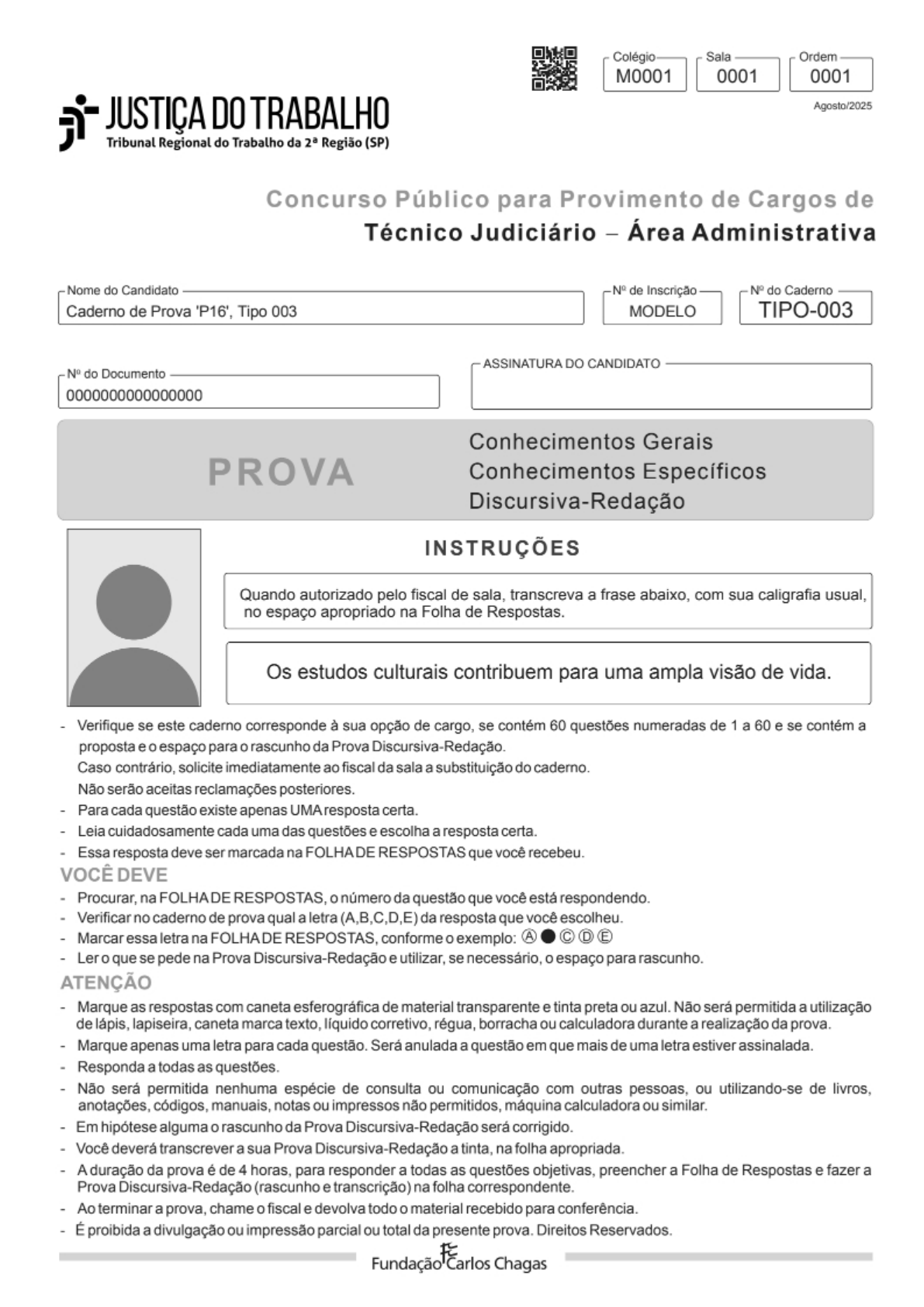 Colégio Sala Ordem M0001 0001 0001 JUSTIÇA DO TRABALHO Agosto/2025 Tribunal Regional do Trabalho da Região (SP) Concurso Público para Provimento de Cargos de Técnico Judiciário Área Administrativa Nome do Candidato de Inscrição do Caderno Caderno de Prova 'P16', Tipo 003 MODELO TIPO-003 ASSINATURA DO CANDIDATO do Documento 0000000000000000 Conhecimentos Gerais PROVA Conhecimentos Específicos Discursiva-Redação INSTRUÇÕES Quando autorizado pelo fiscal de sala, transcreva a frase abaixo, com sua caligrafia usual, no espaço apropriado na Folha de Respostas. Os estudos culturais contribuem para uma ampla visão de vida. Verifique se este caderno corresponde à sua opção de cargo, se contém 60 questões numeradas de 1 a 60 e se contém a proposta e o espaço para rascunho da Prova Discursiva-Redação. Caso contrário, solicite imediatamente ao fiscal da sala a substituição do caderno. Não serão aceitas reclamações posteriores. Para cada questão existe apenas UMA resposta certa. Leia cuidadosamente cada uma das questões e escolha a resposta certa. Essa resposta deve ser marcada na FOLHADE RESPOSTAS que você recebeu. VOCÊ DEVE Procurar, na FOLHA DE RESPOSTAS, número da questão que você está respondendo. Verificar no caderno de prova qual a letra (A,B,C,D,E) da resposta que você escolheu. Marcar essa letra na FOLHADE RESPOSTAS, conforme 0 exemplo: A Ler o que se pede na Prova Discursiva-Redação e utilizar, se necessário, 0 espaço para rascunho. ATENÇÃO Marque as respostas com caneta esferográfica de material transparente e tinta preta ou azul. Não será permitida a utilização de lápis, lapiseira, caneta marca texto, líquido corretivo, régua, borracha ou calculadora durante a realização da prova. Marque apenas uma letra para cada questão. Será anulada a questão em que mais de uma letra estiver assinalada. Responda a todas as questões. Não será permitida nenhuma espécie de consulta ou comunicação com outras pessoas, ou utilizando-se de livros, anotações, códigos, manuais, notas ou impressos não permitidos, máquina calculadora ou similar. Em hipótese alguma o rascunho da Prova Discursiva-Redação será corrigido. Você deverá transcrever a sua Prova Discursiva-Redação a tinta, na folha apropriada. - A duração da prova é de 4 horas, para responder a todas as questões objetivas, preencher a Folha de Respostas e fazer a Prova Discursiva-Redação (rascunho e transcrição) na folha correspondente. Ao terminar a prova, chame 0 fiscal e devolva todo 0 material recebido para conferência. É proibida a divulgação ou impressão parcial ou total da presente prova. Direitos Reservados. Fundação Carlos ChagasCaderno de Prova 'P16', Tipo 003 CONHECIMENTOS GERAIS Língua Portuguesa Atenção: Leia o texto para responder às questões de números 1 a 6. A "caixa de Pandora" é uma metáfora usada para caracterizar ações que, menosprezando princípio da precaução, desencadeiam consequências maléficas, terríveis e irreversíveis. mito de Pandora origina-se nos poemas épicos de Hesíodo (a Teogonia), escritos durante o século VII a.C. e considerados uma das mais antigas versões sobre a origem do Universo. Zeus deu a Pandora, como presente de casamento, uma caixa (na Grécia antiga, um jarro), mas avisou-a para nunca a abrir, pois seria melhor deixá-la intocada. A vontade de abri-la superou qualquer precaução: coisas horríveis voaram para fora, incluindo ganância, inveja, ódio, dor, doença, fome, pobreza, guerra e morte. Hoje em dia, a caixa de Pandora continua sendo aberta, não por pessoas desavisadas, mas por personagens que prestam serviços em nome da ciência, da política e da economia. estão os agravos à saúde da população, à biodiversidade, ao habitat dos demais seres vivos, à preservação dos ecos- sistemas, à própria Terra como um todo. A confiança na tecnologia como panaceia para todos os males resultou em considerar a "inteligência artificial" como opção para da "inteligência natural". Efeitos adversos relativos ao ultraprocessamento dos alimentos, às transformações genéticas, às radiações eletromagnéticas continuam ainda pouco explorados. Entidades diversas subsidiam pesquisas científicas, desde que seus resultados respaldem, a priori, o que afirmam sobre seus métodos, produtos e ações. Jornalistas, influenciadores e meios de comunicação social teriam que destacar os objetivos desejáveis e colocar em debate os caminhos para alcançá-los. resgate da Terra e o resgate da humanidade são aspectos complementares e devem ser tratados simultaneamente, no espaço e no tempo, para seu apoio mútuo. A questão é que as mudanças dependem da adoção de novas formas de estar no mundo. Elas implicam apoio de dimensões interdependentes: (mundo pessoal); interativa (relações grupais); social (política, e (condições am- bientais). Existe uma sinergia entre todas essas dimensões: elas podem se congregar em torno de objetivos comuns (ecossistemas), ou se repelirem (ruptura e caos). Eis aqui a caixa de Pandora. (Adaptado de: André Francisco Pilon. Disponível em: https://jornal.usp.br. Acesso em 06/2025) 1. Por meio da frase Eis aqui a caixa de Pandora, autor alerta, sobretudo, contra (A) a crítica excessiva aos recursos da tecnologia, os quais poderiam dirimir problemas ambientais e sociais. (B) a falta de regulamentação das mídias nas redes sociais. (C) a tendência instintiva que impele o indivíduo a alterar as leis naturais do meio ambiente. (D) as ações que ignoram a proteção à saúde das pessoas e dos ecossistemas. (E) a propensão em buscar explicar os dilemas do presente por meio dos mitos gregos. 2Caderno de Prova 'P16', Tipo 003 2. A redação alternativa de um comentário baseado em trecho do texto, em que se mantém a correção gramatical, está em: (A) Tanto os objetivos desejáveis como os caminhos para alcançá-los deveriam ser debatidos por jornalistas, influe