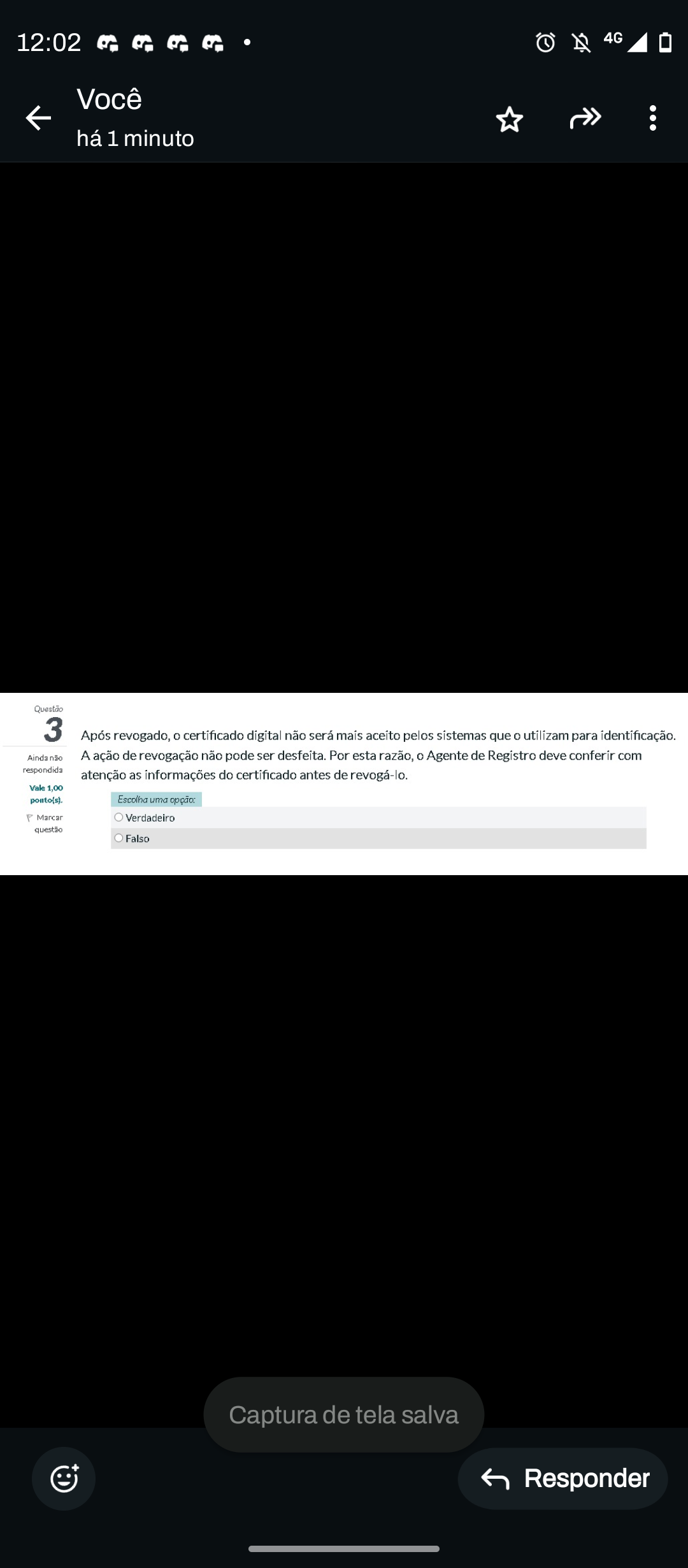 12:02 - 4G Você há 1 minuto Questão 3 Após revogado, certificado digital não será mais aceito pelos sistemas que utilizam para identificação. Ainda não A ação de revogação não pode ser desfeita. Por esta razão, Agente de Registro deve conferir com respondida atenção as informações do certificado antes de revogá-lo. Vale 1,00 ponto(s). Escolha uma opção: P Marcar Verdadeiro questão Falso Captura de tela salva Responder