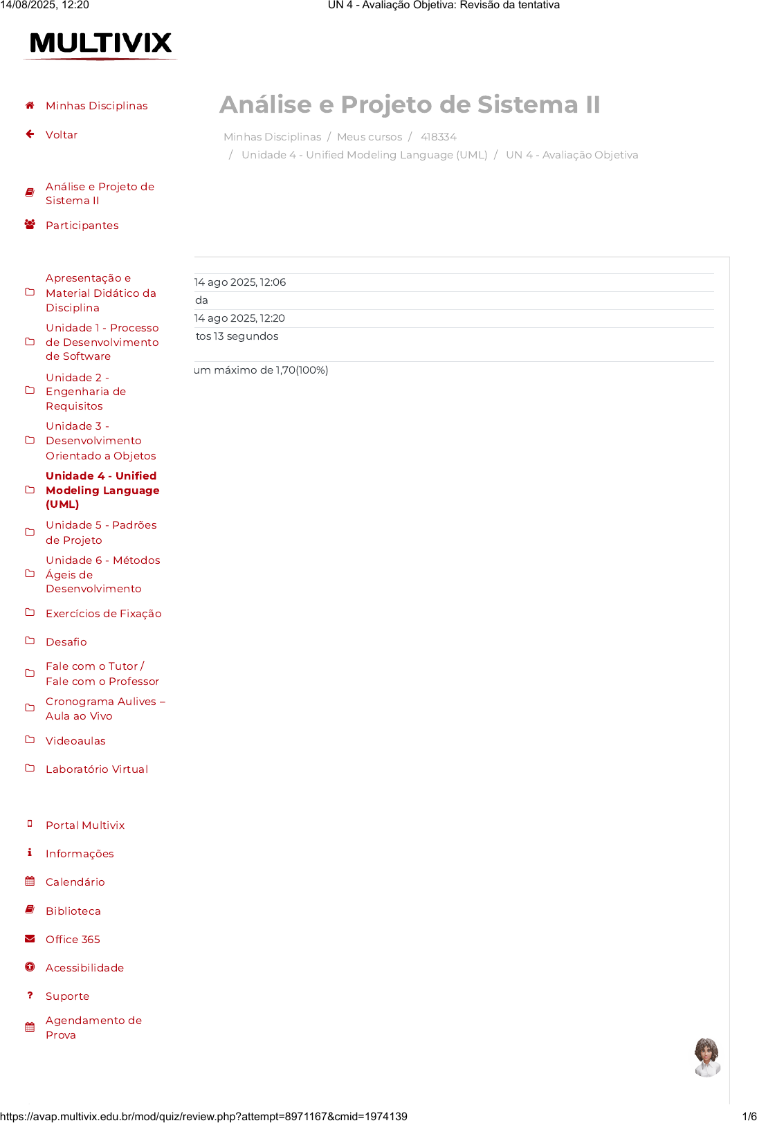 Minhas Disciplinas / Meus cursos / 418334 / Unidade 4 - Unified Modeling Language (UML) / UN 4 - Avaliação Objetiva Análise e Projeto de Sistema II Iniciado em quinta, 14 ago 2025, 12:06 Estado Finalizada Concluída em quinta, 14 ago 2025, 12:20 Tempo empregado 13 minutos 13 segundos Avaliar 1,70 de um máximo de 1,70(100%) Minhas Disciplinas Voltar Análise e Projeto de Sistema II Participantes Apresentação e Material Didático da Disciplina Unidade 1 - Processo de Desenvolvimento de Software Unidade 2 - Engenharia de Requisitos Unidade 3 - Desenvolvimento Orientado a Objetos Unidade 4 - Unified Modeling Language (UML) Unidade 5 - Padrões de Projeto Unidade 6 - Métodos Ágeis de Desenvolvimento Exercícios de Fixação Desafio Fale com o Tutor / Fale com o Professor Cronograma Aulives – Aula ao Vivo Videoaulas Laboratório Virtual Portal Multivix Informações Calendário Biblioteca Office 365 Acessibilidade Suporte Agendamento de Prova 14/08/2025, 12:20 UN 4 - Avaliação Objetiva: Revisão da tentativa https://avap.multivix.edu.br/mod/quiz/review.php?attempt=8971167&cmid=1974139 1/6 https://avap.multivix.edu.br/my/ https://avap.multivix.edu.br/course/view.php?id=36791 https://avap.multivix.edu.br/course/view.php?id=36791§ion=5 https://avap.multivix.edu.br/mod/quiz/view.php?id=1974139 https://avap.multivix.edu.br/my/ https://avap.multivix.edu.br/course/view.php?id=36791 https://avap.multivix.edu.br/user/index.php?id=36791 https://avap.multivix.edu.br/course/view.php?id=36791§ion=1 https://avap.multivix.edu.br/course/view.php?id=36791§ion=2 https://avap.multivix.edu.br/course/view.php?id=36791§ion=3 https://avap.multivix.edu.br/course/view.php?id=36791§ion=4 https://avap.multivix.edu.br/course/view.php?id=36791§ion=5 https://avap.multivix.edu.br/course/view.php?id=36791§ion=6 https://avap.multivix.edu.br/course/view.php?id=36791§ion=7 https://avap.multivix.edu.br/course/view.php?id=36791§ion=8 https://avap.multivix.edu.br/course/view.php?id=36791§ion=9 https://avap.multivix.edu.br/course/view.php?id=36791§ion=10 https://avap.multivix.edu.br/course/view.php?id=36791§ion=11 https://avap.multivix.edu.br/course/view.php?id=36791§ion=12 https://avap.multivix.edu.br/course/view.php?id=36791§ion=13 https://avap.multivix.edu.br/hooks/portal/ https://avap.multivix.edu.br/mod/page/view.php?id=1252%2F%22%20target%3D%22_blank https://avap.multivix.edu.br/calendar/view.php/ https://avap.multivix.edu.br/local/staticpage/view.php?page=biblioteca https://multivix.edu.br/office-365/ https://multivix.edu.br/acessibilidade/ https://avap.multivix.edu.br/mod/page/view.php?id=7%2F%22%20target%3D%22_blank https://docs.google.com/forms/d/e/1FAIpQLSfyH1O0KRhpI8B0cFqDv3aXT41lziF0mULzRNTBk2x0miNkNA/viewform https://avap.multivix.edu.br/ https://avap.multivix.edu.br/ https://avap.multivix.edu.br/ https://avap.multivix.edu.br/ https://avap.multivix.edu.br/ https://avap.multivix.edu.br/ https://avap.multivix.edu.br/ Questão 1 Correto Atingiu 0,34 de 0,34 Analise o diagrama a seguir. Considerando o diagrama apresentado, avalie as afirmações a seguir. I. A principal finalidade do modelo é representar a sequência das mensagens trocadas pelos objetos envolvidos. II. É possível representar a criação e a destruição explícitas de objetos neste diagrama. III. O modelo está intimamente relacionado ao diagrama de pacotes. É correto o que se afirma em Escolha uma opção: a. I e III, apenas. b. I e II, apenas. c. III, apenas. d. I, apenas. e. II, apenas. Minhas Disciplinas Voltar Análise e Projeto de Sistema II Participantes Apresentação e Material Didático da Disciplina Unidade 1 - Processo de Desenvolvimento de Software Unidade 2 - Engenharia de Requisitos Unidade 3 - Desenvolvimento Orientado a Objetos Unidade 4 - Unified Modeling Language (UML) Unidade 5 - Padrões de Projeto Unidade 6 - Métodos Ágeis de Desenvolvimento Exercícios de Fixação Desafio Fale com o Tutor / Fale com o Professor Cronograma Aulives – Aula ao Vivo Videoaulas Laboratório Virtual Portal Multivix Informações Calendário Biblioteca Office 365 Acessibilidade Suporte Agendamento de Prova 14/08/2025, 12:20 UN 4 - Avaliação Objetiva: Revisão da tentativa https://avap.multivix.edu.br/mod/quiz/review.php?attempt=8971167&cmid=1974139 2/6 https://avap.multivix.edu.br/my/ https://avap.multivix.edu.br/course/view.php?id=36791 https://avap.multivix.edu.br/user/index.php?id=36791 https://avap.multivix.edu.br/course/view.php?id=36791§ion=1 https://avap.multivix.edu.br/course/view.php?id=36791§ion=2 https://avap.multivix.edu.br/course/view.php?id=36791§ion=3 https://avap.multivix.edu.br/course/view.php?id=36791§ion=4 https://avap.multivix.edu.br/course/view.php?id=36791§ion=5 https://avap.multivix.edu.br/course/view.php?id=36791§ion=6 https://avap.multivix.edu.br/course/view.php?id=36791§ion=7 https://avap.multivix.edu.br/course/view.php?id=36791§ion=8 https://avap.multivix.edu.br/course/view.php?id=36791§ion=9 https://avap.multivix.edu.br/course/view.php?id=36791§ion=10 https://avap.multivix.edu.br/course/view.php?id=36791§ion=11 https://avap.multivix.edu.br/course/view.php?id=36791§ion=12 https://avap.multivix.edu.br/course/view.php?id=36791§ion=13 https://avap.multivix.edu.br/hooks/portal/ https://avap.multivix.edu.br/mod/page/view.php?id=1252%2F%22%20target%3D%22_blank https://avap.multivix.edu.br/calendar/view.php/ https://avap.multivix.edu.br/local/staticpage/view.php?page=biblioteca https://multivix.edu.br/office-365/ https://multivix.edu.br/acessibilidade/ https://avap.multivix.edu.br/mod/page/view.php?id=7%2F%22%20target%3D%22_blank https://docs.google.com/forms/d/e/1FAIpQLSfyH1O0KRhpI8B0cFqDv3aXT41lziF0mULzRNTBk2x0miNkNA/viewform https://avap.multivix.edu.br/ https://avap.multivix.edu.br/ https://avap.multivix.edu.br/ https://avap.multivix.edu.br/ https://avap.multivix.edu.br/ https://avap.multivix.edu.br/ https://avap.multivix.edu.br/ Questão 2 Correto Atingiu 0,34 de 0,34 Leia o texto a 