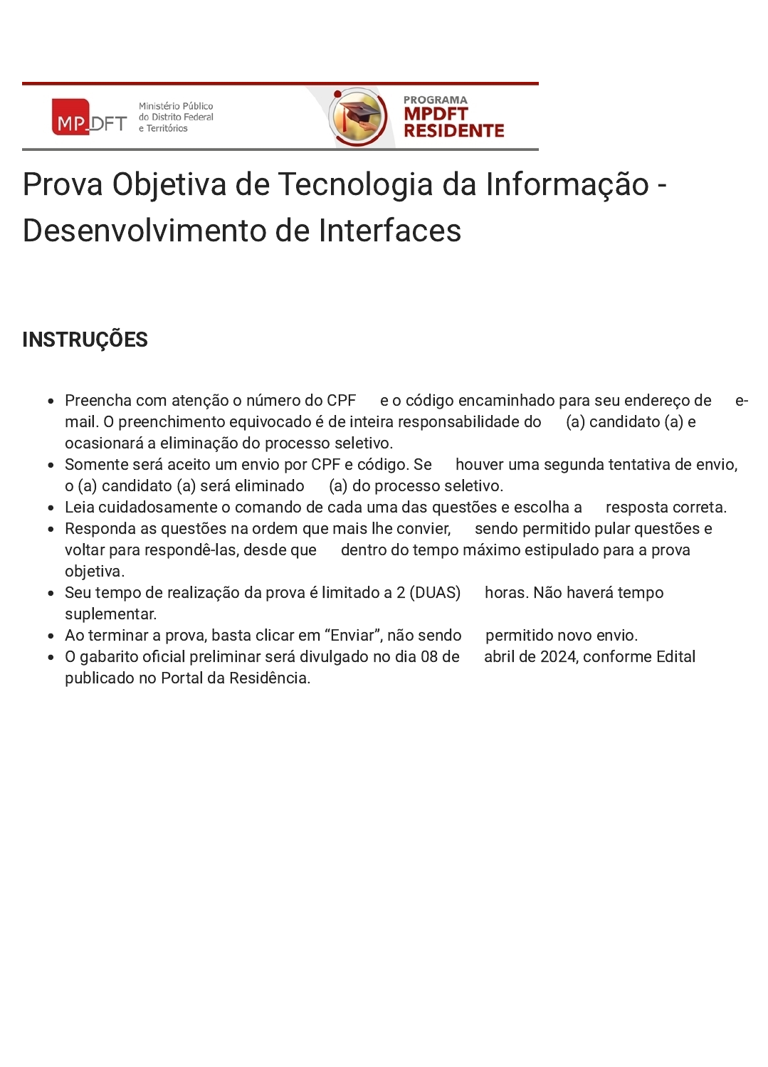 O gabarito oficial preliminar será divulgado no dia 08 de abril de 2024, conforme Edital