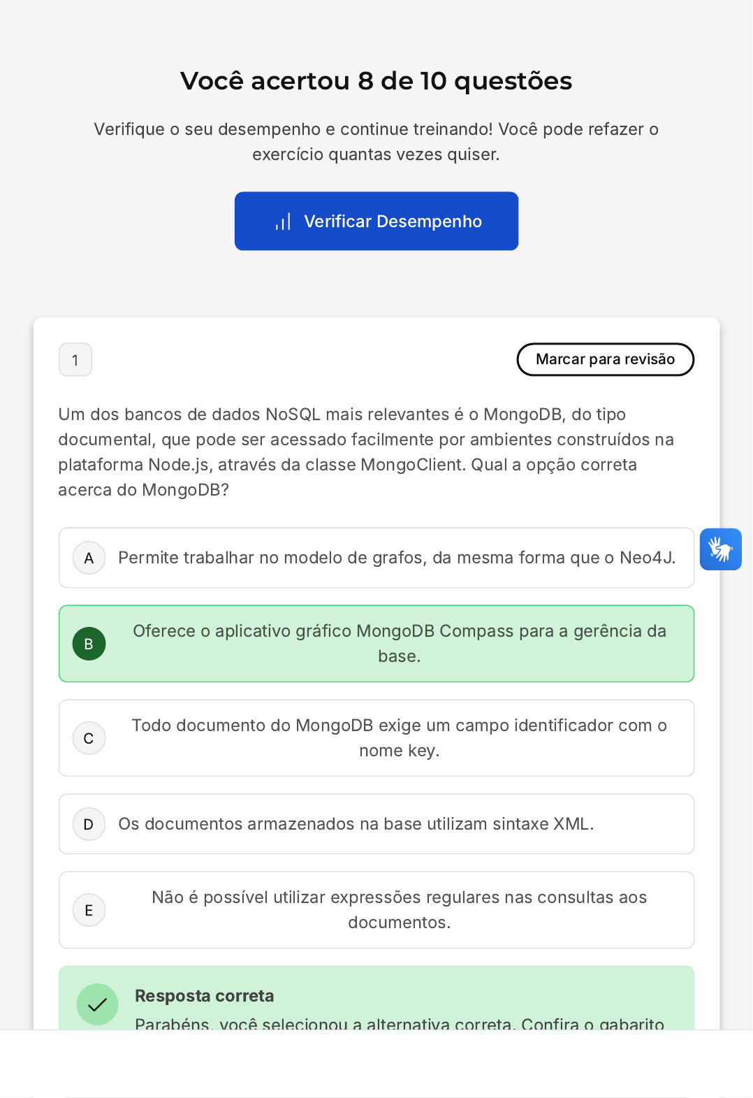Você acertou 8 de 10 questões Verifique o seu desempenho e continue treinando! Você pode refazer o exercício quantas vezes quiser. Verificar Desempenho A B C D E 1 Marcar para revisão Um dos bancos de dados NoSQL mais relevantes é o MongoDB, do tipo documental, que pode ser acessado facilmente por ambientes construídos na plataforma Node.js, através da classe MongoClient. Qual a opção correta acerca do MongoDB? Permite trabalhar no modelo de grafos, da mesma forma que o Neo4J. Oferece o aplicativo gráfico MongoDB Compass para a gerência da base. Todo documento do MongoDB exige um campo identificador com o nome key. Os documentos armazenados na base utilizam sintaxe XML. Não é possível utilizar expressões regulares nas consultas aos documentos. Resposta correta Parabéns, você selecionou a alternativa correta. Confira o gabarito comentado! A B C D E Gabarito Comentado A alternativa correta é a B, que afirma que o MongoDB oferece o aplicativo gráfico MongoDB Compass para a gerência da base. O MongoDB Compass é uma interface gráfica que permite aos usuários interagir com seus dados MongoDB de maneira visual, facilitando a compreensão e a gerência da base de dados. As outras alternativas apresentam informações incorretas ou incompletas sobre o MongoDB. 2 Marcar para revisão As bases de dados NoSQL podem oferecer diferentes formas de armazenamento e representação de dados, normalmente sem um esquema fixo, motivo pelo qual temos a classificação de seus dados como semiestruturados. Qual das opções apresentadas a seguir se refere a um banco de dados NoSQL baseado em documentos? SQL Lite Google Big Query MongoDB Hbase Neo4J Resposta correta Parabéns, você selecionou a alternativa correta. Confira o gabarito comentado! Gabarito Comentado O MongoDB é um exemplo de banco de dados NoSQL baseado em A B C D E O MongoDB é um exemplo de banco de dados NoSQL baseado em documentos. Ele armazena dados em documentos flexíveis semelhantes a JSON, o que significa que os campos podem variar entre documentos e a estrutura de dados pode ser alterada ao longo do tempo. Isso o torna uma opção popular para armazenar dados semiestruturados. As outras opções listadas não são bancos de dados NoSQL baseados em documentos. 3 Marcar para revisão Considere o trecho de código apresentado a seguir, em que db é um objeto da classe Realm, e a conexão com o banco de dados já está aberta. Qual será o resultado da execução desse trecho de código? A tabela Aluno é criada, com 2012981 bytes, sendo incluído, em seguida, o aluno com nome "Ana Maria" e alocado na sala ''102E''. Um aluno é recuperado a partir da chave, tendo seu nome e sala alterados. São excluídos do banco todos os alunos com nome ''Ana Maria'' ou que estudem na sala ''102E''. Uma pesquisa na coleção de alunos, com filtragem pelo nome e pela sala. Um aluno é adicionado à coleção existente no banco de dados. Resposta correta Parabéns, você selecionou a alternativa correta. Confira o gabarito comentado! A B C D E Gabarito Comentado A resposta certa é: Um aluno é recuperado a partir da chave, tendo seu nome e sala alterados. 4 Marcar para revisão Assim como em diversos tipos de bancos de dados, no SQLite temos um conjunto de tabelas de catálogo, responsáveis pelo armazenamento de dados estruturais, registros de planos de execução e dados de controle. Qual das tabelas de catálogo do SQLite está associada ao controle dos valores de autoincremento? sqlite_master sqlite_counter sqlite_sequence sqlite_keygen sqlite_stat1 Resposta correta Parabéns, você selecionou a alternativa correta. Confira o gabarito comentado! Gabarito Comentado A tabela de catálogo do SQLite que está associada ao controle dos valores de autoincremento é a sqlite_sequence. Esta tabela é responsável por armazenar os valores de autoincremento para cada tabela no banco de dados SQLite. Quando um novo registro é inserido em uma tabela com uma A B C D E g coluna autoincrementada, o SQLite consulta a tabela sqlite_sequence para determinar o próximo valor a ser usado. Portanto, a alternativa correta é a 'C'. 5 Marcar para revisão Suponha que você precisa exibir os dados de uma coleção de entidades recuperadas de um arquivo texto, com armazenamento no formato chave-valor, e o componente adotado para a visualização será o FlatList. Se o campo de identificação da entidade não seguir o padrão do FlatList, você deverá associar um método para extração da chave a qual atributo do componente? data keyExtractor style renderItem contentContainerStyle Resposta correta Parabéns, você selecionou a alternativa correta. Confira o gabarito comentado! Gabarito Comentado O atributo correto para associar um método de extração da chave, quando o campo de identificação da entidade não segue o padrão do FlatList, é o 'keyExtractor'. Este atributo é utilizado para definir uma propriedade única para cada item da lista, facilitando a identificação e manipulação dos dados. Portanto, a alternativa correta é a 'B', que indica o atributo 'keyExtractor' A B C D E 'keyExtractor'. 6 Marcar para revisão A linguagem SQL é muito eficaz para as consultas complexas, e boa parte do sucesso se deve ao conjunto de operadores disponibilizados para a filtragem, através da cláusula WHERE. Qual dos operadores a seguir permite buscar os nomes iniciados por uma letra específica? IN LIKE ANY ALL NOT IN Resposta correta Parabéns, você selecionou a alternativa correta. Confira o gabarito comentado! Gabarito Comentado O operador LIKE na linguagem SQL é utilizado para buscar padrões em uma coluna. Neste caso, se quisermos buscar nomes que iniciam com uma letra específica, podemos usar o operador LIKE seguido da letra desejada e o caractere '%'. Por exemplo, para buscar nomes que iniciam com a letra 'A', a consulta seria algo como: SELECT * FROM tabela WHERE nome LIKE 'A%'. Portanto, a alternativa correta é a 'B'. A B C D E 7 Marcar 