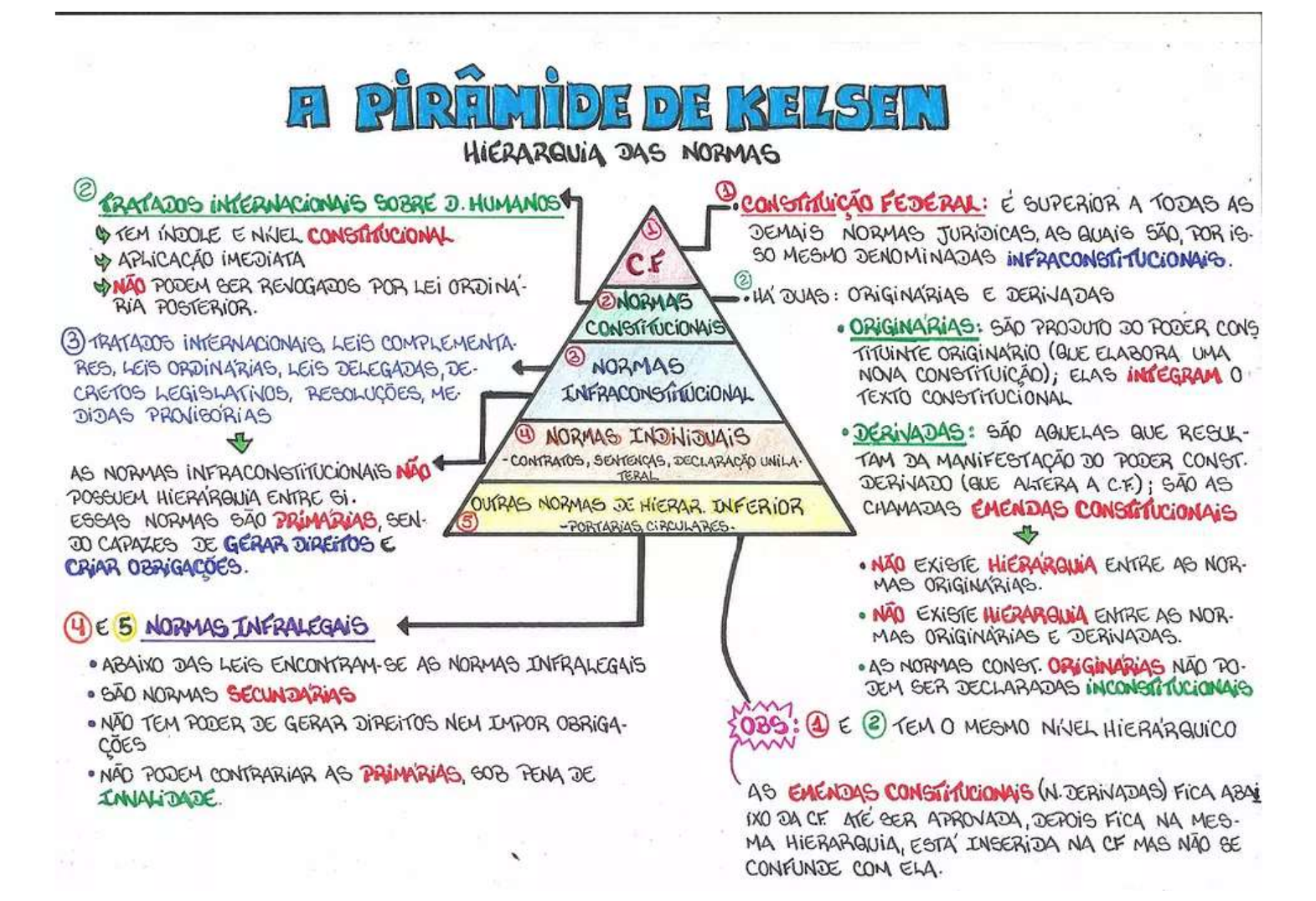 KELSEN DAS NORMAS 2 TRATADOS SOBRE D. HUMANOS FEDERAL: É SUPERiOR A TODAS AS TEM ÍNDOLE E CONSTITUCIONAL DEMAiS NORMAS AS QUAiS SÃO, POR is. so MESMO DENOMiNADAS NÃO PODEM SER POR LEi 2 RiA DUAS: E DERiVADAS SÃO PRODUTO DO PODER CONS 3 TRATADOS LEiS COMPLEMENTA. 3 TiTUiNTE (QUE ELABORA UMA RES, LEiS LEiS DELEGADAS, DE- NORMAS NOVA ELAS INTEGRAM CRETOS RESOLUÇÕES, ME. TEXTO DiDAS NORMAS SÃO QUE RESUL- AS NORMAS NÃO CONTRATOS, SENTENÇAS, DECLARAÇÃO TAM DA DO PODER CONST. TERAL POSSUEM ENTRE Si. DERiVADO ALTERA A SÃO AS OUTRAS NORMAS DE ESSAS NORMAS SÃO SEN- 5 CHAMADAS CiRCULARES. CAPAZES DE DiREiTOS E CRiAR NÃO EXiSTE ENTRE AS NOR- MAS 4 E 5 NORMAS INFRALEGAiS NÃO EXiSTE ENTRE AS MAS E ABAiXO DAS LEiS AS NORMAS INFRALEGAiS AS NORMAS CONST. NÃO PO. SÃO NORMAS SECUNDARIAS DEM SER DECLARADAS NÃO TEM PODER DE GERAR DiREiTOS NEM IMPOR OBRiGA- 1 E 2 TEM 0 MESMO ÇÕES NÃO PODEM CONTRARiAR AS SOB PENA DE AS (N. DERiVADAS) FiCA ABAi IXO DA CF. ATÉ SER APROVADA, DEPOiS FiCA NA MES- MA HiERARQUiA, INSERiDA NA CF MAS NÃO SE CONFUNDE COM ELA.