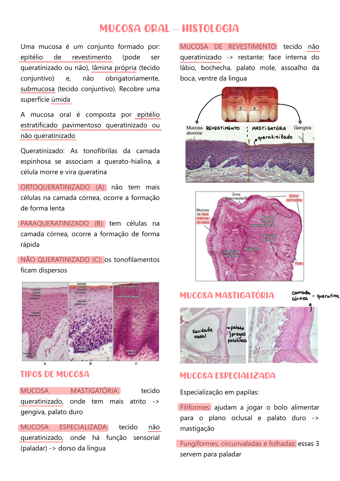 MUCOSA ORAL – HISTOLOGIA Uma mucosa é um conjunto formado por: epitélio de revestimento (pode ser queratinizado ou não), lâmina própria (tecido conjuntivo) e, não obrigatoriamente, submucosa (tecido conjuntivo). Recobre uma superfície úmida A mucosa oral é composta por epitélio estratificado pavimentoso queratinizado ou não queratinizado Queratinizado: As tonofibrilas da camada espinhosa se associam a querato-hialina, a célula morre e vira queratina ORTOQUERATINIZADO (A): não tem mais células na camada córnea, ocorre a formação de forma lenta PARAQUERATINIZADO (B): tem células na camada córnea, ocorre a formação de forma rápida NÃO QUERATINIZADO (C): os tonofilamentos ficam dispersos TIPOS DE MUCOSA MUCOSA MASTIGATÓRIA: tecido queratinizado, onde tem mais atrito -> gengiva, palato duro MUCOSA ESPECIALIZADA: tecido não queratinizado, onde há função sensorial (paladar) -> dorso da língua MUCOSA DE REVESTIMENTO: tecido não queratinizado -> restante: face interna do lábio, bochecha, palato mole, assoalho da boca, ventre da língua MUCOSA MASTIGATÓRIA MUCOSA ESPECIALIZADA Especialização em papilas: Filiformes: ajudam a jogar o bolo alimentar para o plano oclusal e palato duro -> mastigação Fungiformes, circunvaladas e folhadas: essas 3 servem para paladar MUCOSA DE REVESTIMENTO DENTE Componentes mineralizados: esmalte, dentina e cemento DESENVOLVIMENTO DO TRATO GASTROINTESTINAL ENDODÉRMICO O endoderma do intestino primitivo origina: Epitélio de revestimento do tubo digestivo (do esôfago ao canal anal proximal). Glândulas associadas (fígado, pâncreas, parte das glândulas salivares). O mesoderma esplâncnico adjacente origina: Músculo liso, tecido conjuntivo e componentes vasculares da parede. O ectoderma participa apenas nas extremidades (epitélio da boca e canal anal distal). ESÔFAGO ESQUEMA COMPARATIVO DA PAREDE DO TRATO GASTROINTESTINAL