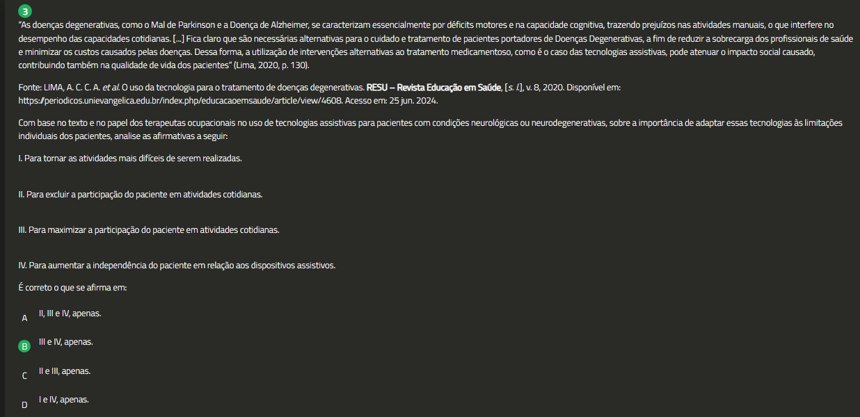 3 "As doenças degenerativas, como 0 Mal de Parkinson e a Doença de Alzheimer, se caracterizam essencialmente por déficits motores e na capacidade cognitiva, trazendo prejuízos nas atividades manuais, 0 que interfere no desempenho das capacidades cotidianas. [...] Fica claro que são necessárias alternativas para 0 cuidado e tratamento de pacientes portadores de Doenças Degenerativas, a fim de reduzir a sobrecarga dos profissionais de saúde e minimizar custos causados pelas doenças. Dessa forma, a utilização de intervenções alternativas ao tratamento medicamentoso, como é 0 caso das tecnologias assistivas, pode atenuar 0 impacto social causado, contribuindo também na qualidade de vida dos pacientes" (Lima, 2020, p. 130). Fonte: LIMA, A.C. C. A. et al. 0 uso da tecnologia para 0 tratamento de doenças degenerativas. RESU Revista Educação em Saúde, v.8, 2020. Disponível em: Acesso em: 25 jun. 2024. Com base no texto e no papel dos terapeutas ocupacionais no de tecnologias assistivas para pacientes com condições neurológicas ou neurodegenerativas, sobre a importância de adaptar essas tecnologias limitações individuais dos pacientes, analise as afirmativas a seguir: Para tornar as atividades mais difíceis de serem realizadas. II. Para excluir a participação do paciente em atividades cotidianas. III. Para maximizar a participação do paciente em atividades cotidianas. IV. Para aumentar a independência do paciente em relação aos dispositivos assistivos. É correto que se afirma em: A II, III e IV, apenas. III e IV, apenas. II e III, apenas. IV, apenas. D