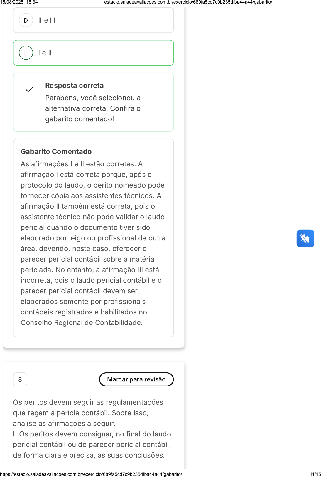 D E II e III I e II Resposta correta Parabéns, você selecionou a alternativa correta. Confira o gabarito comentado! Gabarito Comentado As afirmações I e II estão corretas. A afirmação I está correta porque, após o protocolo do laudo, o perito nomeado pode fornecer cópia aos assistentes técnicos. A afirmação II também está correta, pois o assistente técnico não pode validar o laudo pericial quando o documento tiver sido elaborado por leigo ou profissional de outra área, devendo, neste caso, oferecer o parecer pericial contábil sobre a matéria periciada. No entanto, a afirmação III está incorreta, pois o laudo pericial contábil e o parecer pericial contábil devem ser elaborados somente por profissionais contábeis registrados e habilitados no Conselho Regional de Contabilidade. 8 Marcar para revisão Os peritos devem seguir as regulamentações que regem a perícia contábil. Sobre isso, analise as afirmações a seguir. I. Os peritos devem consignar, no final do laudo pericial contábil ou do parecer pericial contábil, de forma clara e precisa, as suas conclusões. 15/08/2025, 18:34 estacio.saladeavaliacoes.com.br/exercicio/689fa5cd7c9b235dfba44a44/gabarito/ https://estacio.saladeavaliacoes.com.br/exercicio/689fa5cd7c9b235dfba44a44/gabarito/ 11/15 A B C D E II. O laudo e o parecer devem contemplar o resultado final alcançado por meio de elementos de prova inclusos nos autos ou arrecadados em diligências que o perito tenha efetuado, por intermédio de peças contábeis e quaisquer outros documentos, tipos e formas. III. Quando se tratar de laudo pericial contábil, assinado em conjunto pelos peritos, há responsabilidade individual do perito principal sobre o referido documento. Diante das afirmativas, assinale a opção correta. I II III II e III I e II Resposta correta Parabéns, você selecionou a alternativa correta. Confira o gabarito comentado! Gabarito Comentado A alternativa correta é a "E", que afirma que as afirmações I e II estão corretas. A afirmação I está correta porque, de acordo com as regulamentações da perícia contábil, os peritos devem, de fato, consignar de forma clara e precisa suas 15/08/2025, 18:34 estacio.saladeavaliacoes.com.br/exercicio/689fa5cd7c9b235dfba44a44/gabarito/ https://estacio.saladeavaliacoes.com.br/exercicio/689fa5cd7c9b235dfba44a44/gabarito/ 12/15 A B C conclusões no final do laudo pericial contábil ou do parecer pericial contábil. A afirmação II também está correta, pois o laudo e o parecer devem contemplar o resultado final alcançado por meio de elementos de prova inclusos nos autos ou arrecadados em diligências que o perito tenha efetuado, por intermédio de peças contábeis e quaisquer outros documentos, tipos e formas. No entanto, a afirmação III está incorreta, pois quando se trata de laudo pericial contábil assinado em conjunto pelos peritos, a responsabilidade é solidária, e não individual do perito principal, sobre o referido documento. 9 Marcar para revisão (CFC/2018) O Novo Código de Processo Civil - Lei n.º 13.105/2015 - instituiu regras para a elaboração do laudo pericial, que estão definidas no art. 473 desse diploma legal. Desta forma, a estrutura do laudo pericial deve contemplar: Sumário; síntese; conclusão; resposta conclusiva aos quesitos Introdução; síntese; metodologia; resposta aos quesitos e conclusão Elementos de acordo com a matéria técnica examinada 15/08/2025, 18:34 estacio.saladeavaliacoes.com.br/exercicio/689fa5cd7c9b235dfba44a44/gabarito/ https://estacio.saladeavaliacoes.com.br/exercicio/689fa5cd7c9b235dfba44a44/gabarito/ 13/15 D E A exposição do objeto da perícia; a análise técnica ou científica realizada pelo perito; indicação do método utilizado; resposta conclusiva a todos os quesitos Não tem uma estrutura pré- determinada Resposta correta Parabéns, você selecionou a alternativa correta. Confira o gabarito comentado! Gabarito Comentado O art. 473 do CPC descreve que O laudo pericial deverá conter: I. A exposição do objeto da perícia; II. A análise técnica ou científica realizada pelo perito; III. A indicação do método utilizado, esclarecendo-o e demonstrando ser predominantemente aceito pelos especialistas da área do conhecimento da qual se originou; IV. Resposta conclusiva a todos os quesitos apresentados pelo juiz, pelas partes e pelo órgão do Ministério Público 10 Marcar para revisão O Perito é essencial para o processo pericial. O perito, na função de assistente técnico, é responsável pela elaboração de : 15/08/2025, 18:34 estacio.saladeavaliacoes.com.br/exercicio/689fa5cd7c9b235dfba44a44/gabarito/ https://estacio.saladeavaliacoes.com.br/exercicio/689fa5cd7c9b235dfba44a44/gabarito/ 14/15 A B C D E Parecer pericial contábil Opinião pessoal técnica Parecer essencial contábil Parecer pessoal contábil Laudo pericial contábil Resposta correta Parabéns, você selecionou a alternativa correta. Confira o gabarito comentado! Gabarito Comentado O perito, na função de assistente técnico, é responsável pela elaboração de parecer pericial contábil. 15/08/2025, 18:34 estacio.saladeavaliacoes.com.br/exercicio/689fa5cd7c9b235dfba44a44/gabarito/ https://estacio.saladeavaliacoes.com.br/exercicio/689fa5cd7c9b235dfba44a44/gabarito/ 15/15