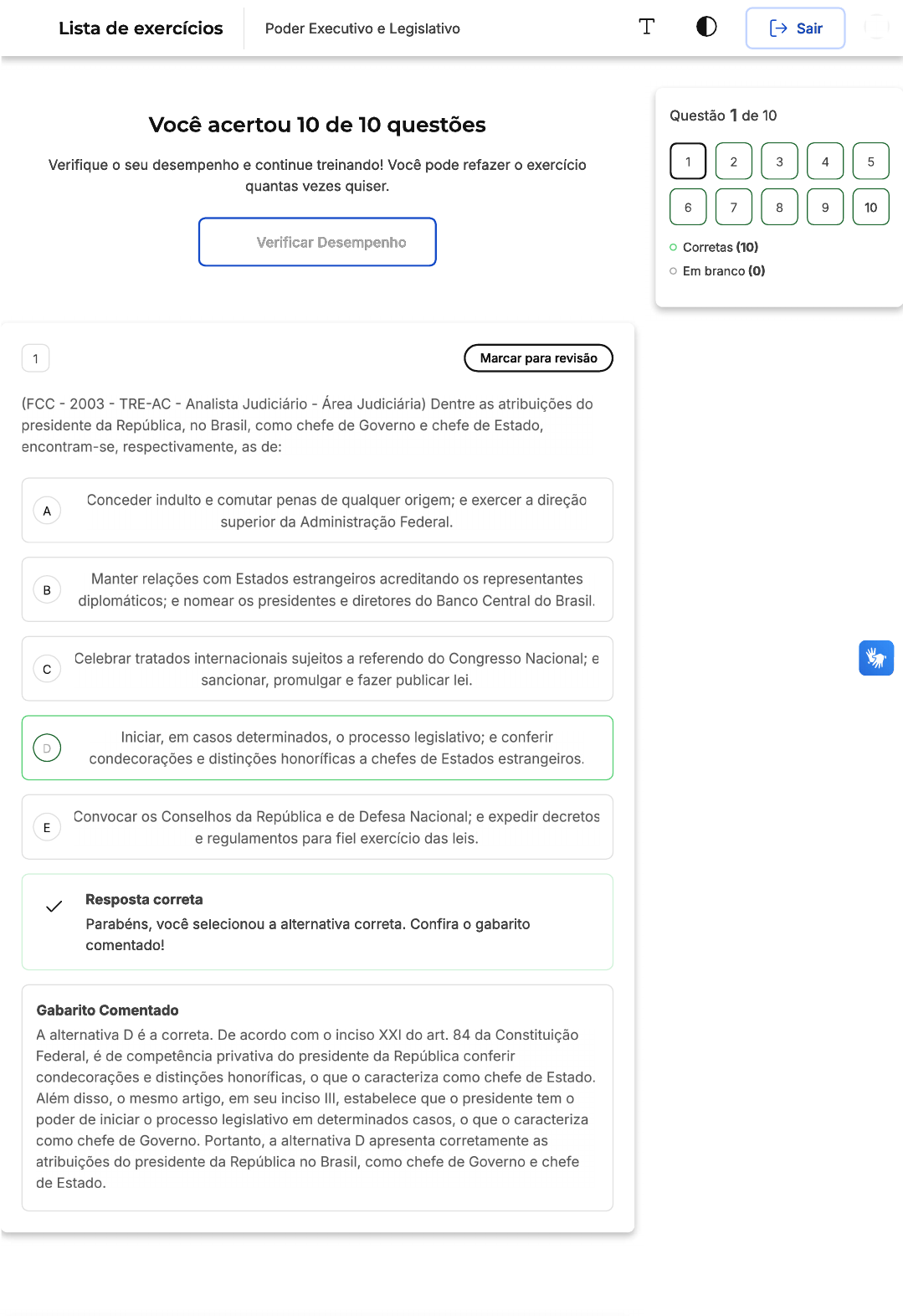 Lista de exercícios Poder Executivo e Legislativo T Sair Questão 1 de 10 Você acertou 10 de 10 questões Verifique seu desempenho e continue treinando! Você pode refazer exercício 1 2 3 4 5 quantas vezes quiser. 6 7 8 9 10 Verificar Desempenho Corretas (10) Em branco (0) 1 Marcar para revisão (FCC 2003 TRE-AC Analista Judiciário Área Judiciária) Dentre as atribuições do presidente da República, no Brasil, como chefe de Governo e chefe de Estado, encontram-se, respectivamente, as de: Conceder indulto e comutar penas de qualquer origem; e exercer a direção A superior da Administração Federal. Manter relações com Estados estrangeiros acreditando os representantes diplomáticos; e nomear os presidentes e diretores do Banco Central do Brasil. Celebrar tratados internacionais sujeitos a referendo do Congresso Nacional; e c sancionar, promulgar e fazer publicar lei. Iniciar, em casos determinados, o processo legislativo; e conferir D condecorações e distinções honoríficas a chefes de Estados estrangeiros. Convocar os Conselhos da República e de Defesa Nacional; e expedir decretos E e regulamentos para fiel exercício das leis. Resposta correta Parabéns, você selecionou a alternativa correta. Confira o gabarito comentado! Gabarito Comentado A alternativa D é a correta. De acordo com o inciso XXI do art. 84 da Constituição Federal, é de competência privativa do presidente da República conferir condecorações e distinções honoríficas, o que o caracteriza como chefe de Estado. Além disso, o mesmo artigo, em seu inciso III, estabelece que o presidente tem o poder de iniciar o processo legislativo em determinados casos, o que o caracteriza como chefe de Governo. Portanto, a alternativa D apresenta corretamente as atribuições do presidente da República no Brasil, como chefe de Governo e chefe de Estado.2 Marcar para revisão (FCC 2005 TRE-RN Técnico Judiciário Área Administrativa) Quanto ao Congresso Nacional, é correto afirmar: Cada estado e o Distrito Federal elegerão três deputados federais, para um A mandato de quatro anos. Poder Legislativo federal é bicameral e exercido pelo Congresso Nacional, que se compõe do Senado Federal e da Assembleia Legislativa. A representação de cada estado no Senado Federal será renovada de oito em c oito anos, alternadamente, por um e dois terços. Senado Federal é composto por oitenta e um senadores, eleitos para um D mandato de oito anos. Os deputados federais serão eleitos segundo o princípio majoritário e os E senadores pelo sistema proporcional. Resposta correta Parabéns, você selecionou a alternativa correta. Confira o gabarito comentado! Gabarito Comentado A alternativa D está correta, pois de acordo com o § 1° do art. 46 da Constituição Federal, cada estado e o Distrito Federal elegem três senadores, cada um com um mandato de oito anos. Isso significa que o Senado Federal é composto por 81 senadores, sendo que cada estado e o Distrito Federal contribuem com três representantes. Esses representantes têm um mandato mais longo, de oito anos, em comparação com os deputados federais, que têm um mandato de quatro anos. Portanto, a afirmação de que o Senado Federal é composto por oitenta e um senadores, eleitos para um mandato de oito anos, está correta. 3 Marcar para revisão (FCC 2009 TJ-AP - Analista Judiciário Área Judiciária Execução de Mandados) presidente da República será julgado: A Nas infrações penais comuns, pelo Superior Tribunal de Justiça. Nas infrações penais comuns, pelo Supremo Tribunal Federal. Nas infrações penais comuns, pelo Tribunal Superior Eleitoral.D Nos crimes de responsabilidade, pelo Supremo Tribunal Federal. E Nos crimes de responsabilidade, pela Câmara dos Deputados. Resposta correta Parabéns, você selecionou a alternativa correta. Confira o gabarito comentado! Gabarito Comentado De acordo com o artigo 86 da Constituição Federal, uma vez que a acusação contra o presidente da República é admitida por dois terços da Câmara dos Deputados, ele será submetido a julgamento perante o Supremo Tribunal Federal no caso de infrações penais comuns. Portanto, Supremo Tribunal Federal é o órgão responsável por julgar o presidente da República em tais circunstâncias. 4 Marcar para revisão (FCC 2008 TRT REGIÃO SP Analista Judiciário Área Administrativa) Nos crimes de responsabilidade, após ser admitida a acusação por dois terços da Câmara dos Deputados, o presidente da República será submetido a julgamento perante: A A Câmara dos Deputados. Senado Federal. c Supremo Tribunal Federal. D Superior Tribunal de Justiça. E Tribunal Superior Eleitoral. Resposta correta Parabéns, você selecionou a alternativa correta. Confira o gabarito comentado! Gabarito Comentado A alternativa é a correta. Segundo o artigo 86 da Constituição Federal, nos crimes de responsabilidade, após a acusação ser admitida por dois terços da Câmara dos Deputados, o presidente da República será submetido a julgamento perante o Senado Federal. As demais alternativas estão incorretas, pois não correspondem ao procedimento estabelecido pela Constituição para esses casos.5 Marcar para revisão presidente e o vice-presidente da República não poderão ausentar-se do País por período superior a: A Vinte dias, sem licença do Supremo Tribunal Federal. Trinta dias, sem licença do Senado Federal. c Dez dias, sem licença da Câmara dos Deputados. D Cinco dias, sem licença do Conselho da República. E Quinze dias, sem licença do Congresso Nacional. Resposta correta Parabéns, você selecionou a alternativa correta. Confira o gabarito comentado! Gabarito Comentado De acordo com o artigo 83 da Constituição Federal, tanto o presidente quanto o vice-presidente da República não podem se ausentar do país por um período que ultrapasse quinze dias sem a devida licença do Congresso Nacional. Caso contrário, eles correm o risco de perderem seus respectivos ca