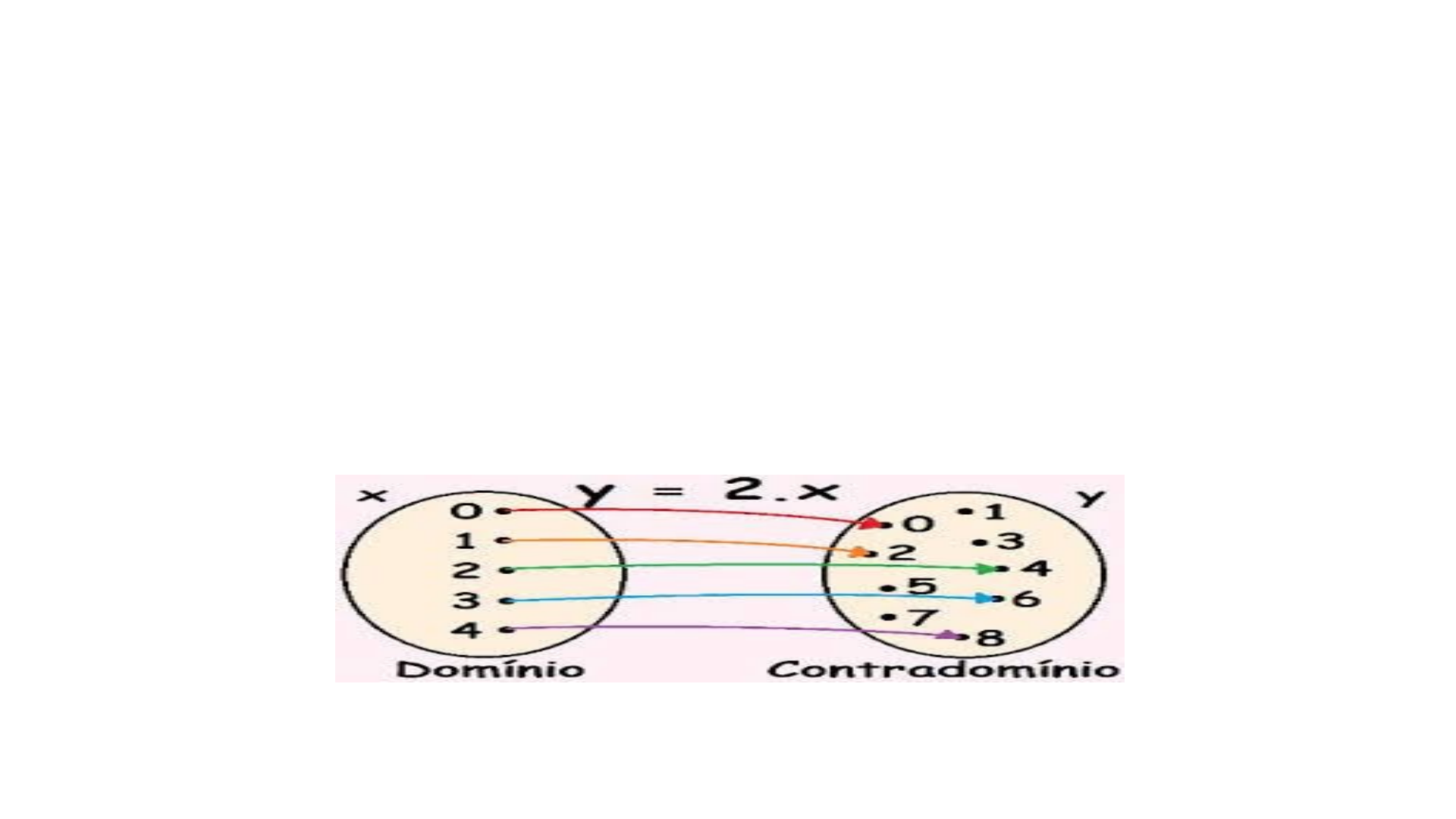 Note que o conjunto de A {1, 2, 3, 4} são as entradas, "multiplicar por 2" é a função e os valores de B {2, 4, 6, 8}, que se ligam aos elementos de A, são os valores de saída.