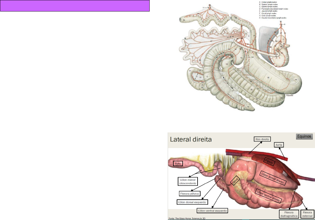 Anatomia topográfica em equinos Introdução O esôfago é um órgão tubular de musculatura lisa e seu funcionamento só se inicia a partir da chegada do alimento. Faz ligação da cavidade oral com o estomago. O equino não tem atividade de êmese, justamente por uma musculatura que existe na região cárdia (estrada do estomago) e pela maneira que o esôfago se insere no estomago formando um ângulo de (quase) 90º graus, impedindo que o alimento volte para o esôfago em direção a boca. Caso o alimento permaneça parado no estomago ocorre uma compactação gástrica. O pâncreas é anexado ao duodeno na curvatura duodenal. O jejuno é anexado ao mesentério (alta vascularização). O íleo se insere no ceco do animal. O ceco é importantíssimo para digestão do equino, sendo altamente desenvolvido, com formato de virgula. Possui saculações e estruturas tendinosas chamadas de tênias cecais. Tem como função transformar os alimentos líquidos em semissólidos (pastosos). Os equinos possuem colón maior (2 ventrais e 2 dorsais) e colón menor. Ambos sendo conectados pelo colón transverso. O colón menor possui um mesentério mais gorduroso. · Vista lateral direita O ceco é dividido em base (direcionado para o abdômen dorsal) corpo e ápice (direcionado para o abdômen ventral). A válvula ceco cólica leva o conteúdo intestinal direto para o colón ventral direito. O fígado do equino está mais projetado mais para o lado direito, principalmente o lobo lateral direito O rim direito faz sintopia com o lobo caudado do fígado, se encaixando no processo caudado do lobo caudado do fígado. · Vista lateral esquerda Na lateral esquerda é visualizado o lobo lateral esquerdo do fígado, fazendo uma leve saliência cobrindo uma parte do estomago (impressão estomacal). A curvatura maior do baço faz sintopia com o estomago – cheio: baço deslocado caudalmente; vazio: baço deslocado cranialmente. O rim esquerdo está intimamente ligado ao baço pelo ligamento nefroesplênico. Parte do jejuno e colón menor (descendente) estão do lado esquerdo – movimentação de alças de intestino. A flexura pélvica tem propriedade de diminuir o lúmen de intestino grosso do equino e nessa região acontece muita compactação intestinal. · Vista cranial A flexura diafragmática (conectando colón dorsal esquerdo ao colón dorsal direito) sempre será dorsal a flexura external (conectando colón ventral esquerdo ao colón ventral direito). A aorta abdominal, partindo do ventrículo esquerdo, percorrendo dorsalmente todo abdômen. · Vista caudal Estomago Possui corpo e fundo; curvatura maior (caudal) e menor. A entrada do alimento no estomago dá-se pelo cárdia e sai, em direção ao intestino pelo piloro. Localização entre 9ª-15ª costela, no abdômen esquerdo, caudal ao diafragma e fígado, cranial ao baço. O estomago do equino suporta, uma média, de 8 a 12L, com alto grau de distensão. Divisão - cárdia – mais cranial, fixado ao diafragma próximo à superfície dorsal da 11ª costela - fundo - mucosa aglandular (digestão mecânica) em sua maior extensão - corpo – maior porção, estendendo-se da região aglandular ventral ao cárdia até o ângulo agudo da curvatura menor - piloro – incisura angular do duodeno, sendo a única porção desviada para o abdômen direito O estomago, na superfície parietal, repousa contra o diafragma e lobo esquerdo do fígado. Já a superfície visceral está voltada para o intestino. A porção mesogástrica dorsal faz sintopia com os ligamentos gastrofrênico e gastroesplênico, além do omento maior. A curvatura maior, próxima ao cárdia, está anexa à cúpula diafragmática pelo ligamento gastrofrêncio. Ligamento gastroesplênico (conecta a porção esquerda da curvatura maior ao baço). · Omento/epiplon Prega peritoneal que se origina da parede abdominal dorsal e se liga ao longo da curvatura maior do estômago (omento maior). Estende-se caudalmente, formando a bursa omental (“bolsa achatada”). A bursa omental é acessada através de uma fenda espessa, o forâme epiplóico O omento menor (porção mesogástrica ventral) conecta a curvatura menor do estômago à superfície visceral do fígado (ligamento hepatogástrico) e uma borda direita livre conecta o duodeno ao fígado (ligamento hepatoduodenal). Baço Localizado na parede abdominal esquerda com ampla base dorsal localizada dorsalmente até as últimas três costelas. Possui um ápice ventral estreito direcionado cranioventralmente próximo à extremidade distal da décima costela. Porção dorsal anexa à região esquerda do diafragma (ligamento frenicoesplênico) e ao rim esquerdo (ligamento nefroesplênico). Conecta-se ao estômago pelo ligamento gastroesplênico. Fígado O fígado está 60% à direita do plano mediano com eixo longo posicionado obliquamente. Superfície caudodorsal (lobo caudado) está adjacente ao rim direito (direita do plano mediano). A superfície cranioventral está próximo 6ª a 7ª costela (esquerda do plano mediano). Superfície parietal adjacente ao diafragma e superfície visceral contém impressões do estômago, ceco, cólon, duodeno e rim direito. - lobos esquerdo (medial e lateral) e direito - lobo quadrado - lobo caudado A fissura umbilical (ligamento falciforme) separa o lobo medial esquerdo do lobo quadrado. O processo caudado é posicionado dorsalmente à veia cava caudal fazendo o limite dorsal do forame epiplóico. O pâncreas e veia porta faz o limite ventral do forame epiplóico) A porção proximal do duodeno está fixa à porção medial do lobo direito (mesoduodeno). O mesoduodeno é continuado por uma banda de tecido fibroso que liga o cólon dorsal direito à superfície visceral do fígado. Pâncreas É dividido em corpo, lobos direito e esquerdo. Localizado à direita do plano mediano e completamente acerca da veia porta, sendo confluente entre o estômago, duodeno (flexura duodenal cranial), fígado, base do ceco. O lobo d