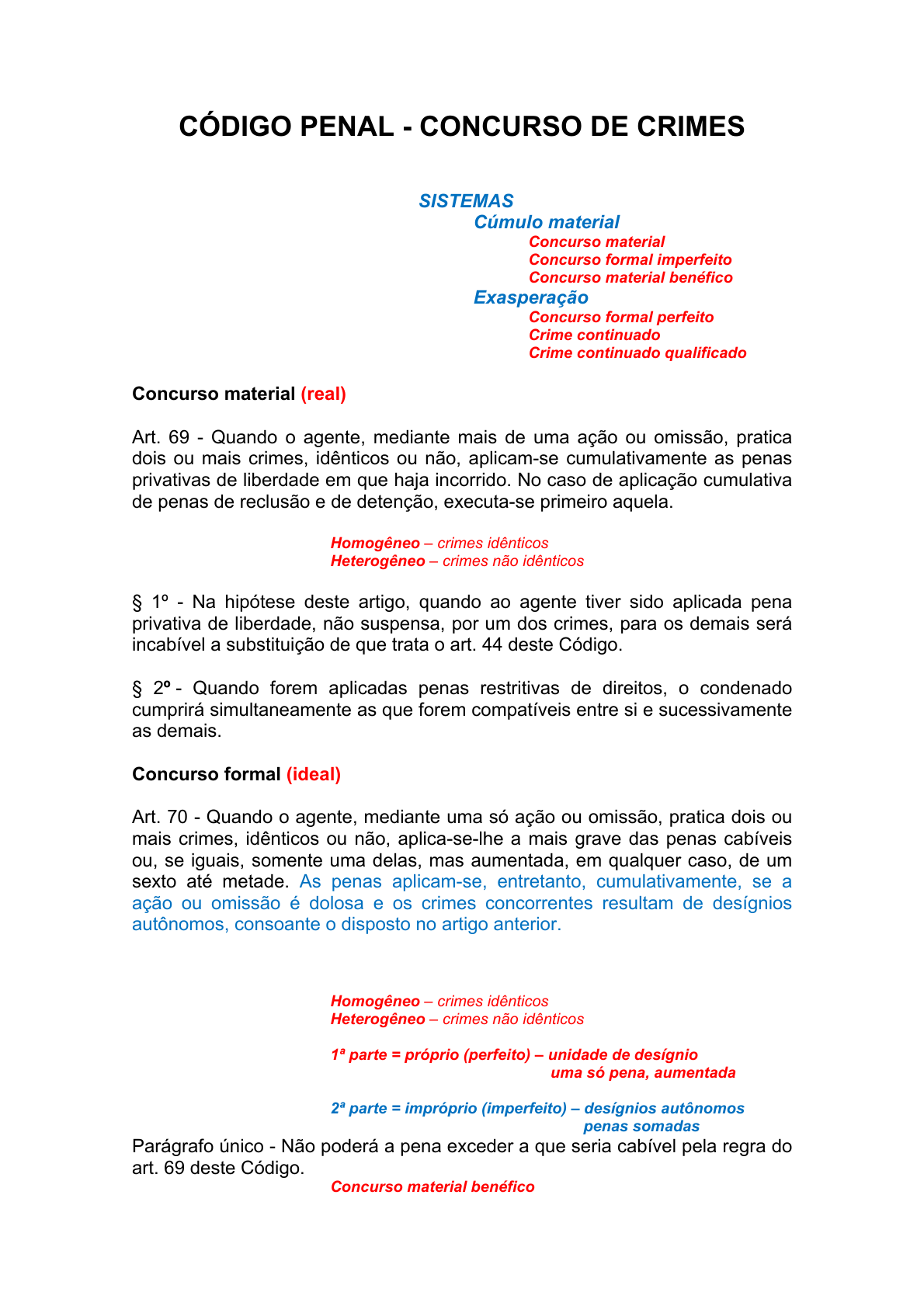 CÓDIGO PENAL - CONCURSO DE CRIMES SISTEMAS Cúmulo material Concurso material Concurso formal imperfeito Concurso material benéfico Exasperação Concurso formal perfeito Crime continuado Crime continuado qualificado Concurso material (real) Art. 69 - Quando o agente, mediante mais de uma ação ou omissão, pratica dois ou mais crimes, idênticos ou não, aplicam-se cumulativamente as penas privativas de liberdade em que haja incorrido. No caso de aplicação cumulativa de penas de reclusão e de detenção, executa-se primeiro aquela. Homogêneo – crimes idênticos Heterogêneo – crimes não idênticos § 1º - Na hipótese deste artigo, quando ao agente tiver sido aplicada pena privativa de liberdade, não suspensa, por um dos crimes, para os demais será incabível a substituição de que trata o art. 44 deste Código. § 2º - Quando forem aplicadas penas restritivas de direitos, o condenado cumprirá simultaneamente as que forem compatíveis entre si e sucessivamente as demais. Concurso formal (ideal) Art. 70 - Quando o agente, mediante uma só ação ou omissão, pratica dois ou mais crimes, idênticos ou não, aplica-se-lhe a mais grave das penas cabíveis ou, se iguais, somente uma delas, mas aumentada, em qualquer caso, de um sexto até metade. As penas aplicam-se, entretanto, cumulativamente, se a ação ou omissão é dolosa e os crimes concorrentes resultam de desígnios autônomos, consoante o disposto no artigo anterior. Homogêneo – crimes idênticos Heterogêneo – crimes não idênticos 1ª parte = próprio (perfeito) – unidade de desígnio uma só pena, aumentada 2ª parte = impróprio (imperfeito) – desígnios autônomos penas somadas Parágrafo único - Não poderá a pena exceder a que seria cabível pela regra do art. 69 deste Código. Concurso material benéfico Penas somadas Exasperação - consiste na aplicação da pena do crime mais grave praticado pelo agente, acrescida de uma majoração ( fração) prevista em lei. Desígnios autônomos - é o propósito de produzir com uma única conduta, mais de um crime Cúmulo material Exasperação Cúmulo material Exasperação Crime continuado Art. 71 - Quando o agente, mediante mais de uma ação ou omissão, pratica dois ou mais crimes da mesma espécie e, pelas condições de tempo, lugar, maneira de execução e outras semelhantes, devem os subseqüentes ser havidos como continuação do primeiro, aplica-se-lhe a pena de um só dos crimes, se idênticas, ou a mais grave, se diversas, aumentada, em qualquer caso, de um sexto a dois terços. REQUISITOS 1 – Pluralidade de condutas 2 – Crimes da mesma espécie 3 – Semelhantes condições de tempo (conexão temporal) 4 – Semelhantes condições de lugar (conexão espacial) 5 – Semelhanças na maneira de execução (conexão modal) 6 – Outras condições semelhantes 7 – Unidade de desígnios Súmula 659, STJ (13/09/2023) A fração de aumento em razão da prática de crime continuado deve ser fixada de acordo com o número de delitos cometidos, aplicando-se 1/6 pela prática de duas infrações, 1/5 para três, 1/4 para quatro, 1/3 para cinco, 1/2 para seis e 2/3 para sete ou mais infrações. Distinções Crime permanente Crime habitual Habitualidade criminosa Parágrafo único - Nos crimes dolosos, contra vítimas diferentes, cometidos com violência ou grave ameaça à pessoa, poderá o juiz, considerando a culpabilidade, os antecedentes, a conduta social e a personalidade do agente, bem como os motivos e as circunstâncias, aumentar a pena de um só dos crimes, se idênticas, ou a mais grave, se diversas, até o triplo, observadas as regras do parágrafo único do art. 70 e do art. 75 deste Código. Crime continuado específico (“qualificado”) Multas no concurso de crimes Art. 72 - No concurso de crimes, as penas de multa são aplicadas distinta e integralmente. Cúmulo material de penas Erro na execução (ABERRATIO ICTUS) Art. 73 - Quando, por acidente ou erro no uso dos meios de execução, o agente, ao invés de atingir a pessoa que pretendia ofender, atinge pessoa diversa, responde como se tivesse praticado o crime contra aquela, atendendo-se ao disposto no § 3º do art. 20 deste Código. No caso de ser também atingida a pessoa que o agente pretendia ofender, aplica-se a regra do art. 70 deste Código. Reiteração de condutas que configurem crime de mesma espécie Jurisprudência Resultado diverso do pretendido (ABERRATIO CRIMINIS) Art. 74 - Fora dos casos do artigo anterior, quando, por acidente ou erro na execução do crime, sobrevém resultado diverso do pretendido, o agente responde por culpa, se o fato é previsto como crime culposo; se ocorre também o resultado pretendido, aplica-se a regra do art. 70 deste Código. LIMITE E UNIFICAÇÃO DE PENAS CONCURSO MATERIAL MODERADO (LIMITADO) Lei de Execução Penal (Lei 7.210/84) Art. 111. Quando houver condenação por mais de um crime, no mesmo processo ou em processos distintos, a determinação do regime de cumprimento será feita pelo resultado da soma ou unificação das penas, observada, quando for o caso, a detração ou remição. Parágrafo único. Sobrevindo condenação no curso da execução, somar-se-á a pena ao restante da que está sendo cumprida, para determinação do regime. Limite das penas Art. 75. O tempo de cumprimento das penas privativas de liberdade não pode ser superior a 40 (quarenta) anos. (Redação dada pela Lei nº 13.964, de 2019) Súmula 715, STF A pena unificada para atender o limite de 30 anos de cumprimento, determinado pelo art. 75 do CP, não é considerada para a concessão de outros benefícios, como o livramento condicional ou regime mais favorável de execução. (publicação em 13/10/2013) § 1º Quando o agente for condenado a penas privativas de liberdade cuja soma seja superior a 40 (quarenta) anos, devem elas ser unificadas para atender ao limite máximo deste artigo. § 2º - Sobrevindo condenação por fato posterior ao iní