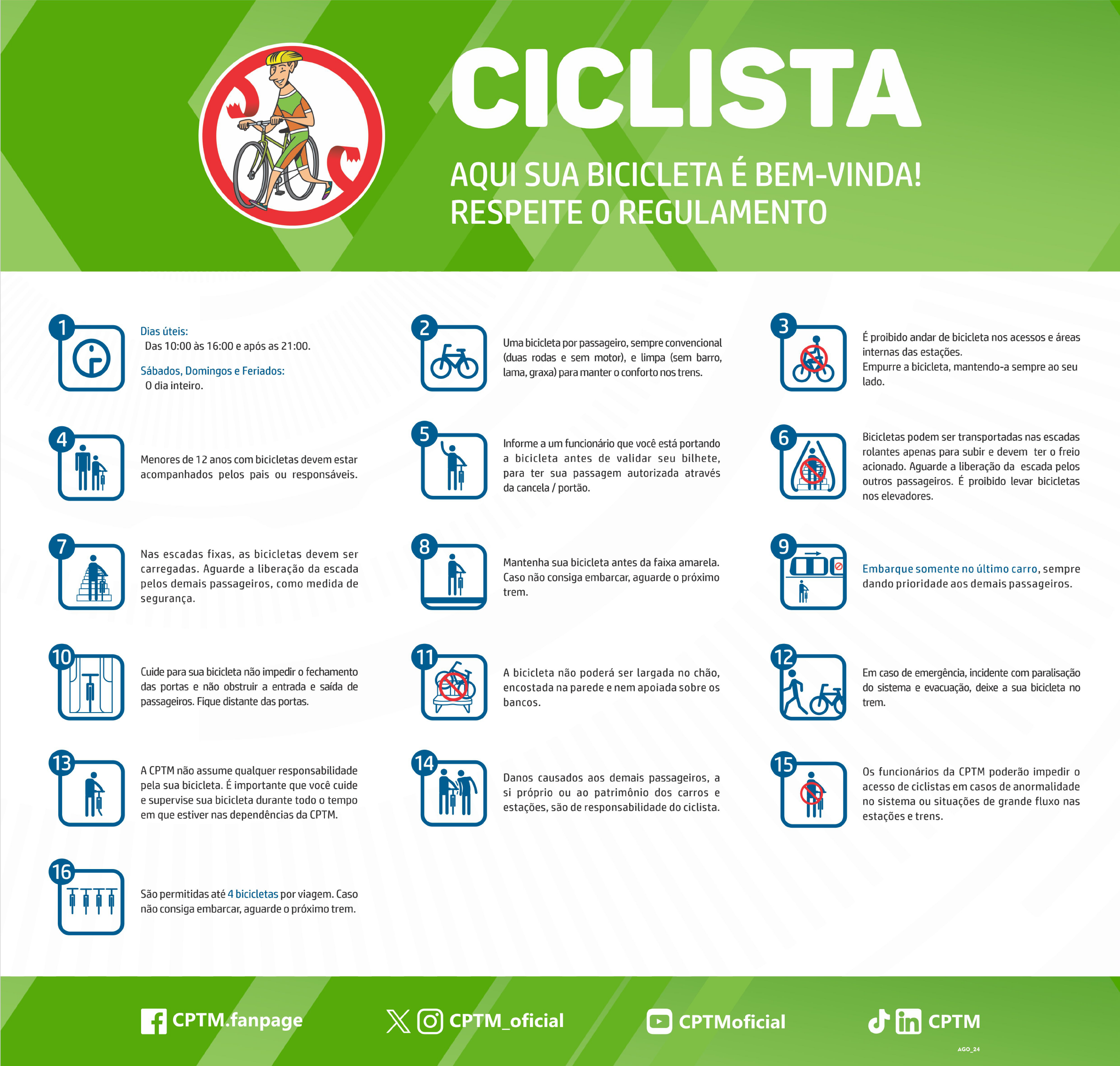 CICLISTA AQUI SUA BICICLETA É BEM-VINDA! RESPEITE REGULAMENTO 1 Dias úteis: 2 3 Das 10:00 às 16:00 e após as 21:00. Uma bicicleta por passageiro, sempre convencional É proibido andar de bicicleta nos acessos e áreas (duas rodas e sem motor), e limpa (sem barro, internas das estações. Sábados, Domingos e Feriados: lama, graxa) para manter conforto nos trens. Empurre a bicicleta, mantendo-a sempre ao seu 0 dia inteiro. lado. 4 5 Informe a um funcionário que você está portando 6 Bicicletas podem ser transportadas nas escadas rolantes apenas para subir e devem ter 0 freio Menores de 12 anos com bicicletas devem estar a bicicleta antes de validar seu bilhete, acionado. Aguarde a liberação da escada pelos acompanhados pelos pais ou responsáveis. para ter sua passagem autorizada através outros passageiros. É proibido levar bicicletas da cancela / portão. nos elevadores. 7 8 9 Nas escadas fixas, as bicicletas devem ser Mantenha sua bicicleta antes da faixa amarela. carregadas. Aguarde a liberação da escada Embarque somente no último carro, sempre Caso não consiga embarcar, aguarde o próximo pelos demais passageiros, como medida de dando prioridade aos demais passageiros. trem. segurança. 10 11 12 Cuide para sua bicicleta não impedir 0 fechamento A bicicleta não poderá ser largada no chão, Em caso de emergência, incidente com paralisação das portas e não obstruir a entrada e saída de encostada na parede e nem apoiada sobre os do sistema e evacuação, deixe a sua bicicleta no passageiros. Fique distante das portas. bancos. trem. 13 14 A CPTM não assume qualquer responsabilidade 15 funcionários da CPTM poderão impedir 0 Danos causados aos demais passageiros, a pela sua bicicleta. É importante que você cuide acesso de ciclistas em casos de anormalidade si próprio ou ao patrimônio dos carros e e supervise sua bicicleta durante todo 0 tempo estações, são de responsabilidade do ciclista. no sistema ou situações de grande fluxo nas em que estiver nas dependências da CPTM. estações e trens. 16 São permitidas até 4 bicicletas por viagem. Caso não consiga embarcar, aguarde 0 próximo trem. f CPTM.fanpage X CPTM_oficial CPTMoficial in CPTM AGO_24