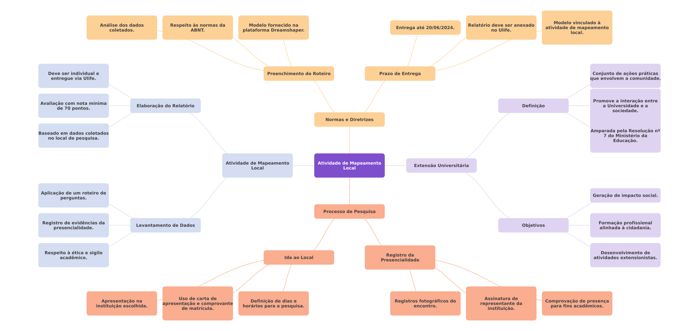 Modelo vinculado à Análise dos dados Respeito às normas da Modelo fornecido na Relatório deve ser anexado coletados. ABNT. plataforma Dreamshaper. Entrega até 20/06/2024. no Ulife. atividade de mapeamento local. Deve ser individual e Preenchimento do Roteiro Prazo de Entrega Conjunto de ações práticas entregue via Ulife. que envolvem a comunidade. Promove a interação entre Avaliação com nota mínima Elaboração do Relatório Definição a Universidade e a de 70 pontos. sociedade. Normas e Diretrizes Baseado em dados coletados Amparada pela Resolução 7 do Ministério da no local de pesquisa. Educação. Atividade de Mapeamento Atividade de Mapeamento Extensão Universitária Local Local Aplicação de um roteiro de Geração de impacto social. perguntas. Processo de Pesquisa Registro de evidências da Levantamento de Dados Objetivos Formação profissional presencialidade. alinhada à cidadania. Respeito à ética e sigilo Desenvolvimento de Ida ao Local Registro da acadêmico. atividades extensionistas. Presencialidade Uso de carta de Assinatura de Apresentação na Definição de dias e Registros fotográficos do instituição escolhida. apresentação e comprovante horários para a pesquisa. representante da Comprovação de presença encontro. de matrícula. instituição. para fins acadêmicos.