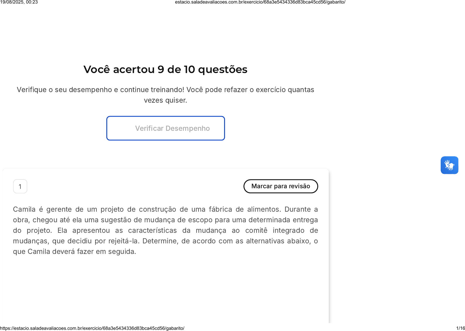 Você acertou 9 de 10 questões Verifique o seu desempenho e continue treinando! Você pode refazer o exercício quantas vezes quiser. Verificar Desempenho 1 Marcar para revisão Camila é gerente de um projeto de construção de uma fábrica de alimentos. Durante a obra, chegou até ela uma sugestão de mudança de escopo para uma determinada entrega do projeto. Ela apresentou as características da mudança ao comitê integrado de mudanças, que decidiu por rejeitá-la. Determine, de acordo com as alternativas abaixo, o que Camila deverá fazer em seguida. 19/08/2025, 00:23 estacio.saladeavaliacoes.com.br/exercicio/68a3e5434336d83bca45cd56/gabarito/ https://estacio.saladeavaliacoes.com.br/exercicio/68a3e5434336d83bca45cd56/gabarito/ 1/16 A B C D E Executar a mudança, mesmo com a negativa do comitê. Não aceitar solicitações de mudanças. Executar a mudança, sem passar pelo comitê. Se recusar a modificar o escopo do projeto, mesmo com aval do comitê. Documentar o resultado do pedido da mudança. Resposta correta Parabéns, você selecionou a alternativa correta. Confira o gabarito comentado! Gabarito Comentado A alternativa correta é a que sugere a documentação do resultado do pedido de mudança. Isso é importante porque, mesmo que a mudança tenha sido rejeitada, é essencial manter um registro de todas as solicitações e decisões tomadas durante o projeto. Isso ajuda a manter a transparência e pode ser útil para referência futura ou para a revisão do projeto. Portanto, mesmo que a mudança não seja implementada, o gerente do projeto deve documentar o resultado do pedido de mudança. 19/08/2025, 00:23 estacio.saladeavaliacoes.com.br/exercicio/68a3e5434336d83bca45cd56/gabarito/ https://estacio.saladeavaliacoes.com.br/exercicio/68a3e5434336d83bca45cd56/gabarito/ 2/16 A B C D E 2 Marcar para revisão Em um projeto de construção de um edifício residencial, a gestão do cronograma é fundamental para garantir o cumprimento dos prazos estabelecidos, evitando atrasos e possíveis prejuízos. Sobre a gestão do cronograma em um projeto, analise as afirmativas abaixo. I - É preciso definir as atividades necessárias e sua sequência correta. II - Deve-se realizar uma estimativa de recursos necessários para cada atividade. III - É possível ignorar desvios de cronograma, uma vez que não afetam diretamente o resultado final. Marque a alternativa que apresenta a(s) afirmativa(s) correta(s). As afirmativas I, II e III estão corretas. Apenas as afirmativas I e III estão corretas. Apenas as afirmativas I e II estão corretas. Apenas as afirmativas II e III estão corretas. Apenas a afirmativa I está correta. 19/08/2025, 00:23 estacio.saladeavaliacoes.com.br/exercicio/68a3e5434336d83bca45cd56/gabarito/ https://estacio.saladeavaliacoes.com.br/exercicio/68a3e5434336d83bca45cd56/gabarito/ 3/16 Resposta correta Parabéns, você selecionou a alternativa correta. Confira o gabarito comentado! Gabarito Comentado A afirmativa III está incorreta, pois ignorar possíveis desvios de cronograma é um erro grave na gestão de projetos, pois pode levar a atrasos significativos e impactar negativamente o resultado final. Acompanhar e controlar o cronograma é essencial para identificar desvios, tomar ações corretivas e manter o projeto dentro dos prazos estipulados. 3 Marcar para revisão Em um projeto de desenvolvimento de software, a gestão da integração desempenha um papel fundamental. Nesse sentido, avalie as asserções I e II e a relação proposta entre eles. I - A gestão da integração é responsável por assegurar a coordenação, sincronização e integração adequadas em todos os processos envolvidos em um projeto. PORQUE II - A gestão da integração envolve a elaboração de um plano de gerenciamento de projetos liderada pelo gerente e com a participação de toda a equipe, desta forma as diferentes partes estão envolvidas em atividades e processos coordenados e integrados. Marque a alternativa que apresenta a relação correta entre as asserções I e II. 19/08/2025, 00:23 estacio.saladeavaliacoes.com.br/exercicio/68a3e5434336d83bca45cd56/gabarito/ https://estacio.saladeavaliacoes.com.br/exercicio/68a3e5434336d83bca45cd56/gabarito/ 4/16 A B C D E Ambas as asserções são verdadeiras, e a asserção II é uma justificativa para a asserção I. Ambas as asserções são verdadeiras, mas a asserção II não é uma justificativa para a asserção I. A asserção I é verdadeira e a asserção II é falsa. A asserção I é falsa e a asserção II é verdadeira. Ambas as asserções são falsas. Resposta correta Parabéns, você selecionou a alternativa correta. Confira o gabarito comentado! Gabarito Comentado A asserção I afirma que a gestão da integração é responsável por assegurar a coordenação, sincronização e integração adequadas em todos os processos envolvidos em um projeto, o que está correto. A gestão da integração é responsável por garantir que todas as partes do projeto estejam trabalhando de forma coordenada e integrada, a fim de alcançar os objetivos do projeto. 19/08/2025, 00:23 estacio.saladeavaliacoes.com.br/exercicio/68a3e5434336d83bca45cd56/gabarito/ https://estacio.saladeavaliacoes.com.br/exercicio/68a3e5434336d83bca45cd56/gabarito/ 5/16 A B C D E A asserção II justifica a asserção I, ao afirmar que a gestão da integração envolve a elaboração de um plano de gerenciamento de projetos liderado pelo gerente e com a participação de toda a equipe. Isso significa que todas as partes envolvidas no projeto estão engajadas em atividades e processos coordenados e integrados, o que contribui para o sucesso da entrega do produto final. 4 Marcar para revisão A Estrutura Analítica de Projeto é uma etapa essencial para o sucesso do mesmo, caracterizada por ser: um guia para validação do escopo do projeto. uma estrutura sequenciada temporalmente. uma imagem gráfica da hierarquia do projeto. um arranjo não hierárquico do esco