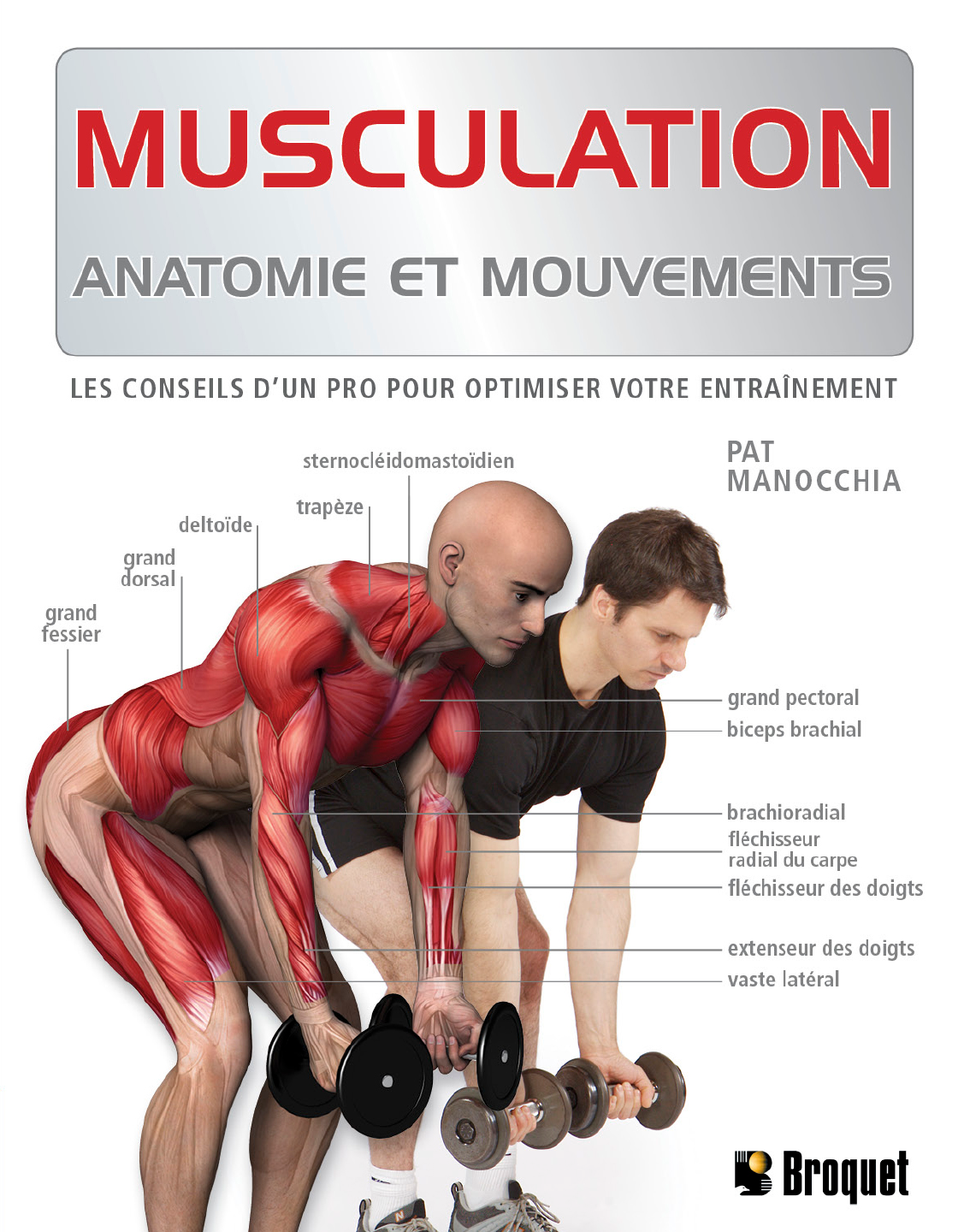 PAT MANOCCHIA 97-B, Montée des Bouleaux, Saint-Constant, Qc, Canada, J5A 1A9 Tél. : 450.638.3338, Téléc. : 450.638.4338 Internet : www.broquet.qc.ca Courriel : info@broquet.qc.ca http://www.broquet.qc.ca SOMMA IRE Introduction . . . . . . . . . . . . . . . . . . . . . . . . . . . . . . .8 Anatomie générale . . . . . . . . . . . . . . . . . . . . . . . .10 Échauffement . . . . . . . . . . . . . . . . . . . . . . . . . . . .14 Étirements . . . . . . . . . . . . . . . . . . . . . . . . . . . . . . .20 Jambes et fessiers . . . . . . . . . . . . . . . . . . . . . . . . .32 Dos . . . . . . . . . . . . . . . . . . . . . . . . . . . . . . . . . . . .68 Poitrine . . . . . . . . . . . . . . . . . . . . . . . . . . . . . . . . .96 Épaules . . . . . . . . . . . . . . . . . . . . . . . . . . . . . . . .114 Bras . . . . . . . . . . . . . . . . . . . . . . . . . . . . . . . . . . .134 Centre du corps . . . . . . . . . . . . . . . . . . . . . . . . . .154 Liste illustrée des exercices . . . . . . . . . . . . . . . . .184 Précisions terminologiques . . . . . . . . . . . . . . . . .188 Glossaire et remerciements . . . . . . . . . . . . . . . . .189 Nous reconnaissons l’aide financière du gouvernement du Canada par l’entremise du Fonds du livre du Canada pour nos activités d’édition. Nous remercions également l’Association pour l’exportation du livre canadien (AELC), ainsi que le gouvernement du Québec : Programme de crédit d’impôt pour l’édition de livres – la Société de développement des entreprises culturelles (SODEC). Pour l’édition originale parue sous le titre : Anatomy Of Exercise : Texte © Pat Manocchia © 2007, Hylas Publishing, LLC 129 Main Street, suite C, Irvington, NY 10533, United States. Réalisation : Exégraph Traduit de l’anglais par Manuel Boghossian Pour le français (Québec) Copyright © Ottawa 2012 Broquet Inc. Dépôt légal - Bibliothèque et Archives nationales du Québec 3e trimestre 2012 Conversion numérique : Nancy Lépine ISBN : 978-2-89654-879-8 Tout droits de traduction totale ou partielle réservés pour tous les pays. La reproduction d’un extrait quel- conque de ce livre, par quelque procédé que ce soit, tant électronique que mécanique, en particulier par photocopie, est interdite sans l’autorisation écrite de l’éditeur. Catalogage avant publication de Bibliothèque et Archives nationales du Québec et Bibliothèque et Archives Canada Manocchia, Pat Musculation : anatomie et mouvements Traduction de : Anatomy of exercise. ISBN 978-2-89654-879-8 1. Exercice. 2. Muscles - Physiologie. 3. Muscles - Anatomie. 4. Exercice - Aspect physiologique. 5. Force musculaire. I. Titre. GV461.M3614 2010 613.7'1 C2009-942028-7 Anatomy Of Exercise 8 C e livre n’est pas le premier à traiter des structures anatomiques impli - quées dans les exercices de musculation, et nous n’avons pas non plus la prétention d’épuiser le sujet. Notre propos n’est pas tant de nous livrer à une exploration exhaustive du vocable de la culture physique que de proposer une approche unique et globale de l’anatomie de la musculation, utile aussi bien au profane qu’au professionnel. La plupart des ouvrages d’illustration anatomique en rapport avec la muscula- tion, qu’ils contiennent ou non des explications quant à l’exécution des mouve- ments, s’adressent à deux catégories de lecteurs : les culturistes et les scienti- fiques. Mon intention en écrivant ce livre a été de rendre ce type d’informations accessible à tous, et exploitable par quiconque s’intéresse au travail musculaire. C’est pourquoi j’aborde aussi la question des activités cardio, des étirements et des exercices d’équilibre, c’est-à-dire la partie de l’entraînement habituelle- ment laissée de côté par les autres auteurs, qui se focalisent sur la prise de masse. Ce livre prend enfin en considération l’interdépendance des différents systèmes organiques impliqués dans la production des mouvements. Dans les ouvrages sur le sujet, chaque exercice est généralement décrit comme agissant sur un muscle ou groupe musculaire en particulier, que l’on souhaite renforcer ou faire augmenter de volume. Or les auteurs oublient souvent de préciser que, pour optimiser les résultats et éviter de se blesser, il faut prêter attention aux muscles environnants ainsi qu’à certaines structures dont l’implication dans le mouvement est moins évidente, mais pourtant bien réelle. Ainsi, par exemple, la position correcte du bassin et du dos est-elle déterminante pour la bonne exécution des mouvements dans quasiment tous les exercices majeurs, et donc pour l’efficacité du travail concernant le muscle ciblé. Pour chaque exercice proposé ici, tous les muscles impliqués dans le mouve ment, qu’ils soient actifs ou passifs, sont représentés graphiquement. Par muscles actifs, ou primaires, on entend les muscles qui se contractent pour faire bouger une structure, tandis que les muscles stabilisateurs sont ceux qui soit se contractent secondairement, soit entrent en tension pour stabiliser la structure primaire ou une structure secondaire afin de permettre le mouve- ment. Lorsqu’on fait par exemple des pompes, la contraction des muscles actifs primaires ouvre l’articulation du coude (les bras se tendent) et entraîne l’adduction des bras (la poitrine se ferme). Les stabilisateurs primaires se contractent ou entrent en tension pour que les coudes et les épaules restent stables du début à la fin du mouvement. Toutefois, sans l’intervention des INTRODUCTION 9 muscles profonds du tronc ainsi que des muscles de l’avant de la cuisse, qui se contractent pour garder l’alignement du corps et permettre aux chevilles de jouer leur rôle de pivot, il n’y aurait pas de pompes possibles. Quant aux stabilisateurs secondaires, leur degré de participation varie en fonction du mouvement. Par exemple, pour les biceps à la barre, les muscles du dos 