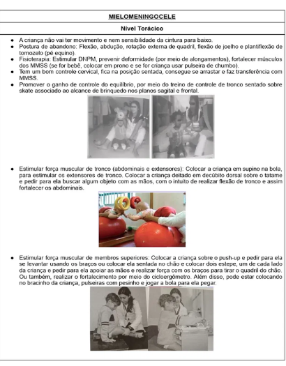 MIELOMENINGOCELE Nivel Toracico A criança não vai ter movimento e nem sensibilidade da cintura para Postura de Flexão, abdução, rotação de quadril, flexão de joelho e plantiflexão de (pé equino). Estimular prevenir deformidade (por meio de fortalecer músculos dos MMSS (se for bebe, colocar em prono e se for criança usar pulseira de chumbo). Tem um bom controle fica na posição sentada, consegue se arrastar e faz transferência com Promover o ganho de controle do equilibrio, por meio do treino de controle de sentado sobre skate associado ao alcance de brinquedo nos planos sagital e frontal Estimular força muscular de tronco (abdominais Colocar a criança em supino na bola, para estimular os extensores de Colocar a criança deitado em decubito dorsal sobre tatame e pedir para ela buscar algum objeto com as mãos, com intuito de realizar flexão de tronco assim fortalecer os abdominais Estimular força muscular de membros superiores: Colocar a criança sobre push-up e pedir para ela se levantar usando os braços ou colocar ela sentada no e colocar dois estepe, um de cada lado da criança e pedir para ela apoiar as mãos 0 realizar força com os braços para 0 quadril do Ou realizar fortalecimento por meio do disso, pode estar colocando no bracinho da criança, pulseiras com pesinho 0 jogar a bola para ela