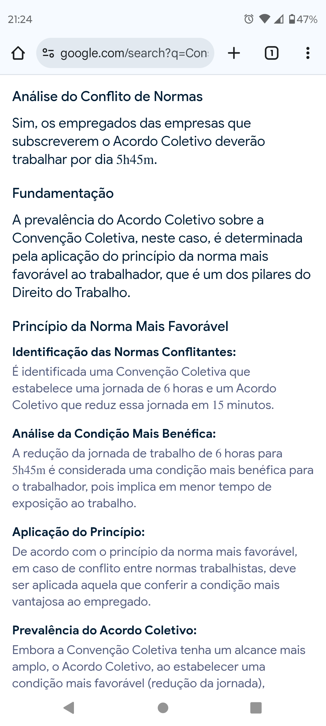 21:24 47% + 1 ... Análise do Conflito de Normas Sim, empregados das empresas que subscreverem Acordo Coletivo deverão trabalhar por dia 5h45m. Fundamentação A prevalência do Acordo Coletivo sobre a Convenção Coletiva, neste caso, é determinada pela aplicação do princípio da norma mais favorável ao trabalhador, que é um dos pilares do Direito do Trabalho. Princípio da Norma Mais Favorável Identificação das Normas Conflitantes: É identificada uma Convenção Coletiva que estabelece uma jornada de 6 horas e um Acordo Coletivo que reduz essa jornada em 15 minutos. Análise da Condição Mais Benéfica: A redução da jornada de trabalho de 6 horas para 5h45m é considerada uma condição mais benéfica para trabalhador, pois implica em menor tempo de exposição ao trabalho. Aplicação do Princípio: De acordo com princípio da norma mais favorável, em caso de conflito entre normas trabalhistas, deve ser aplicada aquela que conferir a condição mais vantajosa ao empregado. Prevalência do Acordo Coletivo: Embora a Convenção Coletiva tenha um alcance mais amplo, Acordo Coletivo, ao estabelecer uma condição mais favorável (redução da jornada),