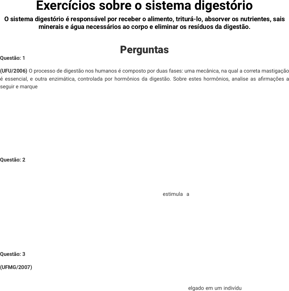 Exercícios sobre o sistema digestório O sistema digestório é responsável por receber o alimento, triturá-lo, absorver os nutrientes, sais minerais e água necessários ao corpo e eliminar os resíduos da digestão. Perguntas Questão: 1 (UFU/2006) O processo de digestão nos humanos é composto por duas fases: uma mecânica, na qual a correta mastigação é essencial, e outra enzimática, controlada por hormônios da digestão. Sobre estes hormônios, analise as afirmações a seguir e marque a alternativa correta. a. As gorduras parcialmente digeridas, presentes no quimo, estimulam as células do duodeno a liberarem o hormônio secretina, que provoca a eliminação da bile pela vesícula biliar. b. A acidez do quimo, que chega ao duodeno, estimula certas células da parede intestinal a liberarem, especialmente, o hormônio colecistoquinina, que agirá no pâncreas, estimulando-o a liberar, principalmente, bicarbonato de sódio. c. A secreção do suco gástrico é estimulada por impulsos nervosos e pelo hormônio gastrina, produzido no estômago. d. A digestão de proteínas inicia-se no estômago e completa-se no duodeno por ação de três proteases secretadas pelo pâncreas: enteroquinase, pepsina e procarboxipeptidase. Questão: 2 A insulina e o glucagon são hormônios produzidos pelo pâncreas responsáveis pela regulação da glicose no sangue. Em relação a essas duas substâncias, assinale a alternativa correta: a. A produção de insulina pelas células alfa do pâncreas estimula a absorção de glicose pelo fígado e o armazenamento em glicogênio. b. A produção de glucagon pelas células beta do pâncreas estimula a quebra de glicogênio e a liberação de glicose pelo fígado. c. A produção de insulina pelas células beta do pâncreas estimula a absorção de glicose pelo fígado e o armazenamento em glicogênio. d. A quebra de glicogênio e a liberação de glicose pelo fígado estimulam as células alfa a produzirem mais insulina. Questão: 3 (UFMG/2007) A doença celíaca consiste em um distúrbio inflamatório do intestino delgado, que ocorre em indivíduos com sensibilidade ao glúten e à ingestão de trigo, centeio ou cevada. Analise estas duas figuras, em que está representada uma região do intestino delgado em um indivíduo normal – I – e em um indivíduo com doença celíaca – II Representação de uma porção do intestino delgado de uma pessoa normal e de uma pessoa com doença celíaca Considerando-se a alteração estrutural representada na Figura II, é INCORRETO afirmar que indivíduos portadores de doença celíaca podem apresentar: a) Baixa produção de hemoglobina. b) Diminuição da densidade mineral óssea. c) Aumento da absorção de água. d) Retardo do crescimento corporal. Questão: 4 Em relação às enzimas e hormônios digestivos, marque a alternativa que corresponda à sequência correta: ( ) Enzima que digere lipídios no intestino delgado. ( ) Atua sobre os ácidos nucleicos, transformando-os em nucleotídeos. ( ) Hormônio produzido pelo intestino que estimula o pâncreas a secretar bicarbonato de sódio. ( ) Estimula a liberação de enzimas pancreáticas e a liberação de bile pela vesícula biliar. ( ) Estimula a secreção de HCl e aumenta a motilidade gástrica. I – Secretina; II – Gastrina; III – lipase intestinal; IV– Nuclease; V – Colecistocinina a. III, IV, I, V e II. b. II, IV, I, V e III. c. V, I, II, IV e III. d. IV, III, II, V e I. Respostas Questão: 1 Letra c Questão: 2 Letra c A produção de insulina ocorre pelas células beta e a de glucagon ocorre pelas células alfa do pâncreas. A insulina induz a absorção de glicose pelo fígado e o seu armazenamento em glicogênio. O glucagon estimula a quebra de glicogênio e liberação de glicose pelo fígado. Questão: 3 Letra c A doença celíaca é uma condição crônica que afeta principalmente o intestino delgado. Portadores desta doença têm intolerância permanente ao glúten. A ingestão desta substância causa danos às vilosidades da parede intestinal, causando REDUÇÃO na absorção de água e nutrientes pelo intestino. Questão: 4 Letra a Fonte: Brasil Escola - https://exercicios.brasilescola.uol.com.br/exercicios-biologia/exercicios-sobre-sistema-digestorio.htm