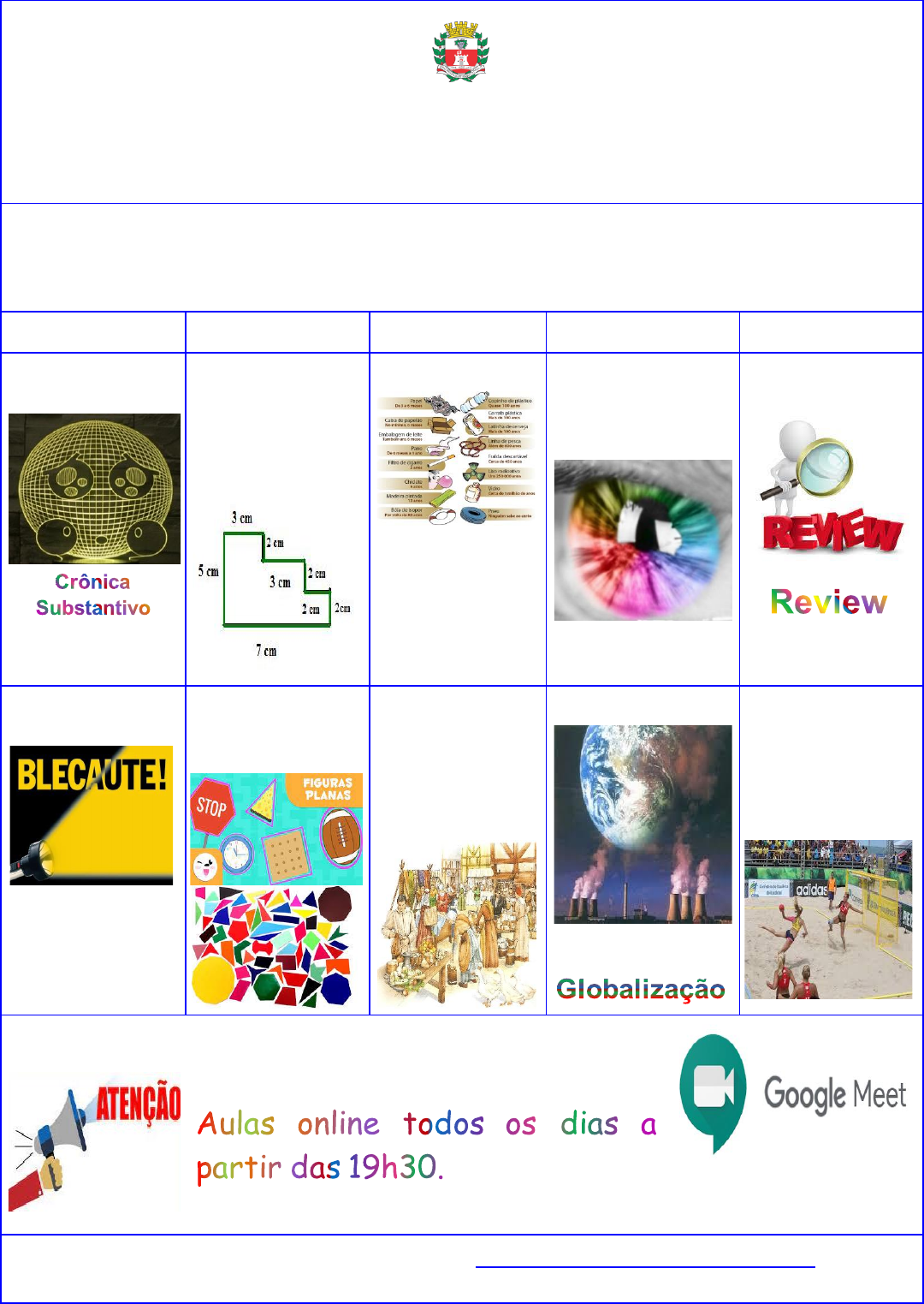 PREFEITURA MUNICIPAL DE VINHEDO SECRETARIA DE EDUCAÇÃO ESCOLA MUNICIPAL INTEGRAÇÃO / CMES FUNDAMENTAL E MÉDIO DE VINHEDO Rua Monteiro de Barros nº531 Centro Vinhedo/SP CEP 13280-081 Fone (19)3876 6625 ROTINA DE ESTUDOS – 2º TERMO DO ENSINO FUNDAMENTAL II Semana: 26 a 30 de abril de 2021 SEGUNDA-FEIRA TERÇA-FEIRA QUARTA-FEIRA QUINTA-FEIRA SEXTA-FEIRA Língua Portuguesa pág. 2 Meet às19h30 Matemática pág.5 FIGURAS GEOMÉTRICAS PLANAS e PERÍMETRO Ciências pág. 7 Materiais Resistentes à Decomposição Meet às 19h30 Arte pág. 11 Cores Quentes e Frias Meet às 19h30 Inglês pág. 19 Meet às 19h30 Língua Portuguesa Quem narra o texto, também é personagem da história? Matemática Meet às 19h30 História pág. 9 O Surgimento do Comercio e das Cidades Meet às 20h10 Geografia pág. 15 Meet às 20h10 Educação Física pág. 20 Handebol de Areia Queridos, alunos! Bons estudos!!! Em caso de dúvidas, enviar e-mail para fundamental2@edu.vinhedo.sp.gov.br com nome/ ano/ nome da escola. mailto:fundamental2@edu.vinhedo.sp.gov.br 2º Termo EF II - 2 3456789PREFEITURA MUNICIPAL DE VINHEDO SECRETARIA MUNICIPAL DE EDUCAÇÃO ESCOLA MUNICIPAL INTEGRAÇÃO / CMES FUNDAMENTAL E MÉDIO DE VINHEDO Rua Monteiro de Barros nº531 Centro Vinhedo/SP CEP 13280-000 Fone (19)3876 6625 Professora: Shirley Componente curricular: Língua Portuguesa 2º Termo do Ensino Fundamental II – EJA Dias da Semana: 26 a 30 de abril de 2021 Atividades realizadas durante o período de quarentena devido à COVID 19 Aluno(a): ____________________________________________________nº ____ 2º Termo A Crônica e substantivo Habilidades: Ler, compreender o que lê, inferir, reconhecer as características do gênero crônica em determinado contexto, identificar e compreender a função do substantivo. Orientações: Responda os exercícios de gramática orientando-se pelos as informações contidas nos quadros abaixo. O texto que você vai ler é uma crônica. Leia com atenção e responda ao que se pede. Você poderá fotografar e enviar a sua atividade ou tirar as suas dúvidas com a professora, através do e-mail: shirley.paguetti@edu.vinhedo.sp.gov.br Substantivo Quando pensamos em estabelecer uma comunicação, nos deparamos com uma infinidade de palavras, sendo que algumas delas, usamos para dar nome a pessoas, objetos, animais, lugares, fenômenos da natureza e sentimentos. Assim, a classe de palavras que nomeia as coisas, os seres e os sentimentos são chamadas de substantivo. Exemplo: caneta, escola, casa, criança, cidade, país, Brasil, Maria, ônibus, livro, etc Classificação do substantivo (parte 1) Simples: formado por uma só palavra: Óculos, quadro, flor, cadeira, computador... Composto: formado por uma ou mais palavras: Segunda-feira, cachorro-quente, arco-íris, couve-flor, pé de moleque... Comum: indica um nome comum a todos os seres da mesma espécie: Criança, casa, país, cidade, homem, mulher, escola, carro, cinema, café, pão, bolo... Próprio: indica um ser em particular de uma espécie. Joana, Vinhedo, Brasil, Manaus, Ana. Exercícios 1) Identifique os substantivos presentes em cada frase abaixo. a) Levanto cedo, tomo um banho, tomo café e saio para o trabalho. b) A juventude acha que o mundo pode acabar amanhã, por isso quer fazer tudo no dia de hoje. c) Cada geração curte a sua adolescência como pode. d) Essa frase é minha. mailto:shirley.paguetti@edu.vinhedo.sp.gov.br 2º Termo EF II - 3 2) Classifique os substantivos destacados em simples ou composto e comum ou próprio. a) Recebi um telegrama de uma amiga que mora em Recife. b) O Brasil é rico em minério. c) Cora Coralina é a minha poetisa predileta. d) Fui ao mercado e comprei frutas, verduras e uma caixa de pé de moleque. Blecaute “Sabia que a luz elétrica, no Brasil, existe apenas de uns 100 anos pra cá?” Essa foi a pergunta que meu professor de violão clássico me fez no meio de um blecaute demorado – culpa de um gerador queimado por algum raio – que fez com que a aula tomasse outro andamento, totalmente improvisado, mas não menos proveitoso. Não. Eu nunca tinha pensado nisso. Assim como as crianças do século XXI não sabem o que é viver sem computador, eu também já nasci dependendo da luz elétrica para tudo o que faço. Não me imagino sem o banho quentinho, o refrigerante gelado, o computador, o abajur e tantos outros vícios de conforto que nem percebemos que só existem por causa da eletricidade. É certo que, em tempos de racionamento, lembramos o tempo todo de reduzir seu consumo, mas, ficar totalmente sem ela, jamais. Duvido que algum torcedor fanático deixe de acompanhar o Brasileirão no rádio ou na televisão. Duvido também que no friozinho matinal alguém se atreva a tomar um banho gelado. E eu, confesso, não deixo de ligar meu secador de cabelo nem de usar a internet, e me recuso a sair com a roupa amarrotada… A energia elétrica, realmente, é essencial. Mas, além dos benefícios da luz, a pergunta do meu professor me fez pensar em como as pessoas de 100 anos atrás viviam. Aposto que o que parece impossível para nós elas tiravam de letra. A paciência e o tempo eram muito maiores. E o romantismo também. Para se mandar uma carta, era preciso escrever à mão, levar ao correio, esperar, esperar, esperar até o destinatário receber, resolver responder, ir ao correio, esperar outro tanto e, aí sim, descobrir o que ele pensou do que você quis dizer. Hoje em dia, o assunto já estaria ultrapassado depois de toda essa espera e a falta de paciência e o excesso de ansiedade não mais permitem esse luxo. Agora tudo é feito por e-mail, e, assim que ele é enviado, já queremos receber a resposta. Para se enxergar à noite, era necessário usar velas e lampiões. As pessoas se recolhiam mais cedo, conversavam mais e passeavam sob a luz da lua, sem medo da violência, que deve ter nascido na mesma época da eletricidade. Para se ouvir música, só se fosse ao vivo. Serenatas, saraus