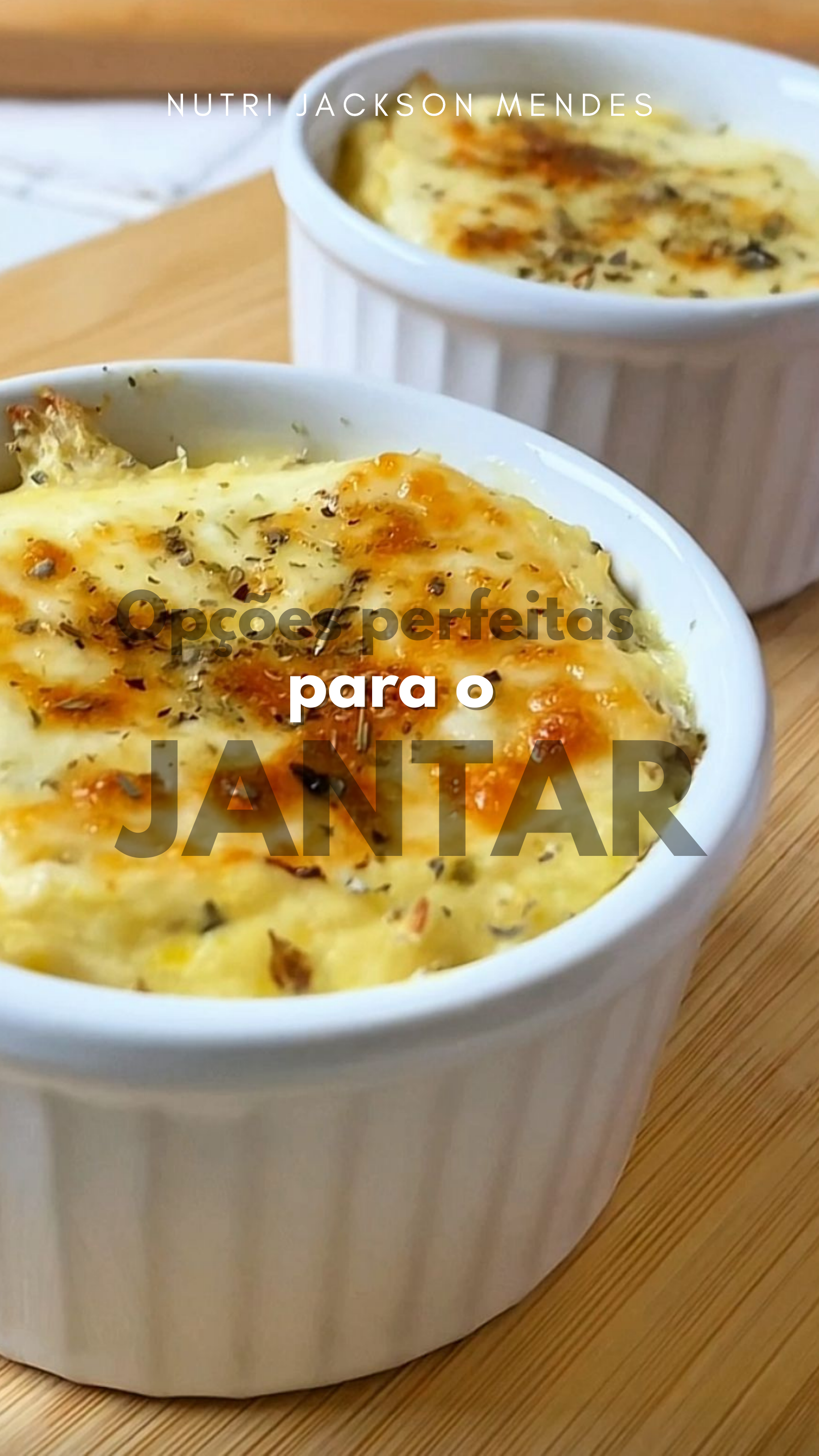 JANTARJANTAR Opções perfeitasOpções perfeitas N U T R I J A C K S O N M E N D E S para opara o Fricassê de frango 👉🏼 Ingredientes: Frango desfiado (100g) Milho (50g) Queijo (20g) Leite desnatado (30ml) Requeijão light (20g) - Modo de preparo: Bata no liquidificador o milho, o leite e o requeijão light para fazer o creme. Em uma panela, misture o creme com o frango e deixe levantar fervura. Desligue. Para a montagem, em um ramequim coloque uma camada de frango, uma camada de queijo e novamente uma camada de frango e outra camada de queijo. Leve para assar em 200ºC até gratinar. 👉🏼 Info nutricional: Calorias: 320kcal | carbo: 15g | ptn: 39g | Lip: 11g 👉🏻 Ingredientes: - Batata inglesa cozida (200g) - Carne moída - usei patinho (100g) - Requeijão light (30g) - Queijo (30g) - Temperos a gosto. Continuação abaixo. Escondinho de batata inglesa e carne 👉🏻 Modo de preparo: Cozinhe as batatas até ficarem bem molinhas, depois amasse e faça um purê. Agora acrescente o requeijão light e o temperos e incorpore. Faça a carne moída cozida (não tem segredo, joga na panela com temperos). Depois pronta misture com molho de tomate. Agora é só montar. Em uma forma (que posso ir ao forno) coloque uma camada do purê de batatas, a carne, uma fatia de queijo, mais uma camada de batata... e claro, mais uma fatia de queijo pra fechar. Agora leva pro forno por cerca de 15 minutos a 200 graus (mas vai conferindo... se queimar a culpa é tua hahaha) - 👉🏻 Info nutricional: Calorias: 370kcal/ carbo: 18,5g/ Ptn: 28,5 / Lip: 20g Escondinho de batata inglesa e carne