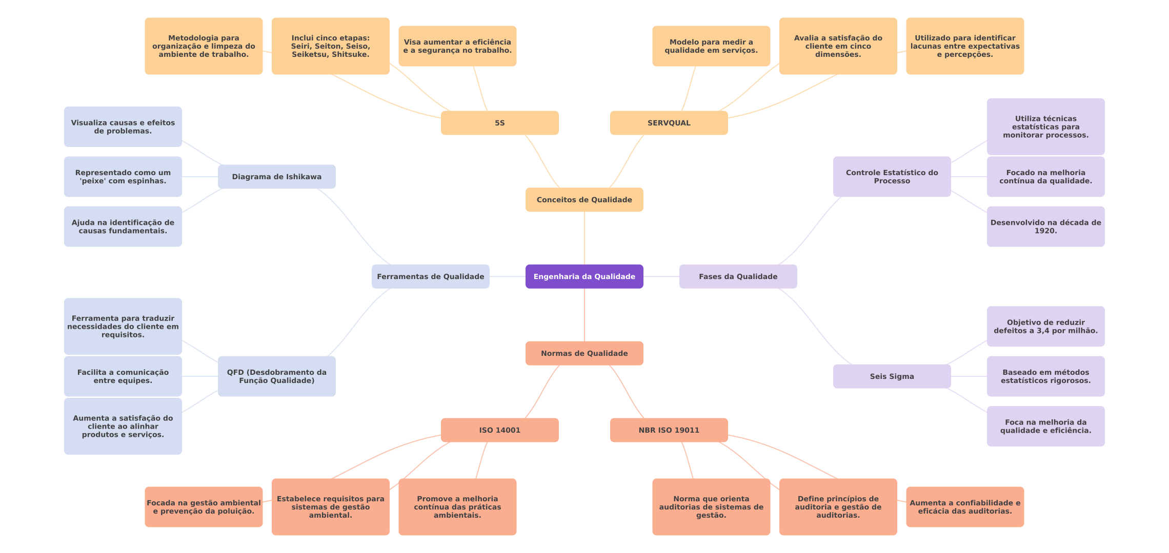 Metodologia para Inclui cinco etapas: Visa aumentar a eficiência organização e limpeza do Seiri, Seiton, Seiso, Modelo para medir a Avalia a satisfação do Utilizado para identificar cliente em cinco ambiente de trabalho. Seiketsu, Shitsuke. segurança no trabalho. qualidade em serviços. lacunas entre expectativas dimensões. e percepções. Utiliza técnicas Visualiza causas e efeitos 5S SERVQUAL de problemas. estatísticas para monitorar processos. Representado como um Controle Estatístico do Focado na melhoria 'peixe' com espinhas. Diagrama de Ishikawa Processo contínua da qualidade. Conceitos de Qualidade Ajuda na identificação de Desenvolvido na década de causas fundamentais. 1920. Ferramentas de Qualidade Engenharia da Qualidade Fases da Qualidade Ferramenta para traduzir necessidades do cliente em Objetivo de reduzir requisitos. defeitos a 3,4 por milhão. Normas de Qualidade Facilita a comunicação QFD (Desdobramento da Baseado em métodos entre equipes. Função Qualidade) Seis Sigma estatísticos rigorosos. Aumenta a satisfação do Foca na melhoria da cliente ao alinhar ISO 14001 NBR ISO 19011 produtos e serviços. qualidade e eficiência. Estabelece requisitos para Promove a melhoria Focada na gestão ambiental Norma que orienta Define princípios de Aumenta a confiabilidade e e prevenção da poluição. sistemas de gestão contínua das práticas auditorias de sistemas de auditoria e gestão de ambiental. eficácia das auditorias. ambientais. gestão. auditorias.