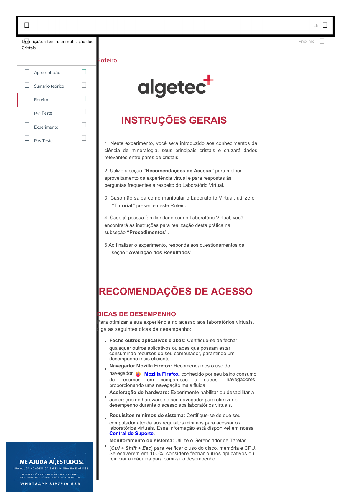 Roteiro INSTRUÇÕES GERAIS RECOMENDAÇÕES DE ACESSO 1. Neste experimento, você será introduzido aos conhecimentos da ciência de mineralogia, seus principais cristais e cruzará dados relevantes entre pares de cristais. 2. Utilize a seção “Recomendações de Acesso” para melhor aproveitamento da experiência virtual e para respostas às perguntas frequentes a respeito do Laboratório Virtual. 3. Caso não saiba como manipular o Laboratório Virtual, utilize o “Tutorial” presente neste Roteiro. 4. Caso já possua familiaridade com o Laboratório Virtual, você encontrará as instruções para realização desta prática na subseção “Procedimentos”. 5.Ao finalizar o experimento, responda aos questionamentos da seção “Avaliação dos Resultados”. Para otimizar a sua experiência no acesso aos laboratórios virtuais, siga as seguintes dicas de desempenho: Feche outros aplicativos e abas: Certifique-se de fechar quaisquer outros aplicativos ou abas que possam estar consumindo recursos do seu computador, garantindo um desempenho mais eficiente. Navegador Mozilla Firefox: Recomendamos o uso do navegador Mozilla Firefox, conhecido por seu baixo consumo navegadores,de recursos em comparação a outros proporcionando uma navegação mais fluida. Aceleração de hardware: Experimente habilitar ou desabilitar a aceleração de hardware no seu navegador para otimizar o desempenho durante o acesso aos laboratórios virtuais. Requisitos mínimos do sistema: Certifique-se de que seu computador atenda aos requisitos mínimos para acessar os laboratórios virtuais. Essa informação está disponível em nossa Central de Suporte. Monitoramento do sistema: Utilize o Gerenciador de Tarefas (Ctrl + Shift + Esc) para verificar o uso do disco, memória e CPU. Se estiverem em 100%, considere fechar outros aplicativos ou reiniciar a máquina para otimizar o desempenho. DICAS DE DESEMPENHO Roteiro Pré Teste Pós Teste Experimento Apresentação Sumário teórico DescriçãAon tee Irdioerntificação dos Cristais Próximo LR� � � � � � � � � � � � � � � � https://www.mozilla.org/pt-BR/firefox/new/ https://www.mozilla.org/pt-BR/firefox/new/ https://suporte-virtual.algetec.com.br/ https://suporte-virtual.algetec.com.br/ · · · · · · · · Cristal de quartzo branco; Cristal de quartzo rosa; Cristal de quartzo fumado; Cristal de quartzo rutilado; Ametista; Cristal de rocha; Olho de tigre; Citrino. Teste de velocidade de internet: Antes de acessar, realize um teste de velocidade de internet para garantir uma conexão estável e rápida durante o uso dos laboratórios virtuais. Atualizações do navegador e sistema operacional: Mantenha seu navegador e sistema operacional atualizados para garantir compatibilidade e segurança durante o acesso aos laboratórios. Em caso de dúvidas ou dificuldades técnicas, visite nossa Central de Suporte para encontrar artigos de ajuda e informações para usuários. Acesse a Central de Suporte através do link: https://suporte- virtual.algetec.com.br Se preferir, utilize os QR Codes abaixo para entrar em contato via WhatsApp ou ser direcionado para a Central de Suporte. Estamos aqui para ajudar! Conte conosco! PRECISA DE AJUDA? MATERIAIS NECESSÁRIOS DESCRIÇÃO DO LABORATÓRIO Roteiro Pré Teste Pós Teste Experimento Apresentação Sumário teórico DescriçãAon tee Irdioerntificação dos Cristais Próximo LR� � � � � � � � � � � � � � � � https://suporte-virtual.algetec.com.br/ https://suporte-virtual.algetec.com.br/ https://suporte-virtual.algetec.com.br/ https://suporte-contato.algetec.com.br/ https://suporte-virtual.algetec.com.br/ 1. PROCEDIMENTOS INSPECIONANDO O PAR DE CRISTAIS 1. Interaja com os cristais a direita da bandeja de cristais. Em seguida, tome anotações a respeito do que foi observado. 3. Siga para a seção “Avaliação dos Resultados” e responda de acordo com o que foi observado nos experimentos, associando também com os conhecimentos aprendidos sobre o tema. AVALIANDO OS RESULTADOS INSPECIONANDO O PAR DE CRISTAIS 2. RESPONDENDO O QUESTIONÁRIO NO TABLET Após fazer as anotações, responda o questionário localizado no ícone do tablet no canto superior direito da tela. Em seguida, repita o procedimento 1 e 2 para os outros pares de cristais. 2. Qual a relação entre mineral e cristal? 1. Defina com suas palavras o que é cristal? Inspecione os cristais localizado na parte direita da mesa clicando com obotão esquerdo do mouse sobre eles. TUTORIAL AVALIAÇÃO DOS RESULTADOS Roteiro Pré Teste Pós Teste Experimento Apresentação Sumário teórico DescriçãAon tee Irdioerntificação dos Cristais Próximo LR� � � � � � � � � � � � � � � � Em seguida, repita o procedimento 1 para os demais pares. Retorne a mesa clicando com o botão esquerdo do mouse sobre o cristal. Em seguida, inspecione o segundo cristal. Troque os pares de cristais clicando com o botão esquerdo do mouse sobre a bandeja de cristais. Roteiro Pré Teste Pós Teste Experimento Apresentação Sumário teórico DescriçãAon tee Irdioerntificação dos Cristais Próximo LR� � � � � � � � � � � � � � � � 2. RESPONDENDO O QUESTIONÁRIO NO TABLET Visualize o tablet clicando com o botão esquerdo do mouse no ícone com o nome “Tablet”. Responda o questionário. Em seguida, responda as perguntas referentes aos outros pares de cristais clicando com o botão esquerdo do mouse sobre a bandeja. Roteiro Pré Teste Pós Teste Experimento Apresentação Sumário teórico DescriçãAon tee Irdioerntificação dos Cristais Próximo LR� � � � � � � � � � � � � � � � Gere o relatório clicando com o botão esquerdo do mouse sobre o botão “Gerar relatório” e salve os dados encontrados. Siga para a seção “Avaliação dos Resultados” e responda de acordo com o que foi observado no experimento, associan
