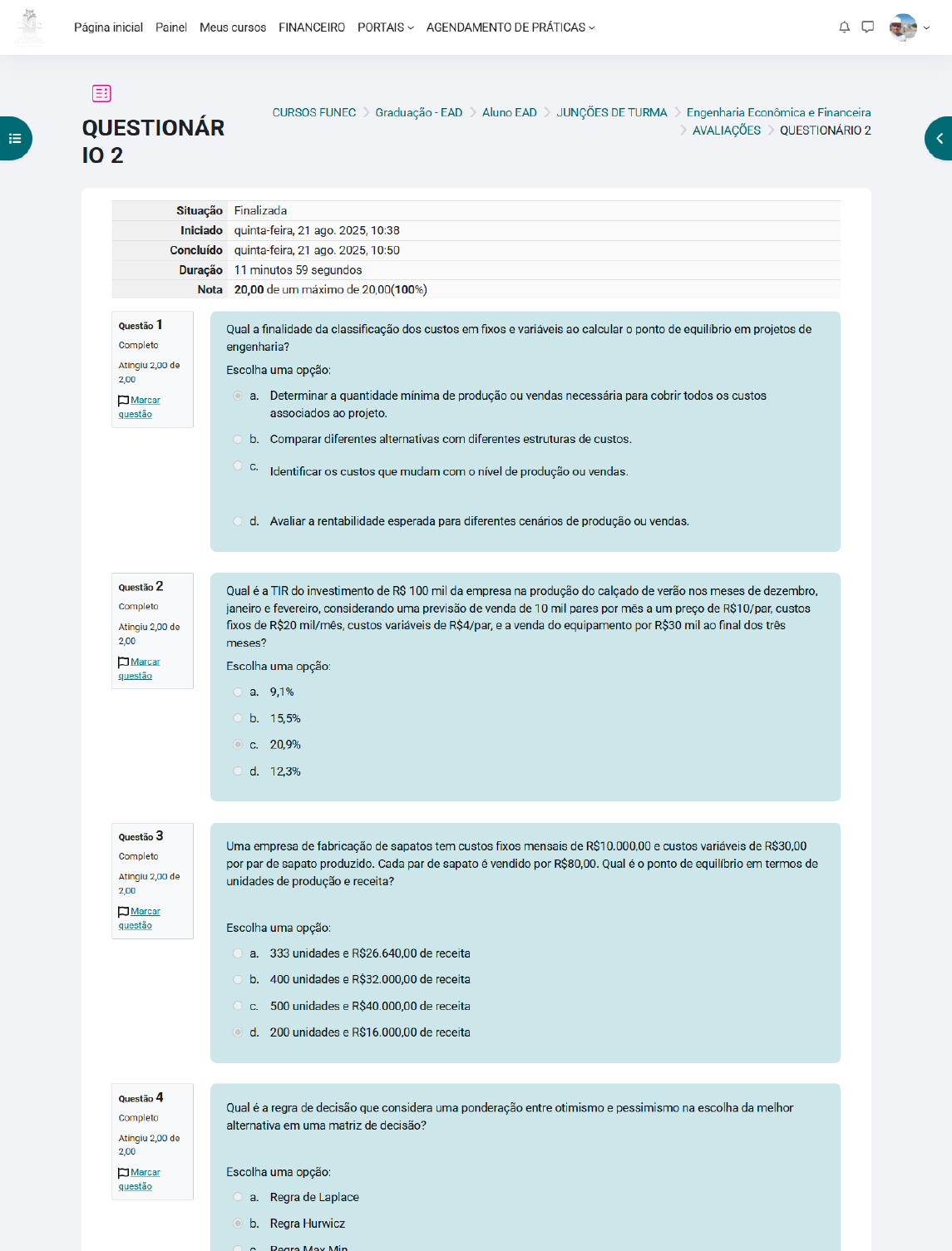 Página inicial Painel Meus cursos FINANCEIRO PORTAIS AGENDAMENTO DE PRÁTICAS CURSOS FUNEC Graduação EAD Aluno EAD JUNÇÕES DE TURMA Engenharia Econômica e Financeira QUESTIONÁR AVALIAÇÕES QUESTIONÁRIO 2 IO 2 Situação Finalizada Iniciado quinta-feira, 21 ago. 2025, 10:38 Concluído quinta-feira, 21 ago. 2025, 10:50 Duração 11 minutos 59 segundos Nota 20,00 de um máximo de 20,00(100%) Questão 1 Qual a finalidade da classificação dos custos em fixos e variáveis ao calcular o ponto de equilíbrio em projetos de Completo engenharia? Atingiu 2,00 de Escolha uma opção: 2,00 Marcar a. Determinar a quantidade mínima de produção ou vendas necessária para cobrir todos os custos questão associados ao projeto. b. Comparar diferentes alternativas com diferentes estruturas de custos. Identificar os custos que mudam com nível de produção ou vendas. d. Avaliar a rentabilidade esperada para diferentes cenários de produção ou vendas. Questão 2 Qual é a TIR do investimento de R$ 100 mil da empresa na produção do calçado de verão nos meses de dezembro, Completo janeiro e fevereiro, considerando uma previsão de venda de 10 mil pares por mês a um preço de R$10/par, custos Atingiu 2,00 de fixos de R$20 mil/mês, custos variáveis de R$4/par, e a venda do equipamento por R$30 mil ao final dos três 2,00 meses? Marcar Escolha uma opção: questão a. 9,1% b. 15,5% C. 20,9% d. 12,3% Questão 3 Uma empresa de fabricação de sapatos tem custos fixos mensais de R$10.000,00 e custos variáveis de R$30,00 Completo por par de sapato produzido. Cada par de sapato é vendido por R$80,00. Qual é o ponto de equilíbrio em termos de Atingiu 2,00 de unidades de produção e receita? 2,00 Marcar questão Escolha uma opção: a. 333 unidades e R$26.640,00 de receita b. 400 unidades e R$32.000,00 de receita C. 500 unidades e R$40.000,00 de receita d. 200 unidades e R$16.000,00 de receita Questão 4 Qual é a regra de decisão que considera uma ponderação entre otimismo e pessimismo na escolha da melhor Completo alternativa em uma matriz de decisão? Atingiu 2,00 de 2,00 Marcar Escolha uma opção: questão a. Regra de Laplace b. Regra Hurwicz May Mind. Regra Max Max Questão 5 Qual é a diferença entre incerteza e risco? Completo Atingiu 2,00 de 2,00 Escolha uma opção: Marcar a. Incerteza e risco são sinônimos e, portanto, não há diferença entre eles. questão b. Incerteza se refere à ausência de certeza ou a imprevisibilidade em relação ao futuro, enquanto risco é a possibilidade de que algo negativo aconteça no futuro, mesmo que não se saiba exatamente que vai acontecer. C. Incerteza é a possibilidade de variação dos possíveis valores que uma determinada variável possa assumir no futuro, enquanto risco é a impossibilidade de prever valor futuro dessa variável. d. Incerteza se refere à possibilidade de perda financeira ou de outro tipo de impacto negativo decorrente de um evento futuro incerto, enquanto risco se refere à falta de conhecimento ou informação sobre um evento ou resultado futuro. Questão 6 Qual é a finalidade da análise de custo-benefício na engenharia econômica e financeira? Completo Atingiu 2,00 de 2,00 Escolha uma opção: Marcar a. Identificar as tendências do mercado e as preferências dos clientes. questão b. Comparar número de funcionários necessários para implementar um projeto. Determinar se um projeto é viável financeiramente e deve ser implementado. d. Analisar a qualidade dos produtos ou serviços oferecidos pela empresa. Questão 7 Uma empresa de engenharia está pensando em desenvolver um novo produto e precisa escolher entre dois tipos de Completo projeto: projeto A e projeto A seguir, é apresentada uma matriz de decisão que representa as possíveis Atingiu 2,00 de consequências de cada ação. 2,00 Marcar Projeto A Projeto questão Custo de desenvolvimento (em milhões de reais) R$ 10 R$ Probabilidade de sucesso 60% 90% Receita esperada (em milhões de reais) se projeto for bem-sucedido R$ 15 Se a empresa de engenharia escolher um coeficiente de pessimismo de 0,7, qual dos seguintes projetos é a melhor escolha, de acordo com a regra Hurwicz? Escolha uma opção: a. Não há informações suficientes para decidir b. Projeto C. Ambos os projetos têm mesmo resultado esperado d. Projeto A Questão 8 Qual a diferença entre custos e despesas em uma empresa? Completo Atingiu 2,00 de 2,00 Escolha uma opção: Marcar a. Custos se referem a gastos diretos na produção ou aquisição de produtos ou serviços, enquanto despesas questão são gastos indiretos relacionados à gestão administrativa da empresa. b. Custos e despesas se referem exclusivamente a gastos relacionados à gestão administrativa da empresa. C. Custos e despesas são sinônimos e se referem a qualquer gasto da empresa. d. Custos se referem a gastos administrativos enquanto despesas estão relacionadas à ouaquisição de produtos ou serviços. Questão 9 Qual a diferença entre Capex e no custo de investimento? Completo Atingiu 2,00 de 2,00 Escolha uma opção: Marcar a. Capex se refere aos gastos associados à aquisição de ativos fixos, enquanto se refere aos gastos questão operacionais regulares da empresa. b. Capex se refere aos gastos operacionais regulares da empresa, enquanto se refere aos gastos associados à aquisição de ativos fixos. C. Capex se refere aos gastos de curto prazo necessários para adquirir ativos fixos, enquanto representa os gastos de longo prazo necessários para manter as operações da empresa em andamento. d. Capex se refere aos gastos operacionais necessários para manter as operações da empresa em andamento, enquanto se refere aos gastos associados à aquisição de ativos intangíveis Questão 10 Uma empresa de construção civil está avaliando a viabilidade financeira de um projeto de construção de casas Completo populares. Os custos fixos totais do projeto são de 520.000,00, e os custos variáveis por unida